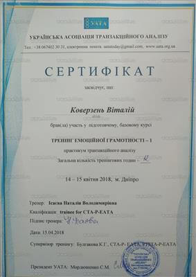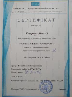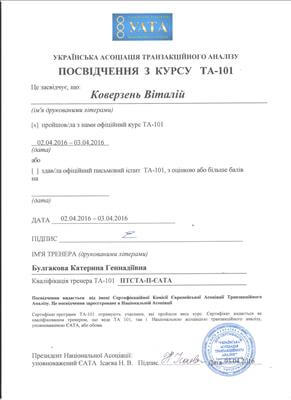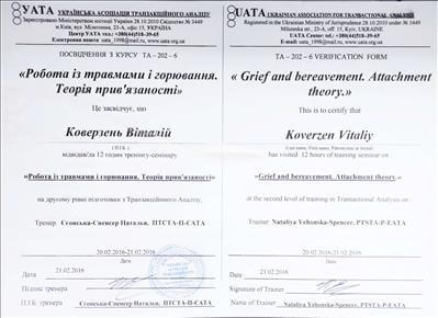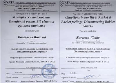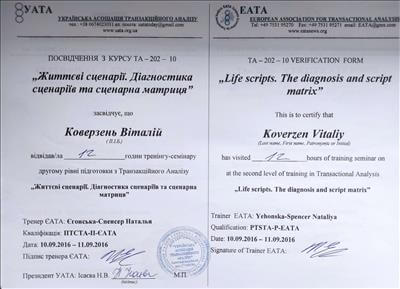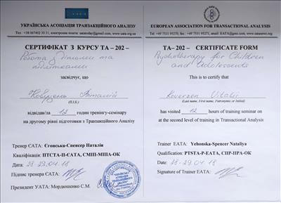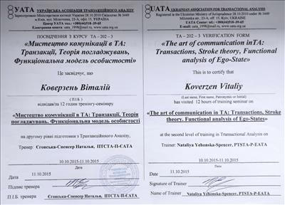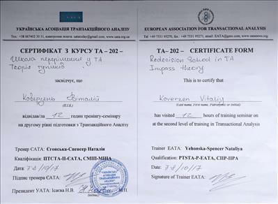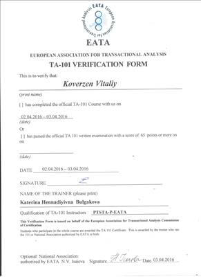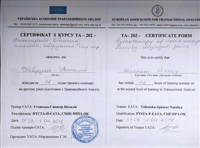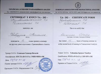-Українська та Європейська Асоціація Транзактного Аналізу, психотерапевт у методі транзактного аналізу.