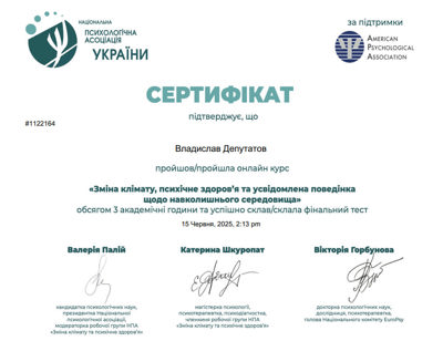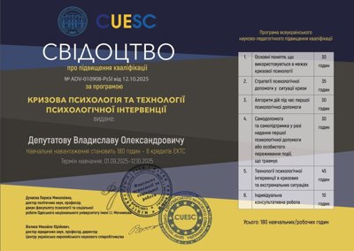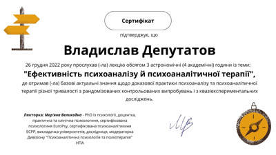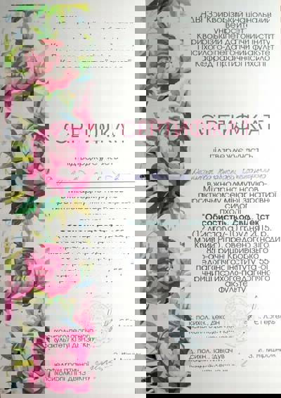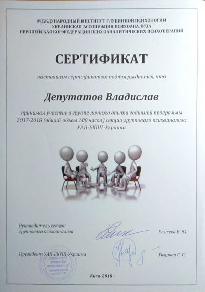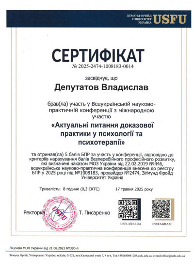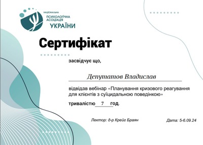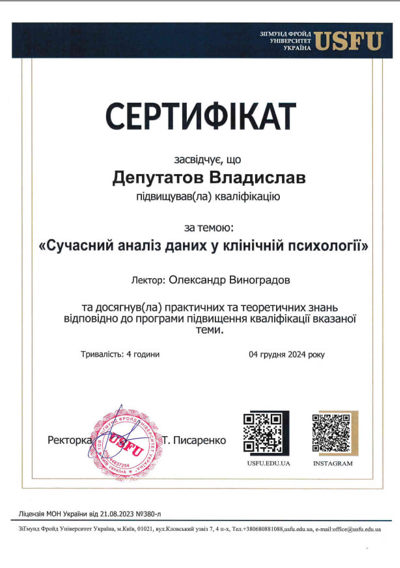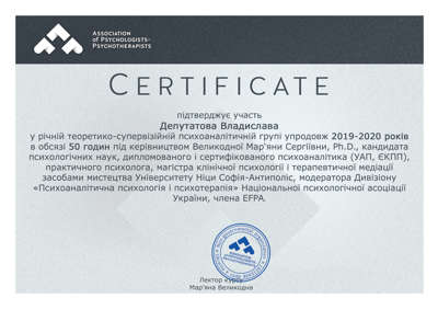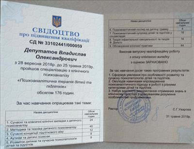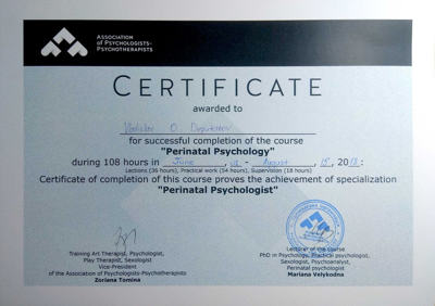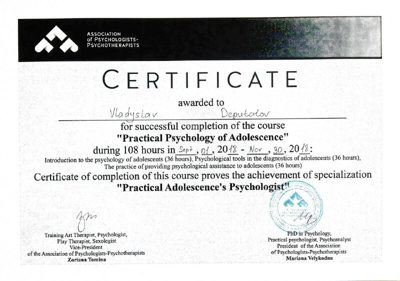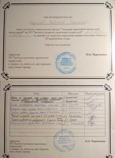 Сертифікати про проходження додаткового навчання можете побачити у цьому профілі. Основні: когнітивно-поведінкова терапія, психоаналітична терапія дітей та підлітків.
