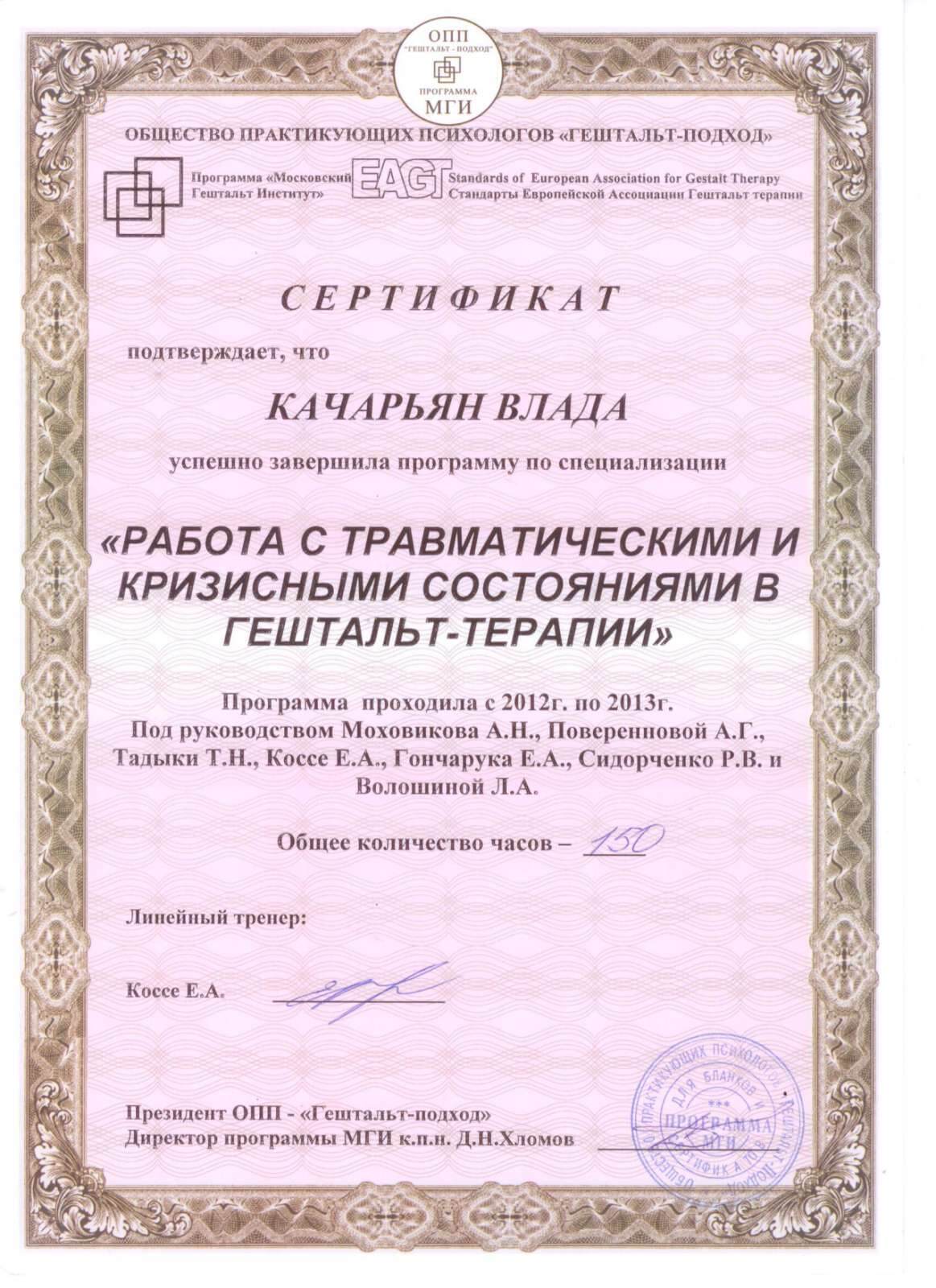 Московський Гештальт інститут 2010-2015), сертифікувалась