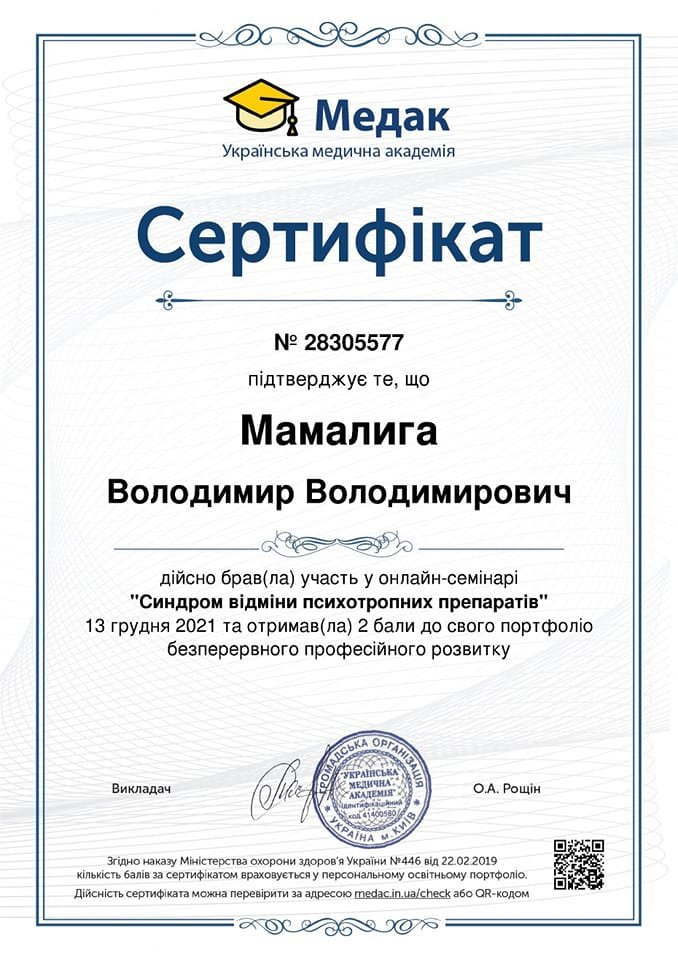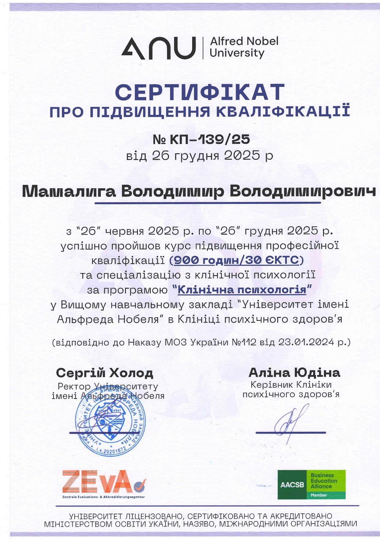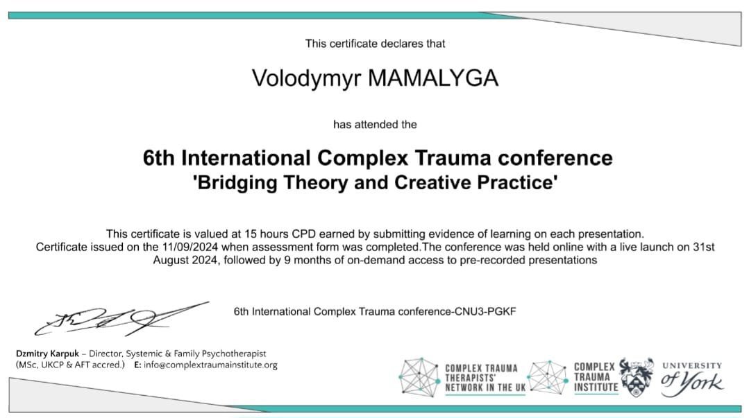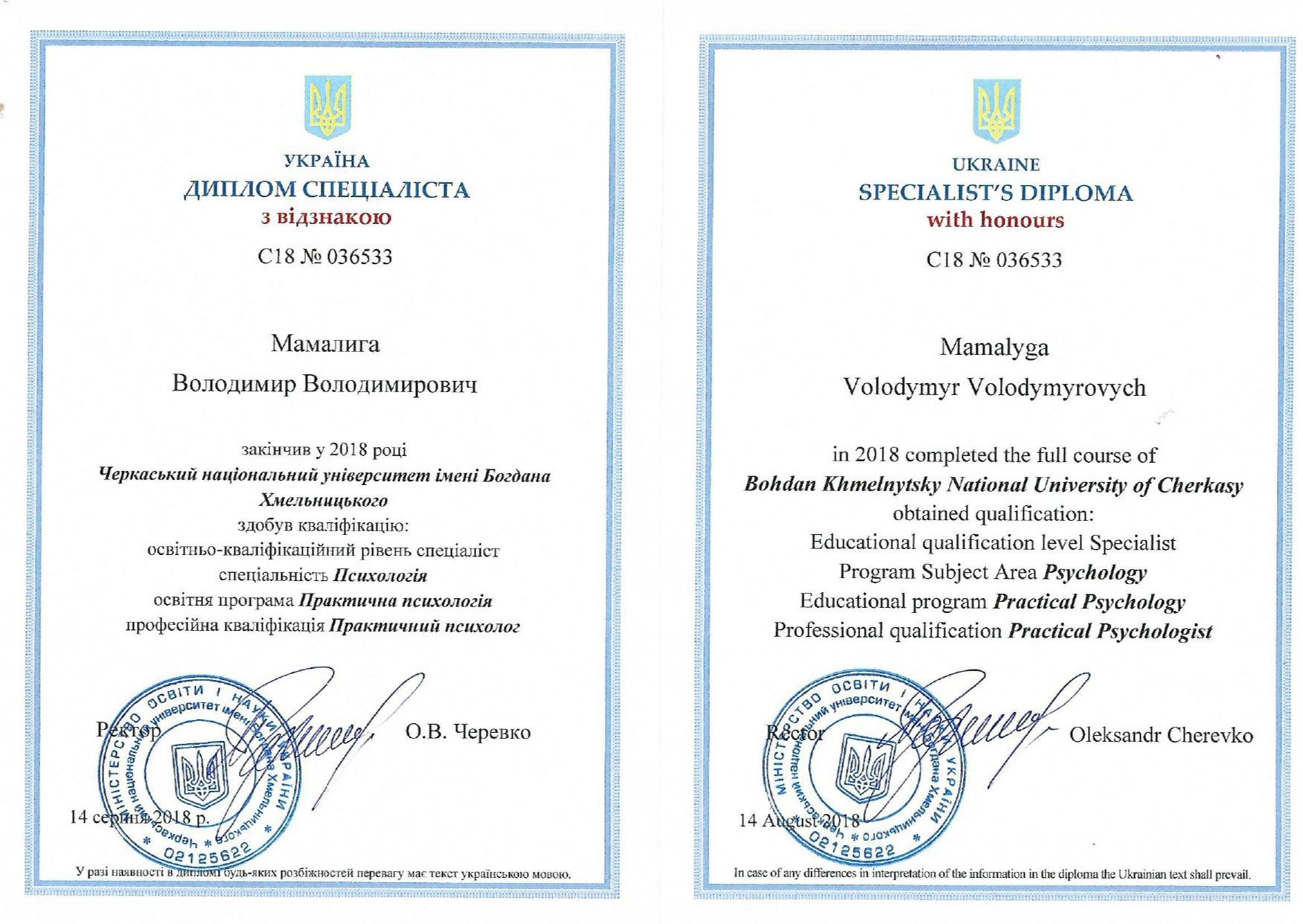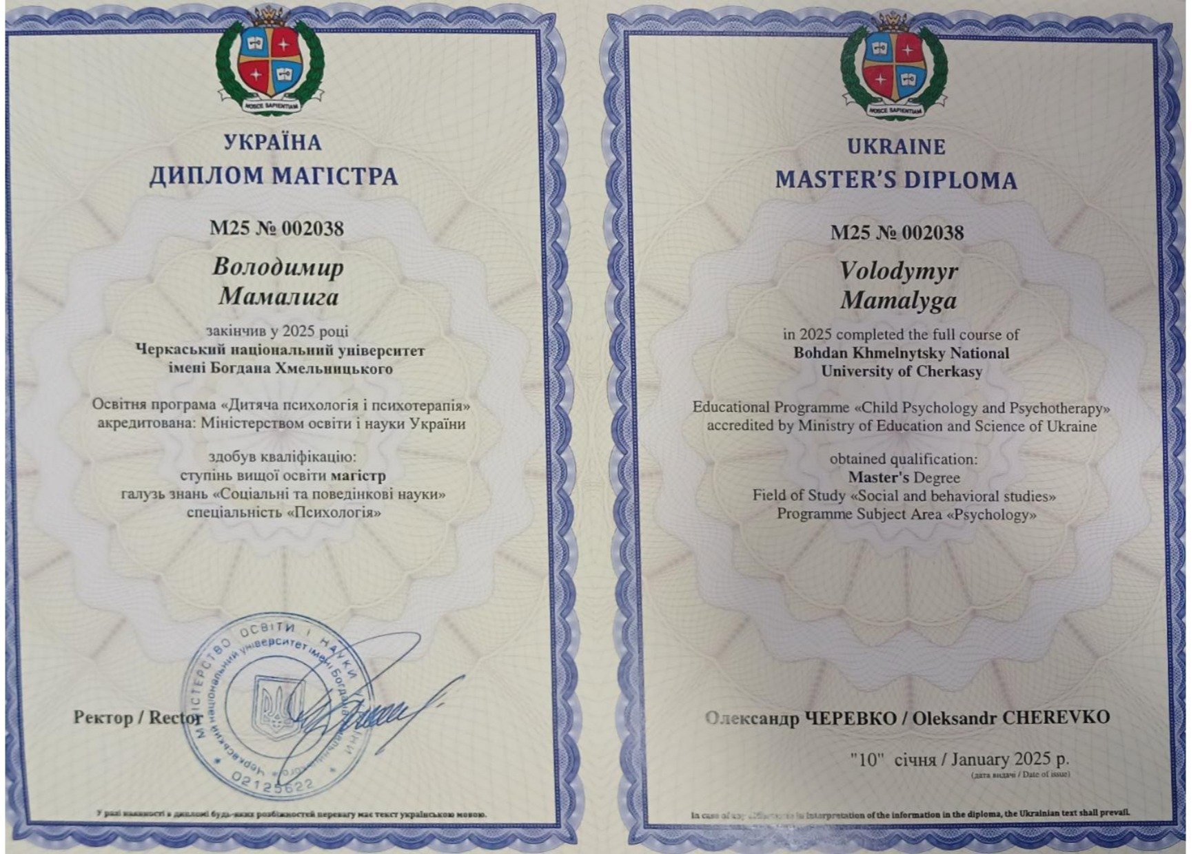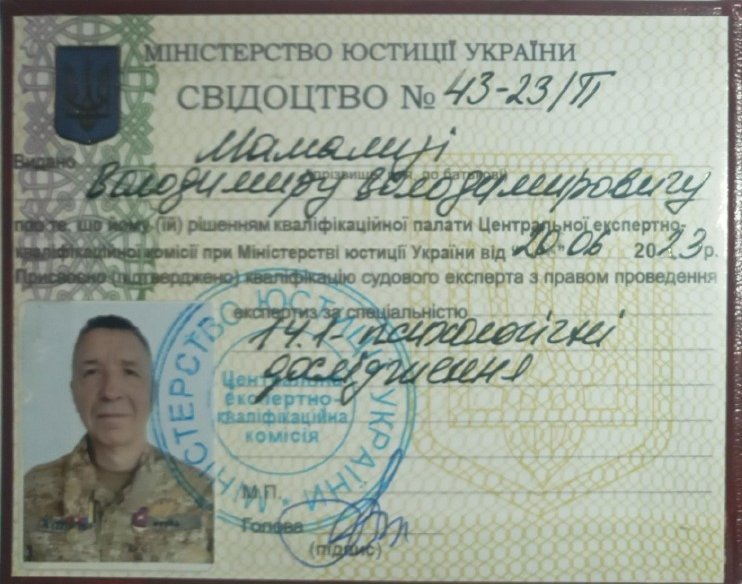 Мамалига Володимир Володимирович, освіта Черкаський національний університет ім. Богдана Хмельницького, 2004 рік, спеціаліст, історик, диплом ЕР 23669622; Черкаський національний університет ім. Богдана Хмельницького, 2018 рік, спеціаліст, практичний психолог, диплом з відзнакою С18 039533; Черкаський національний університет ім. Богдана Хмельницького, 2025 рік, ОП “Дитяча психологія і психотерапія” (освітня кваліфікація - магістр психології), диплом М25 002038. Теоретико-практичний курс “СЕКСОЛОГІЯ”, сертифікат підвищення кваліфікації 1104-25, Університет “КРОК”, 10 кредитів ECTS, 2025 рік. Курс підвищення професійної кваліфікації “КЛІНІЧНА ПСИХОЛОГІЯ ”, сертифікат підвищення кваліфікації КП-139/25 від 26.12.2025 року. Університет Альфреда Нобеля. Має стаж експертної роботи з 2023 року, свідоцтво № 43-23/П, дійсне безстроково, видане на підставі рішення №2 від 20.06.2023 року Центральної експертно-кваліфікаційної комісії при Міністерстві юстиції України.