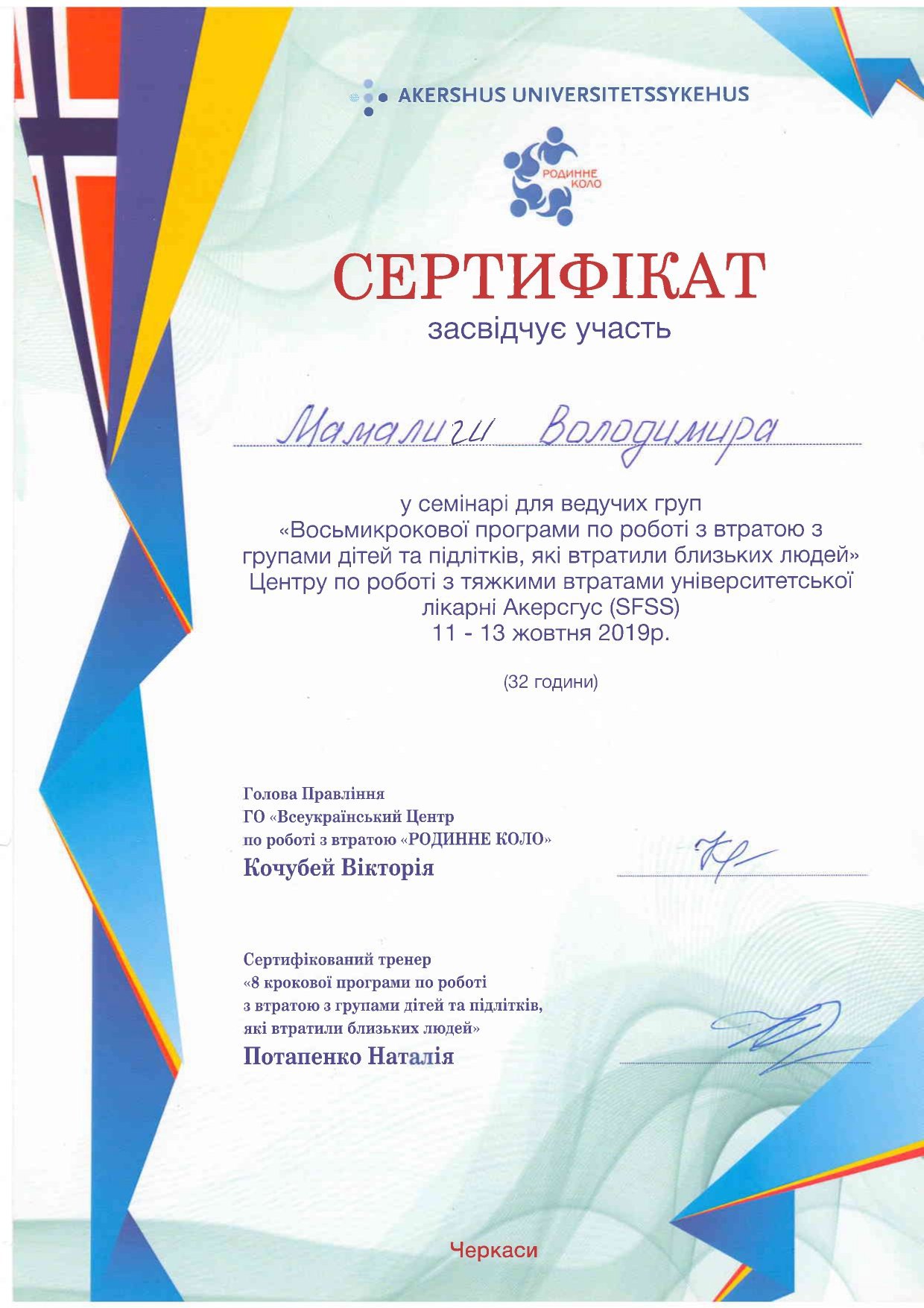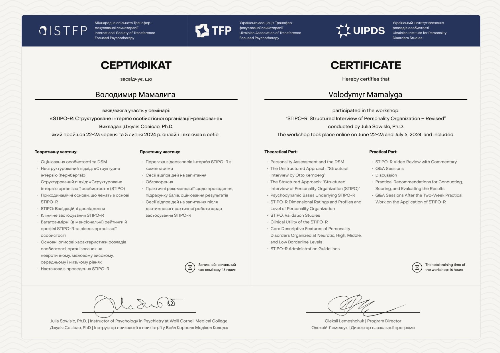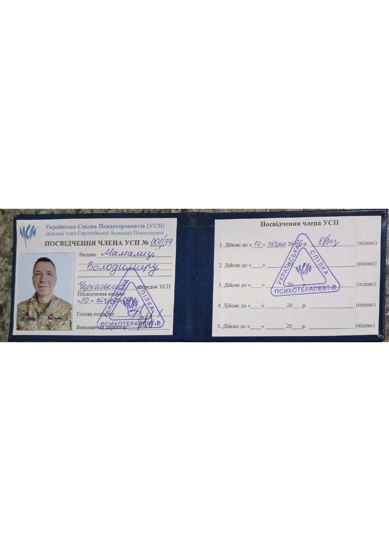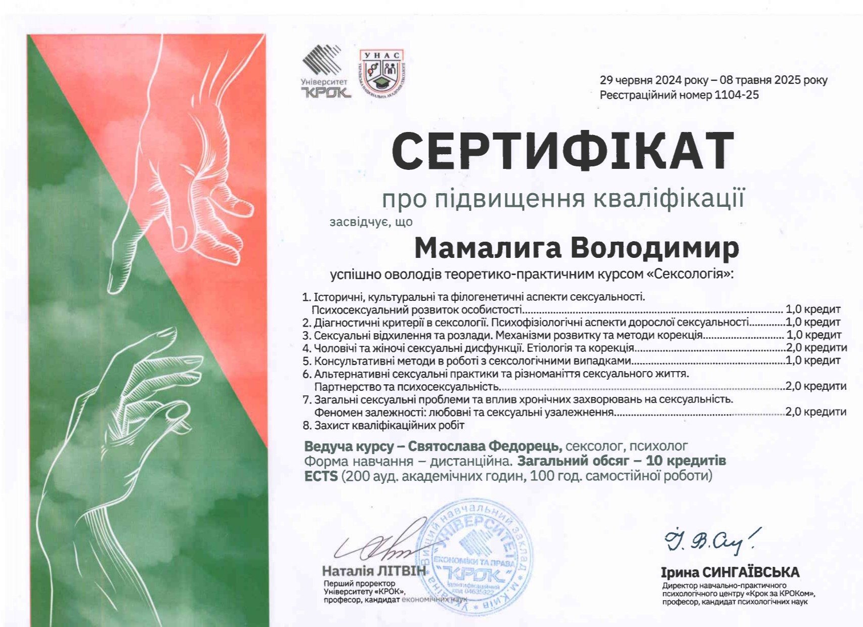 Мамалига Володимир Володимирович, освіта Черкаський національний університет ім. Богдана Хмельницького, 2004 рік, спеціаліст, історик, диплом ЕР 23669622; Черкаський національний університет ім. Богдана Хмельницького, 2018 рік, спеціаліст, практичний психолог, диплом з відзнакою С18 039533; Черкаський національний університет ім. Богдана Хмельницького, 2025 рік, ОП “Дитяча психологія і психотерапія” (освітня кваліфікація - магістр психології), диплом М25 002038. Теоретико-практичний курс “СЕКСОЛОГІЯ”, сертифікат підвищення кваліфікації 1104-25, Університет “КРОК”, 10 кредитів ECTS, 2025 рік. Курс підвищення професійної кваліфікації “КЛІНІЧНА ПСИХОЛОГІЯ ”, сертифікат підвищення кваліфікації КП-139/25 від 26.12.2025 року. Університет Альфреда Нобеля. Має стаж експертної роботи з 2023 року, свідоцтво № 43-23/П, дійсне безстроково, видане на підставі рішення №2 від 20.06.2023 року Центральної експертно-кваліфікаційної комісії при Міністерстві юстиції України.