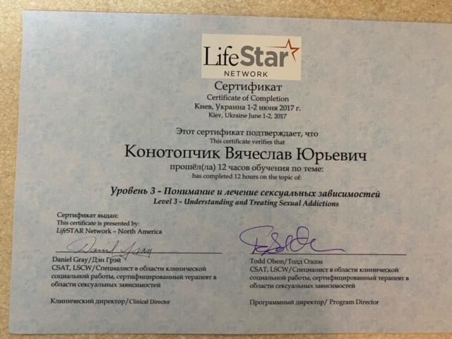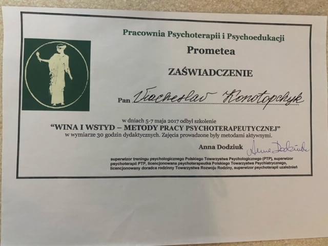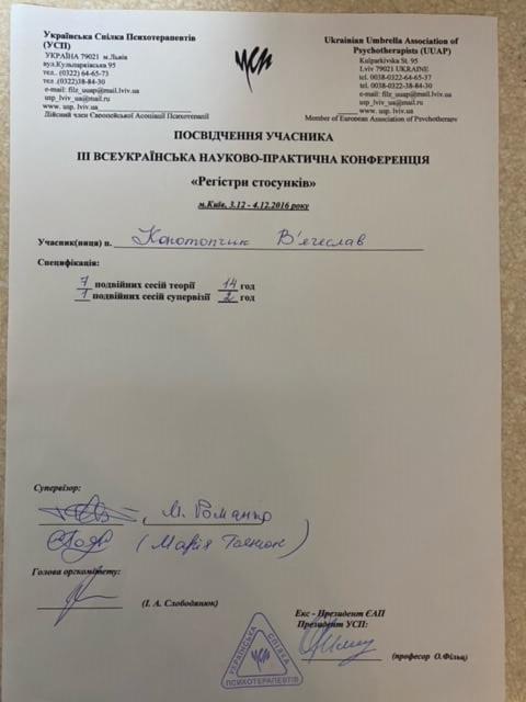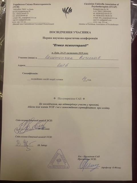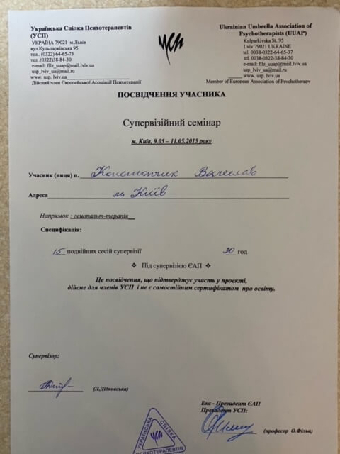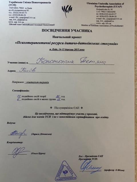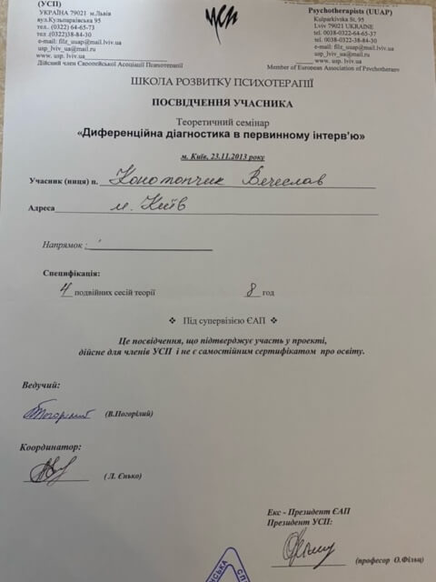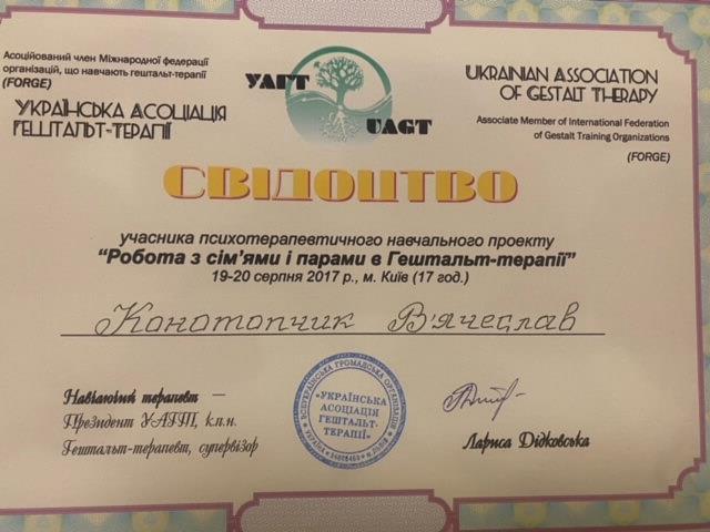 Український Психотерапевтичний Університет за напрямом «Гештальт-терапія» 2012 року.
