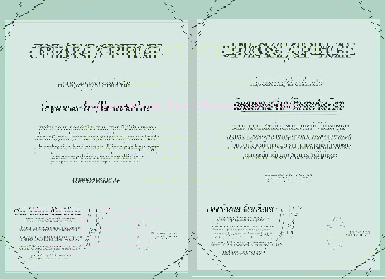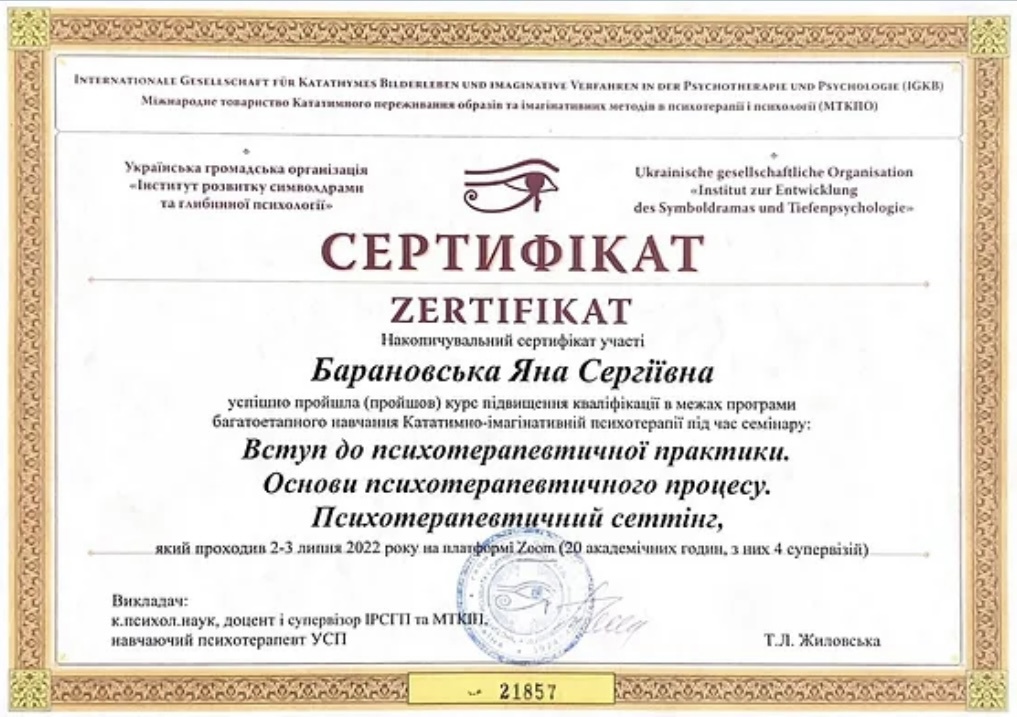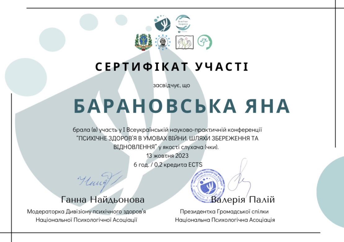 Я є членом Національної Психологічної Асоціації України, досвід приватної практики 2 роки, провела більше ніж 700 сесій. Знаходжусь в постійному професійному зростанні, регулярно відвідую конференції, маю досвід особистої терапії понад 300 годин, працюю під супервізією та вдосконалюю свої навички у нових психотерапевтичних підходах.