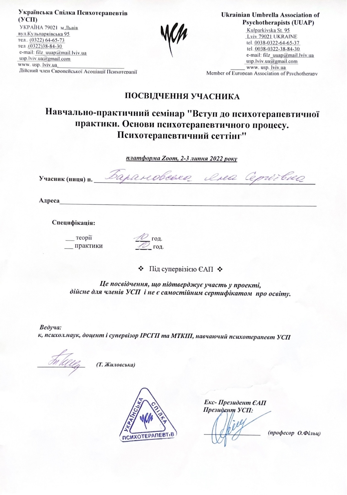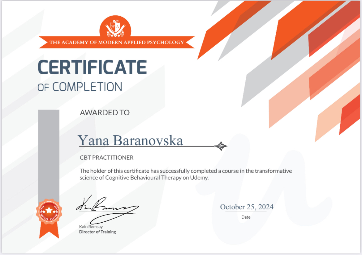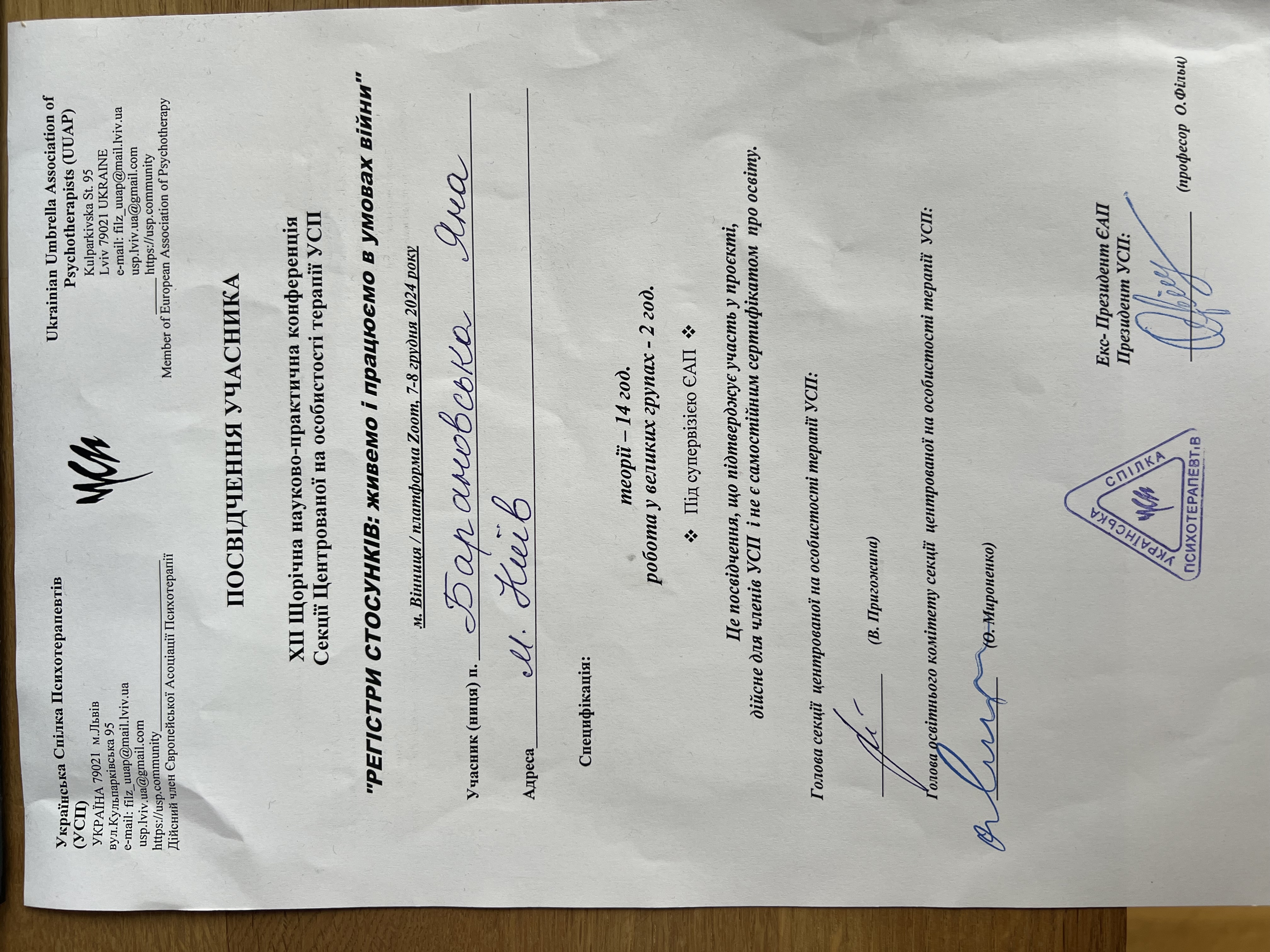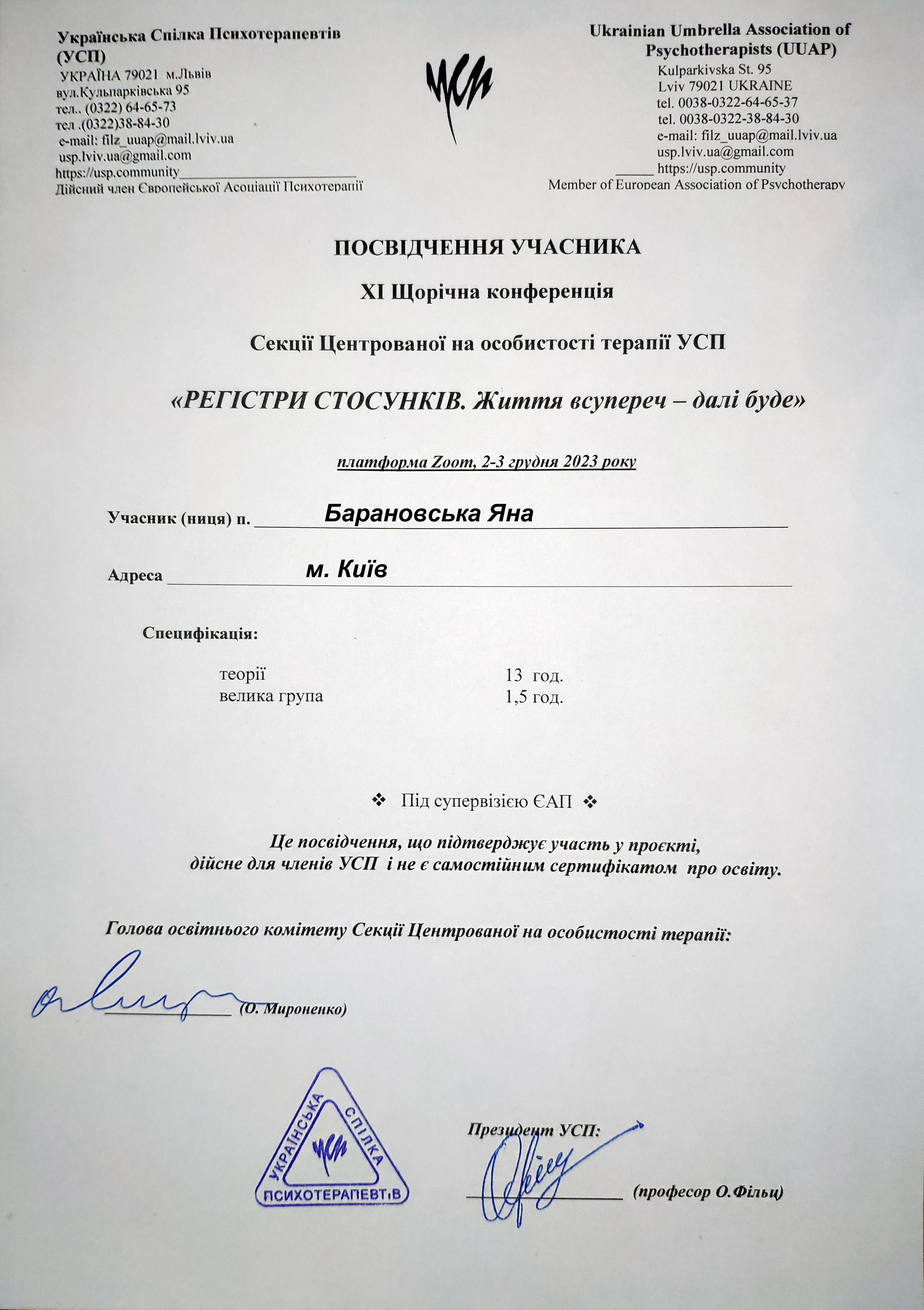 Здобуваю психотерапевтичну освіту у Українському Психотерапевтичному Університеті (УПУ) на центрованій на особистості терапії. Цей підхід акцентований на глибокому та щирому контакті між терапевтом та клієнтом, завдяки ефективній взаємодії, клієнт отримує бажаний результат спільної роботи.