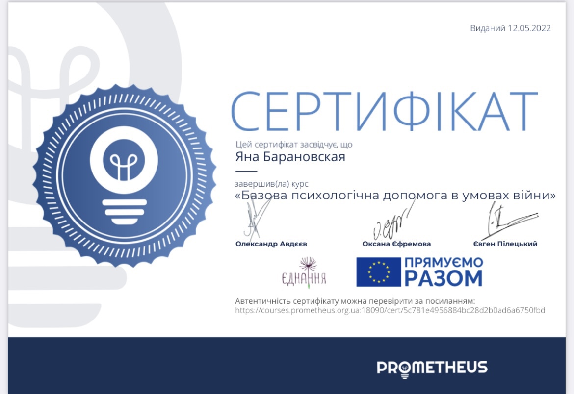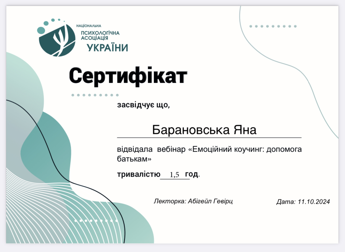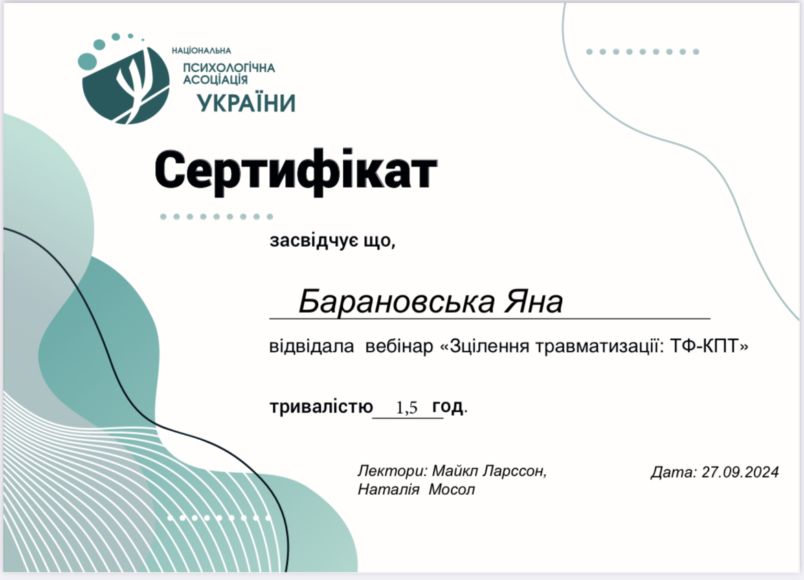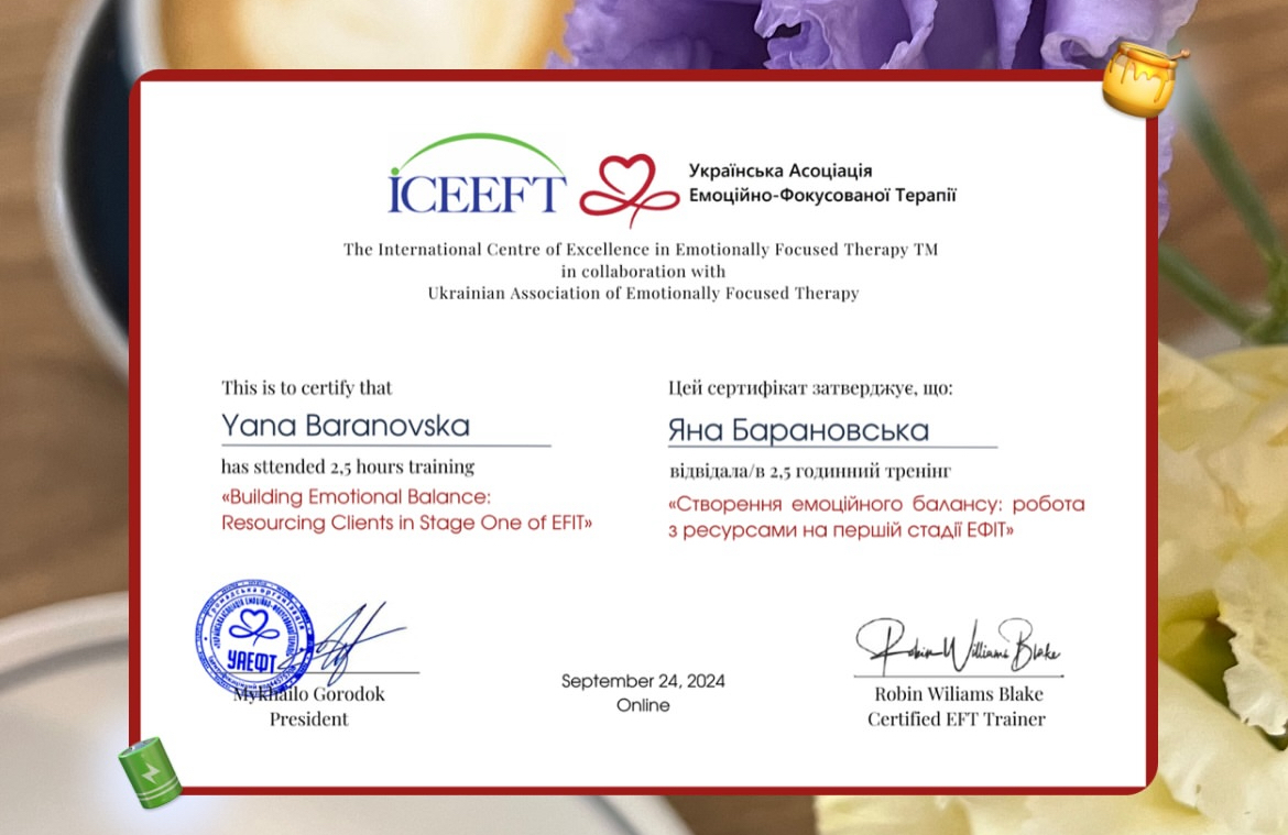 А також використовую інструменти інших підходів, зокрема емоційно-фокусованої терапії та когнітивно-поведінкової терапії (маю рівень консультанта).