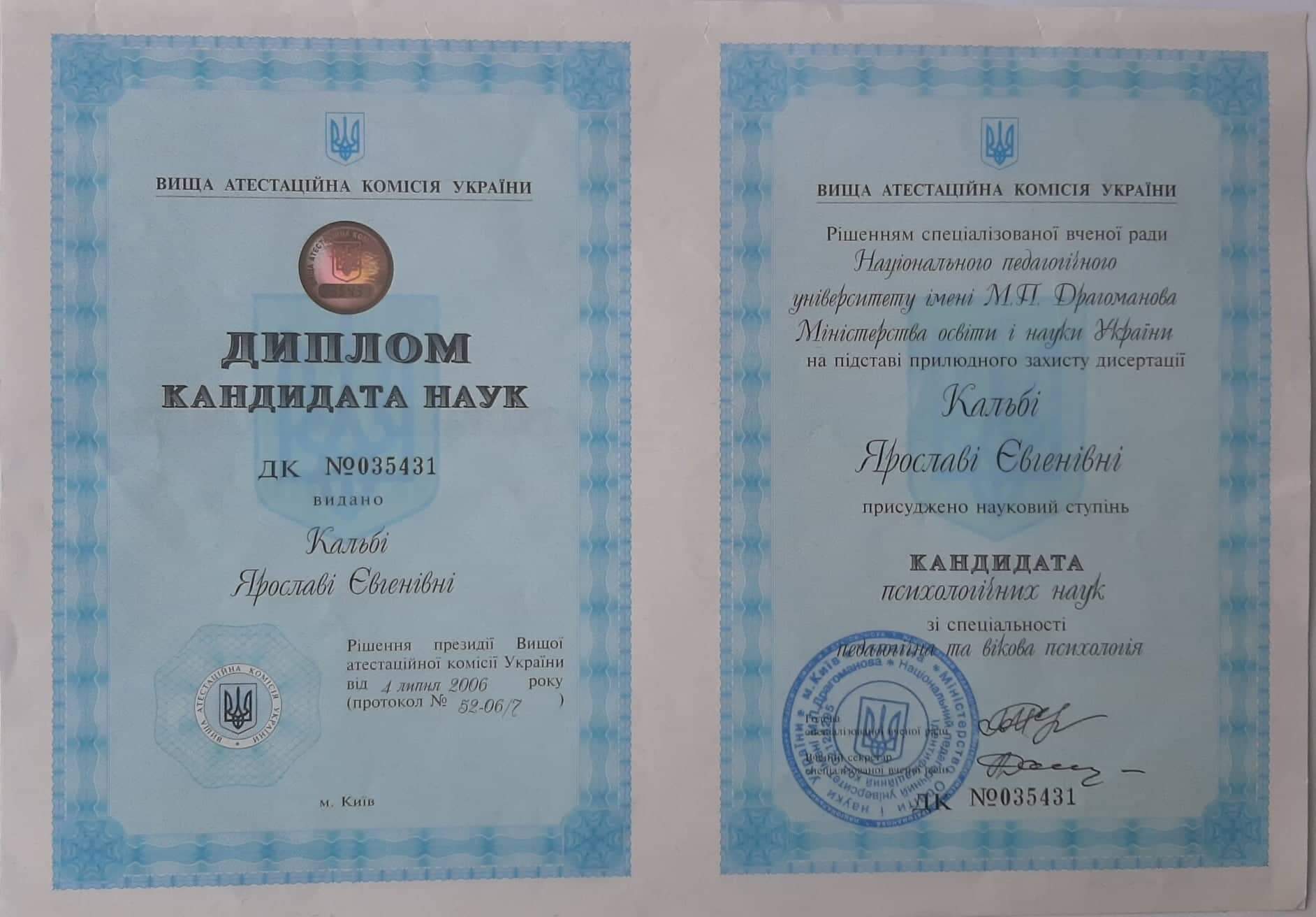 Базова профільна освіта – практичний психолог ТНПУ 2000р. PhD кандидат психологічних наук 2006 р., навчалася в Українському гештальтному інституті, спеціалізація робота з дітьми і сім'єю. Sandplay-терапія у роботі дитячого психотерапевта УСП. Член Всеукраїнської спілки психологів, що практикують гештальт-підхід.