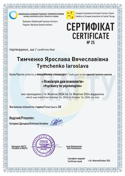Є дійсним членам Національної Асоціації Гештальт-терапевтів України(НАГТУ).