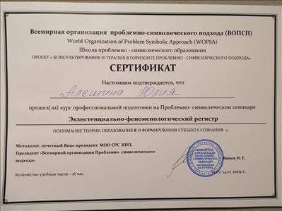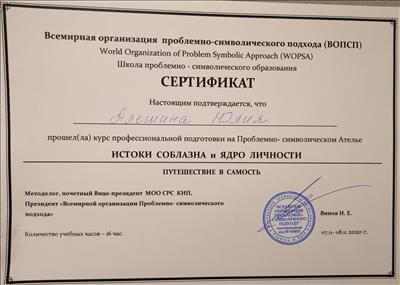 Я консультуючий дипломований психолог, працюю в обрії проблемно-символічного підходу. Постійно розвиваюся та підвищую свій професійний рівень шляхом проходження навчальних семінарів. Понад 200 годин особистої терапії. Працюю під супервізією аналітика-методолога.