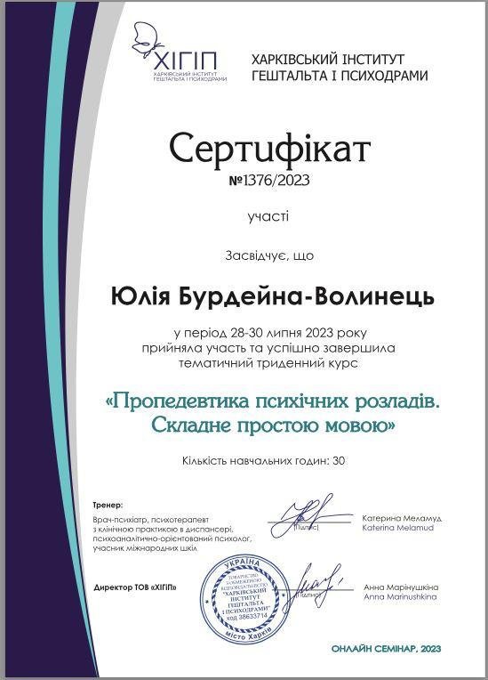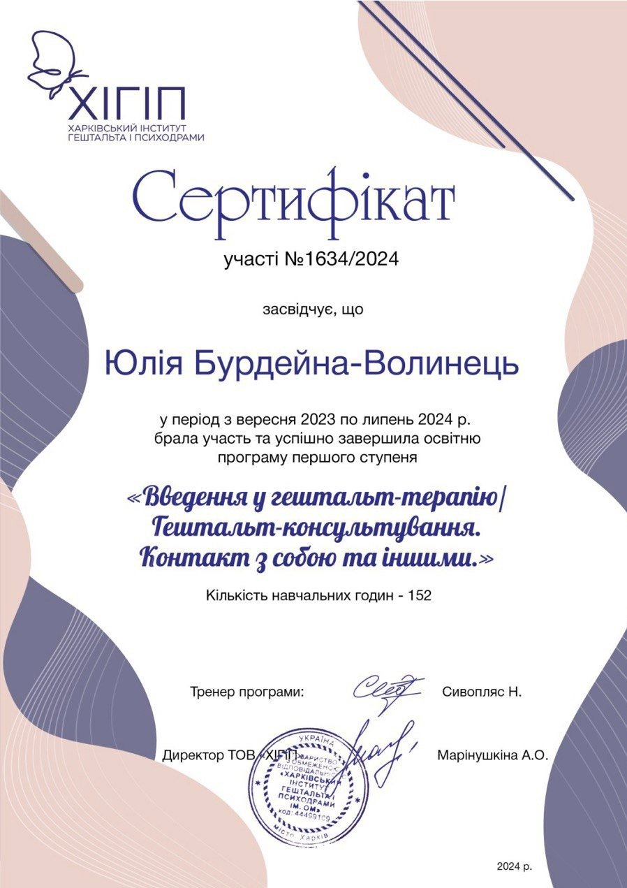 Працюю з травматичним досвідом, тривогою та депресивними станами. Добре розумію, як це — жити у постійній напрузі, втрачати відчуття безпеки, себе або сенсу. У роботі я не тисну і не оцінюю — натомість створюю простір, де можна бути справжнім і поступово розбирати навіть складні речі.