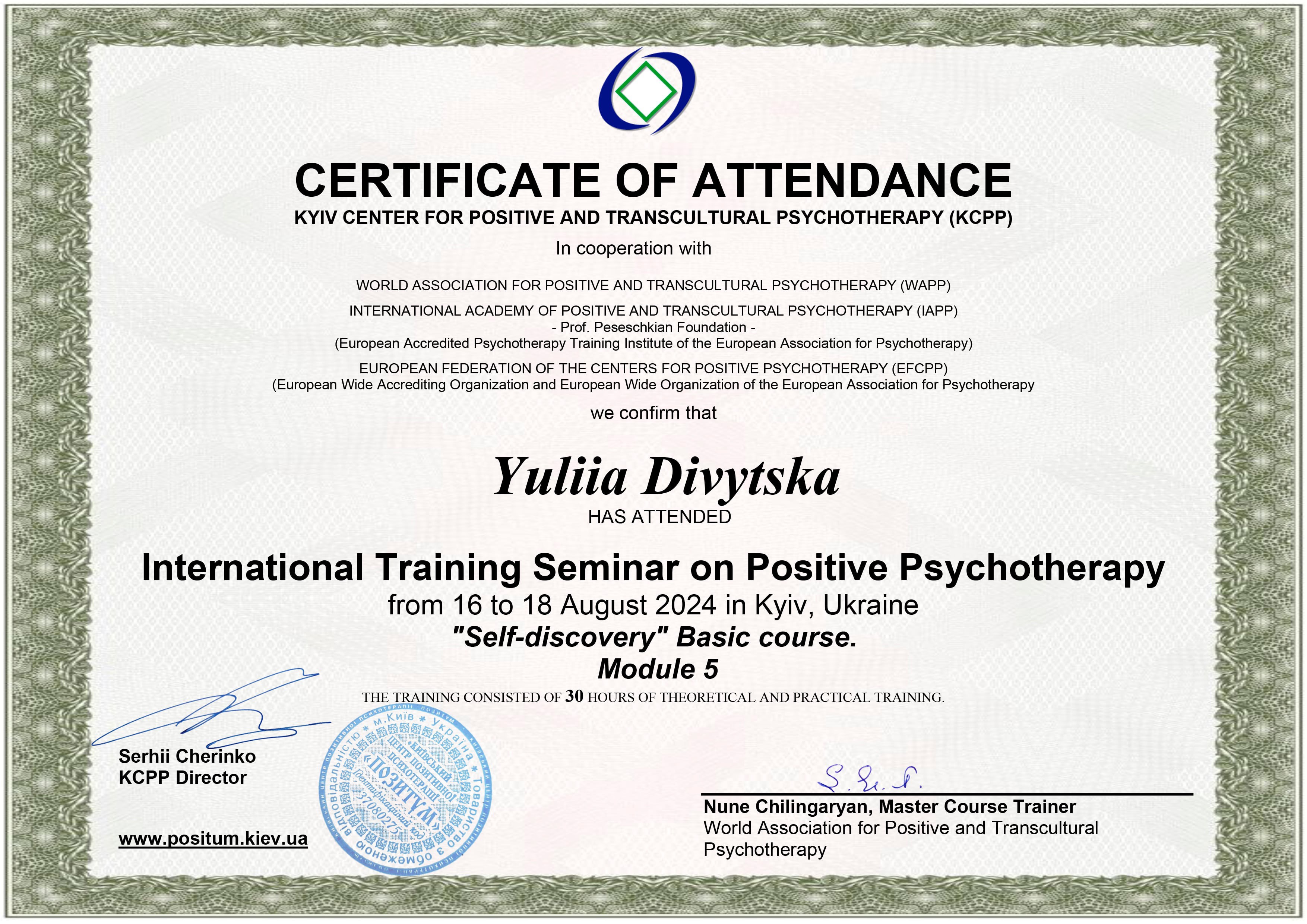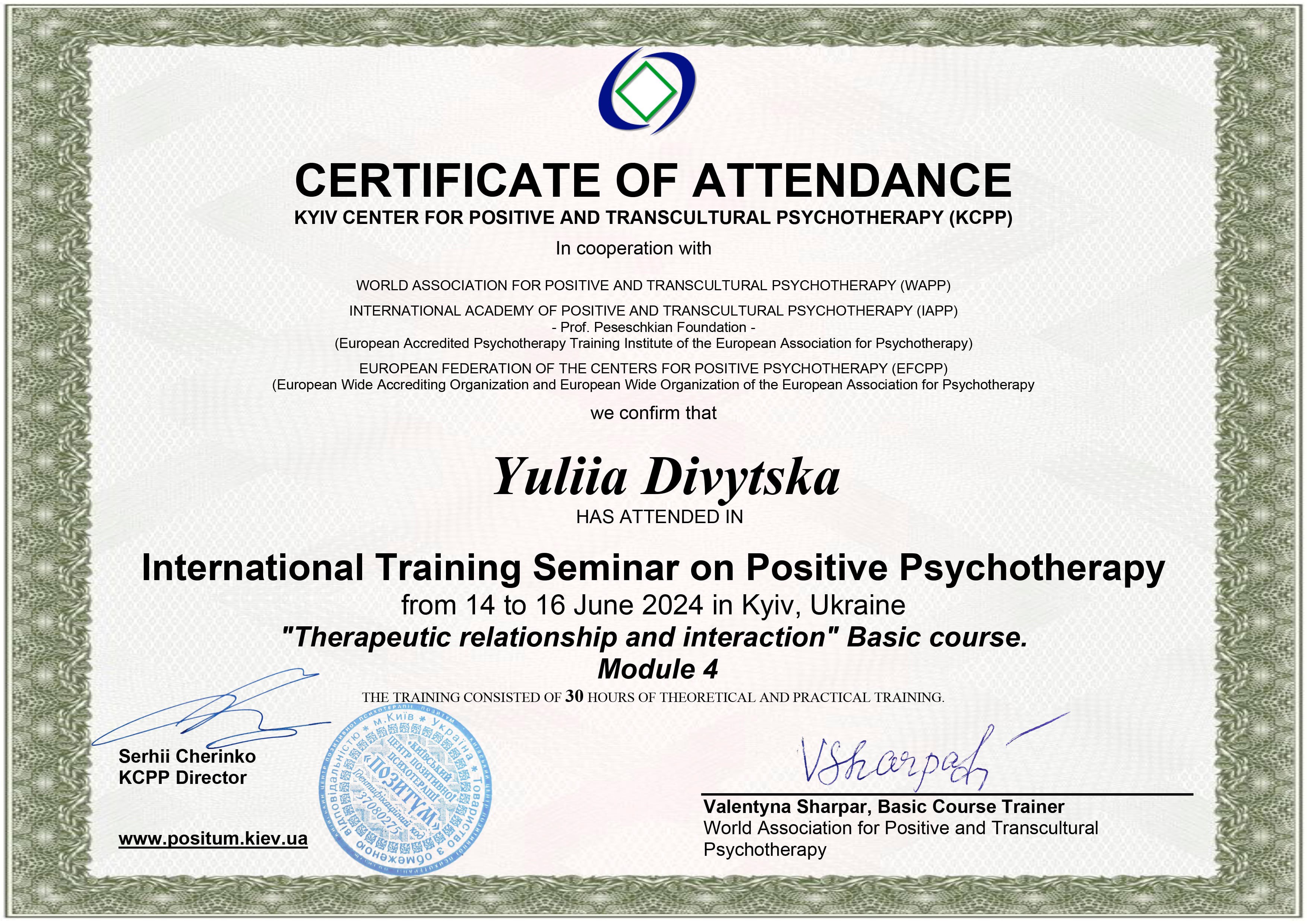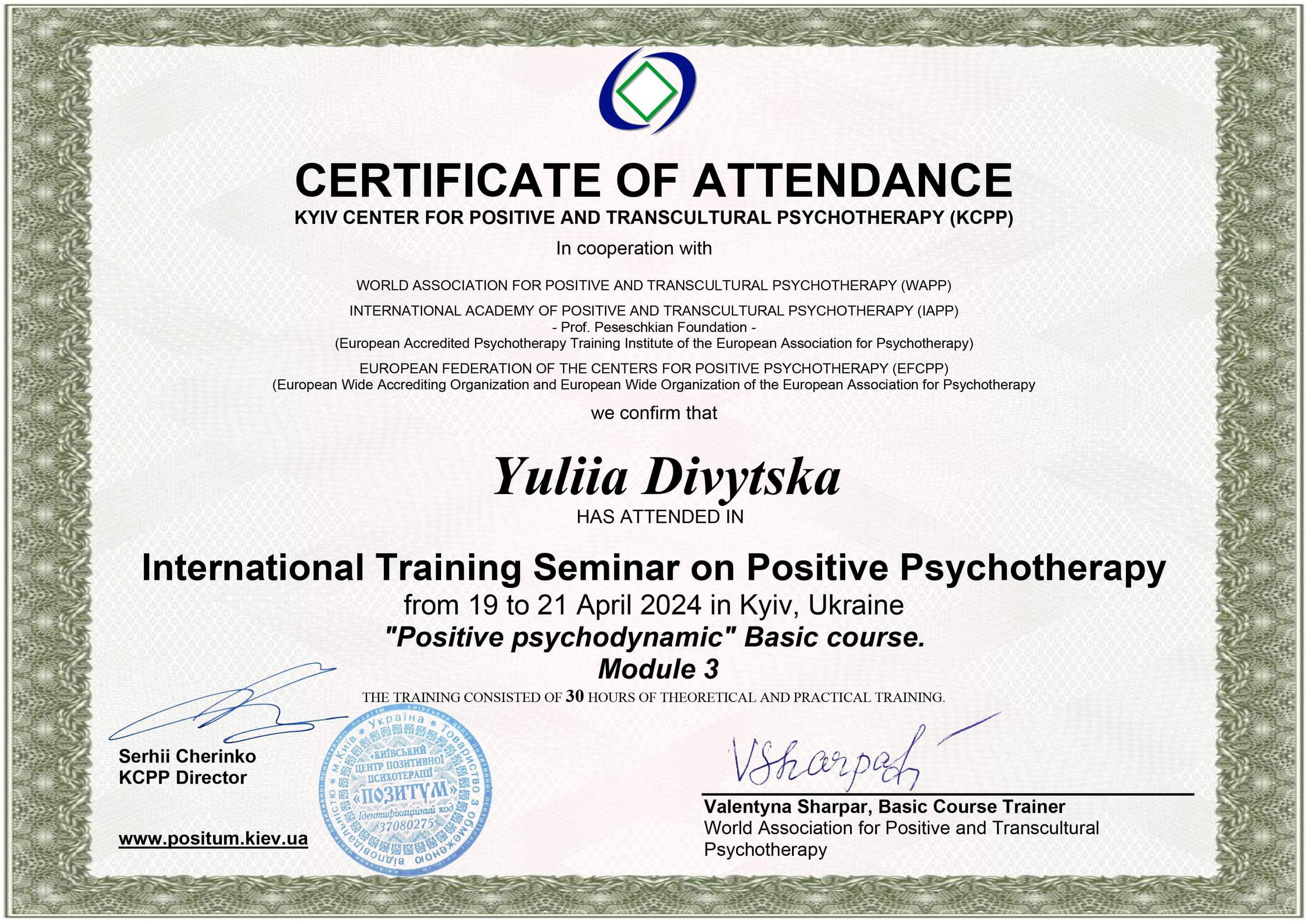Закінчила базовий курс в Київському центрі Позитивної Психотерапії.