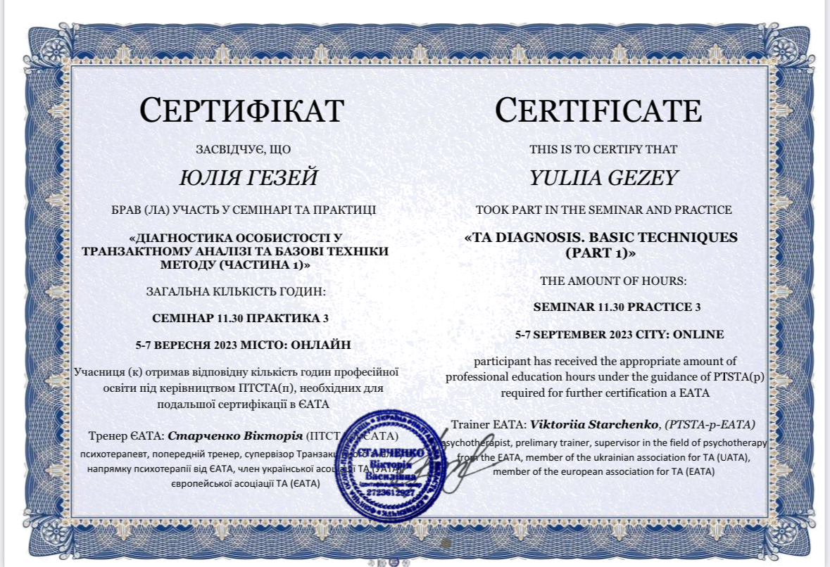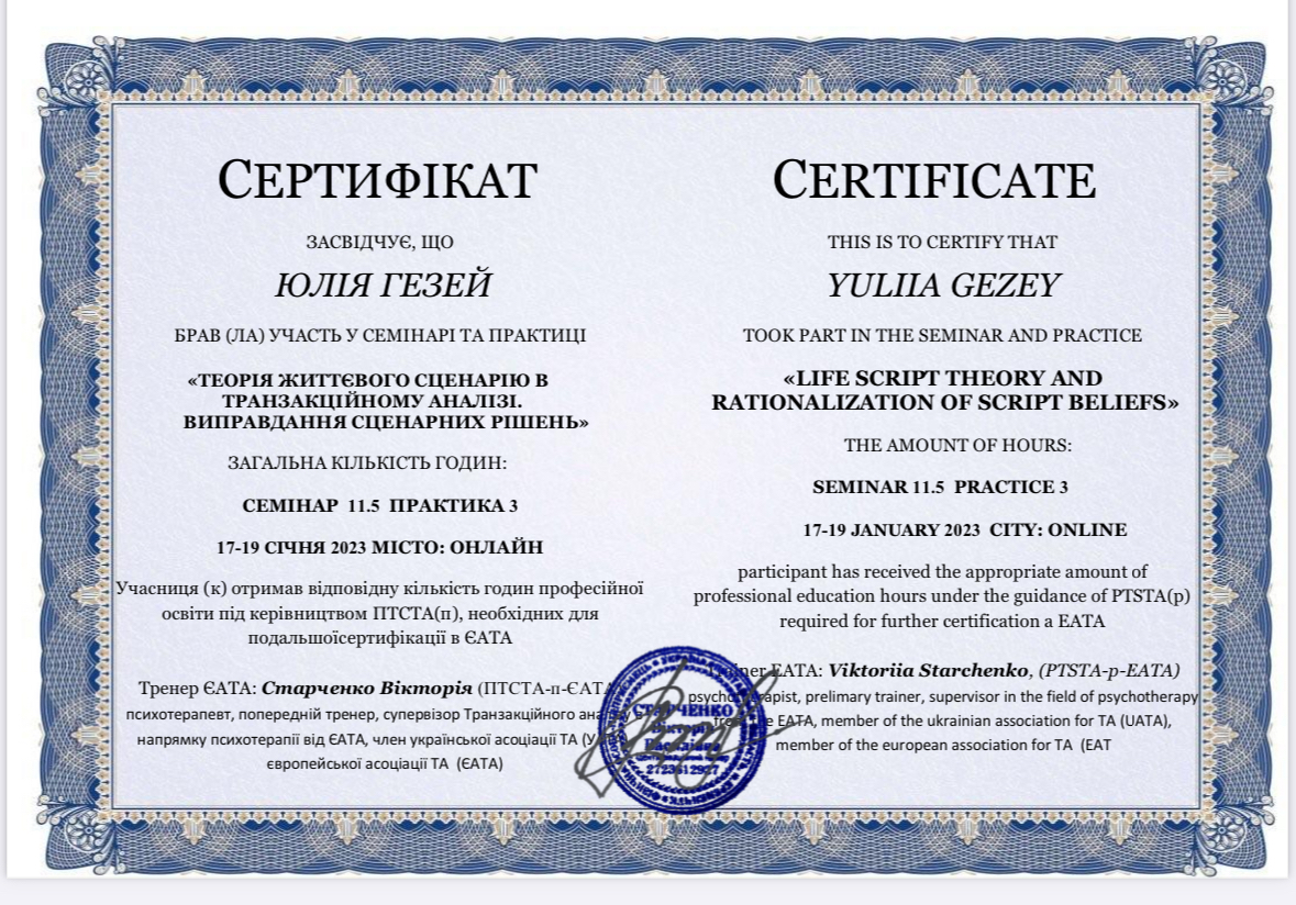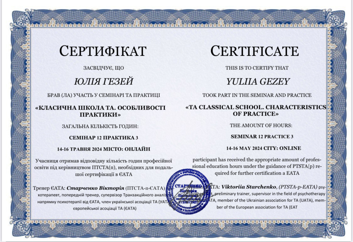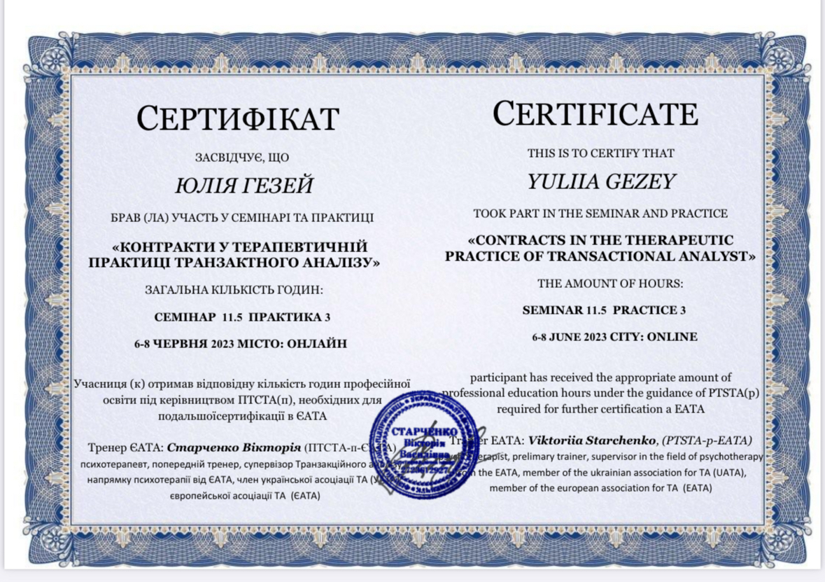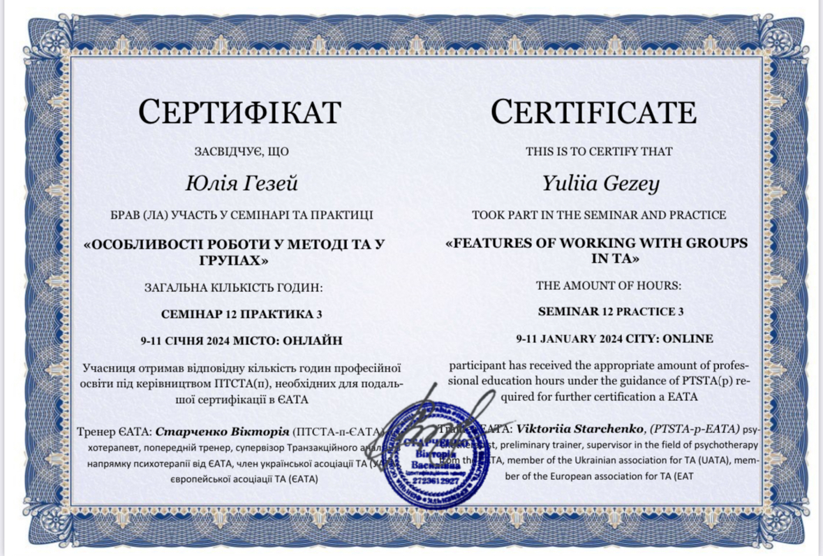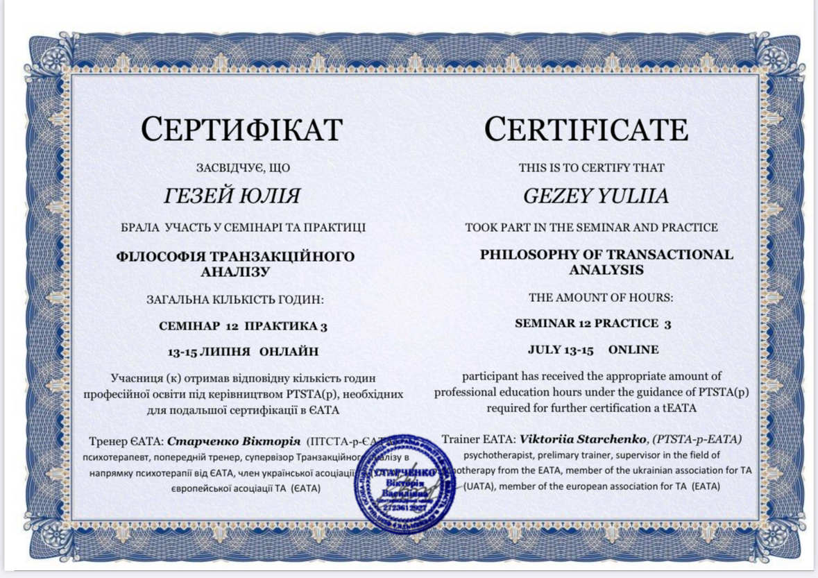 Зараз навчаюся на четвертому фінальному році 202 курсу Транзактний аналіз в психотерапії