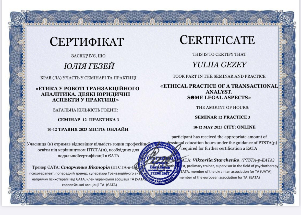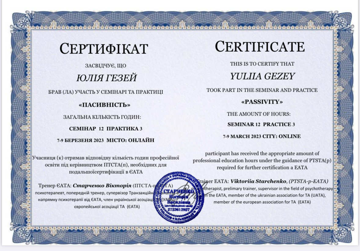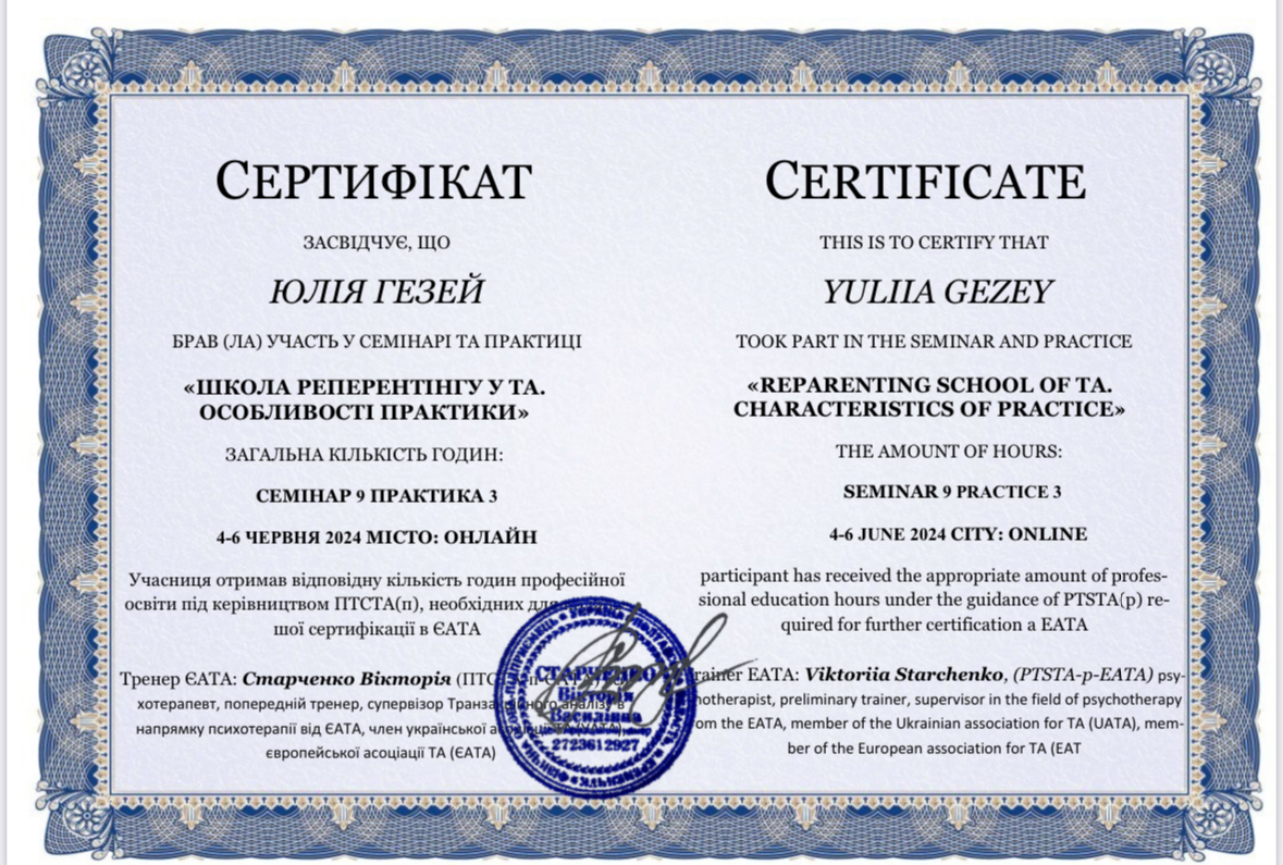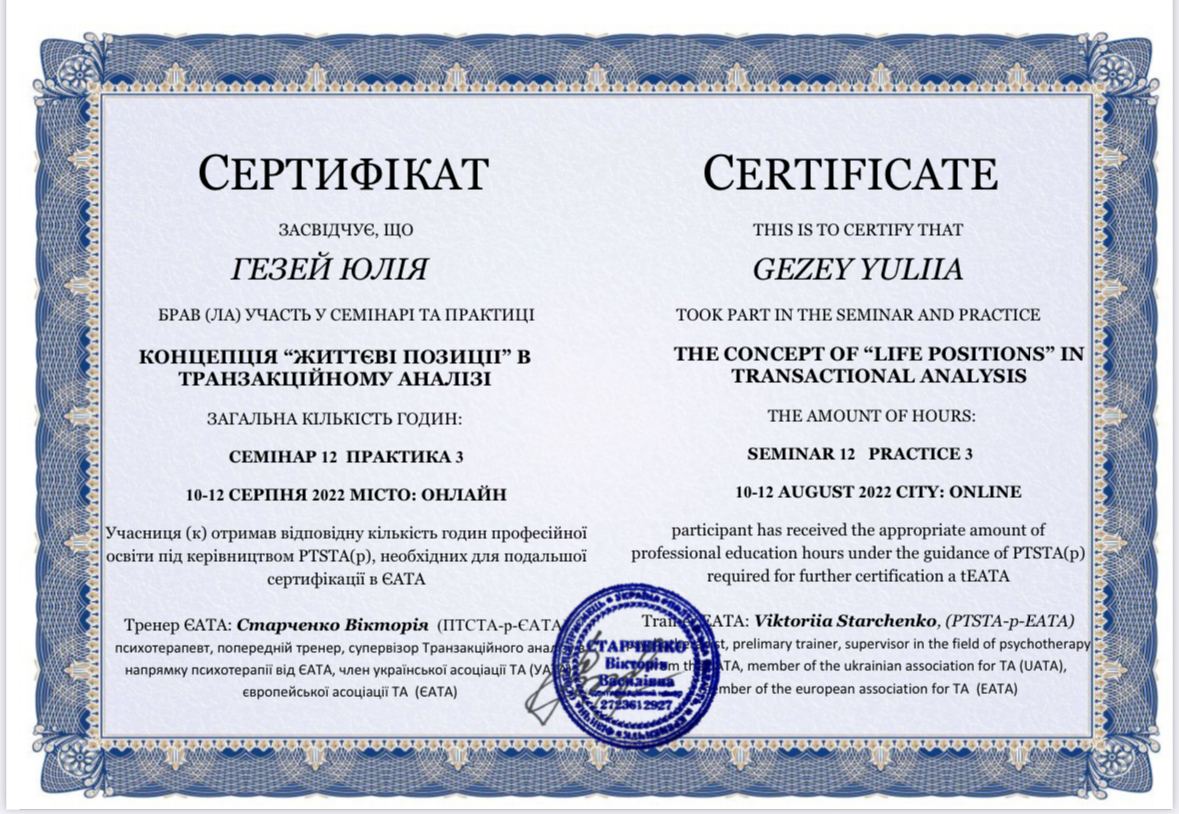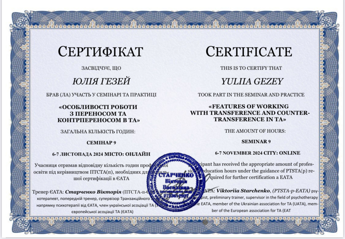 Зараз навчаюся на четвертому фінальному році 202 курсу Транзактний аналіз в психотерапії