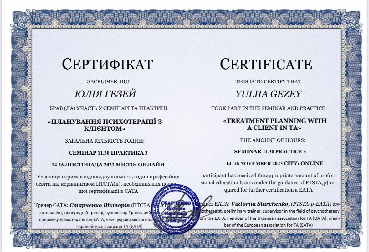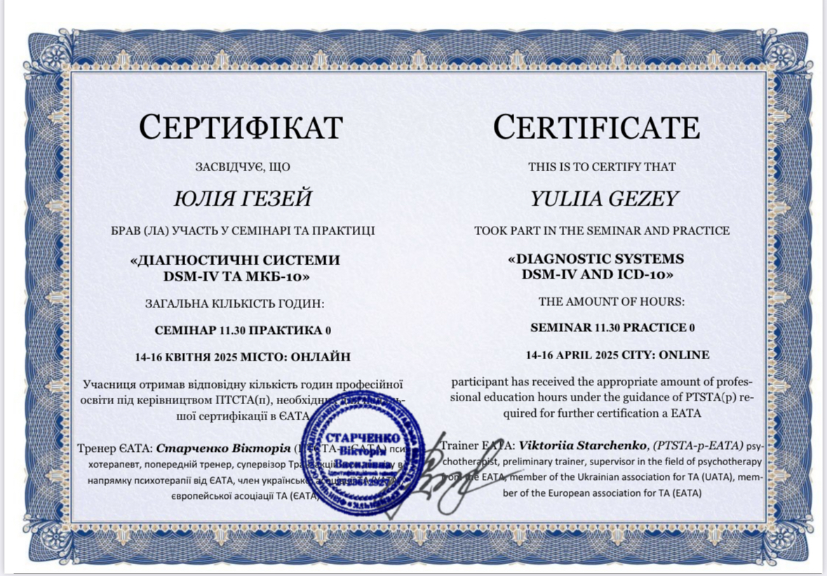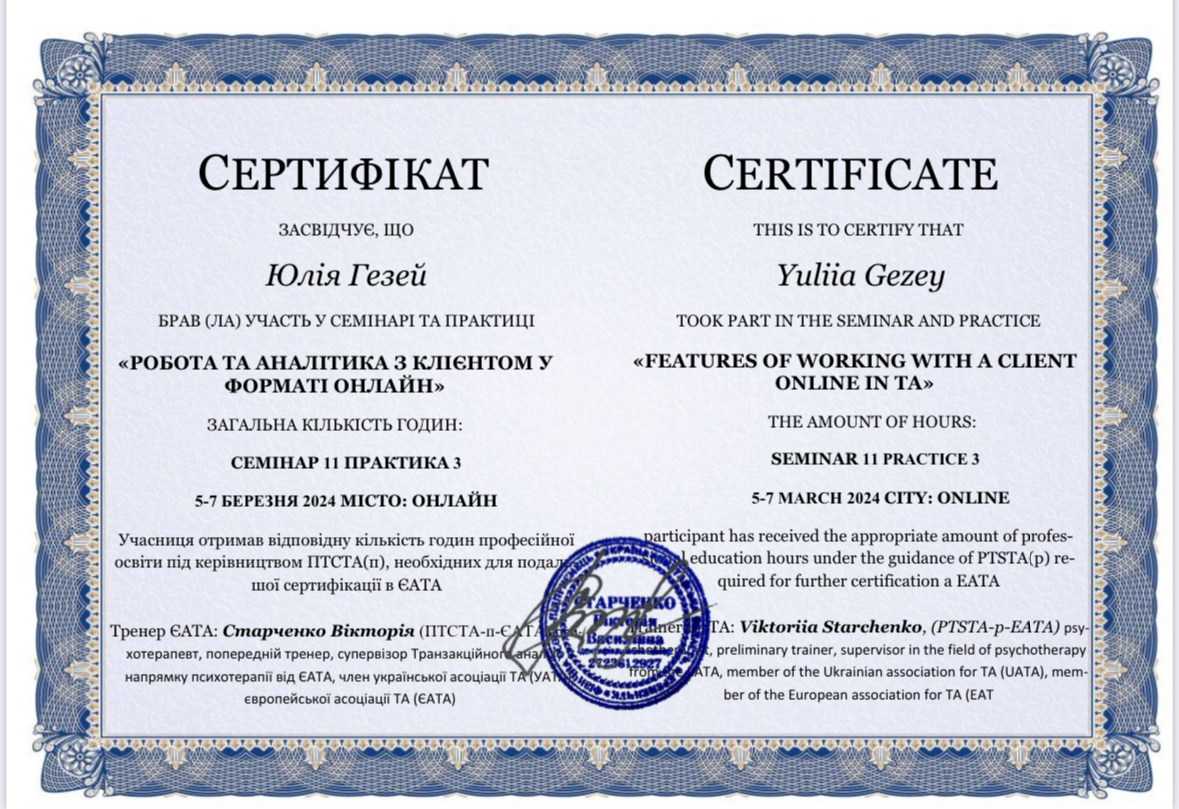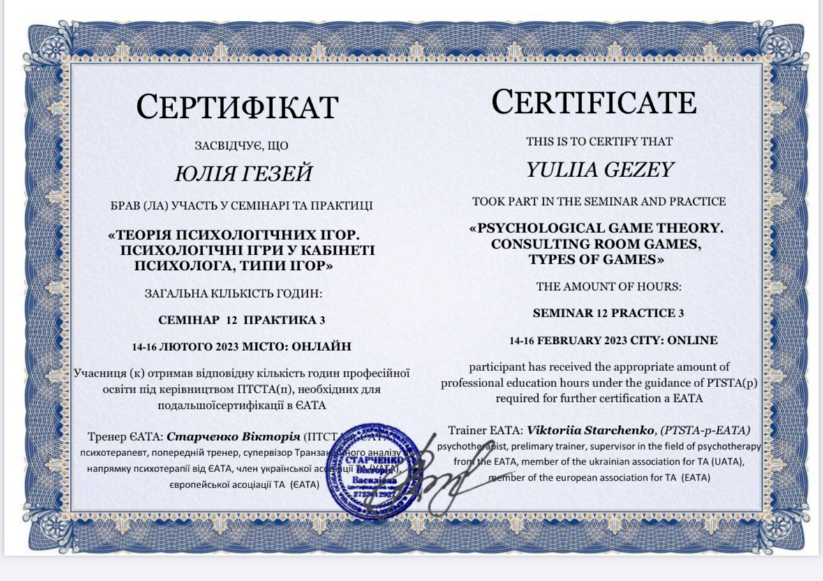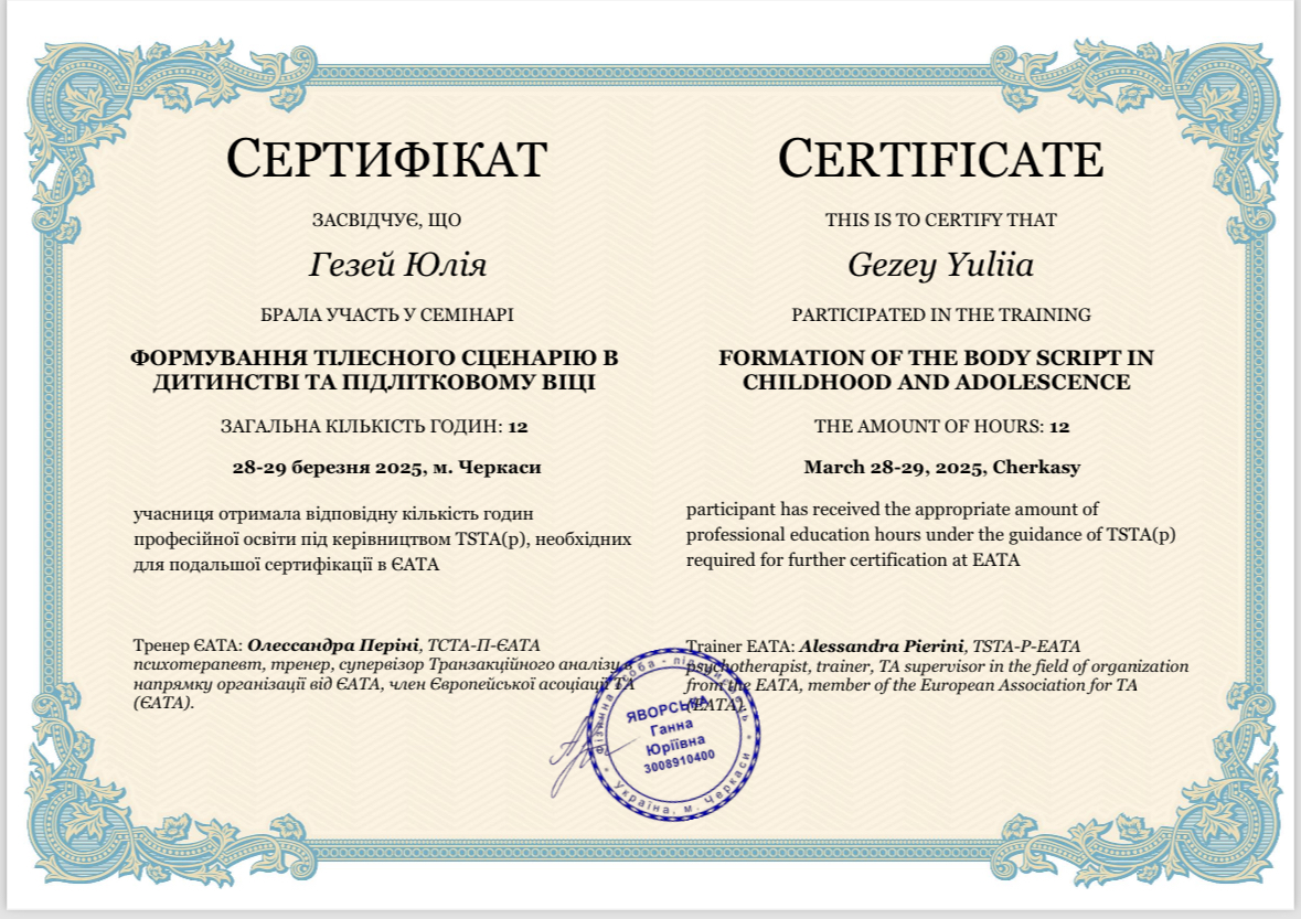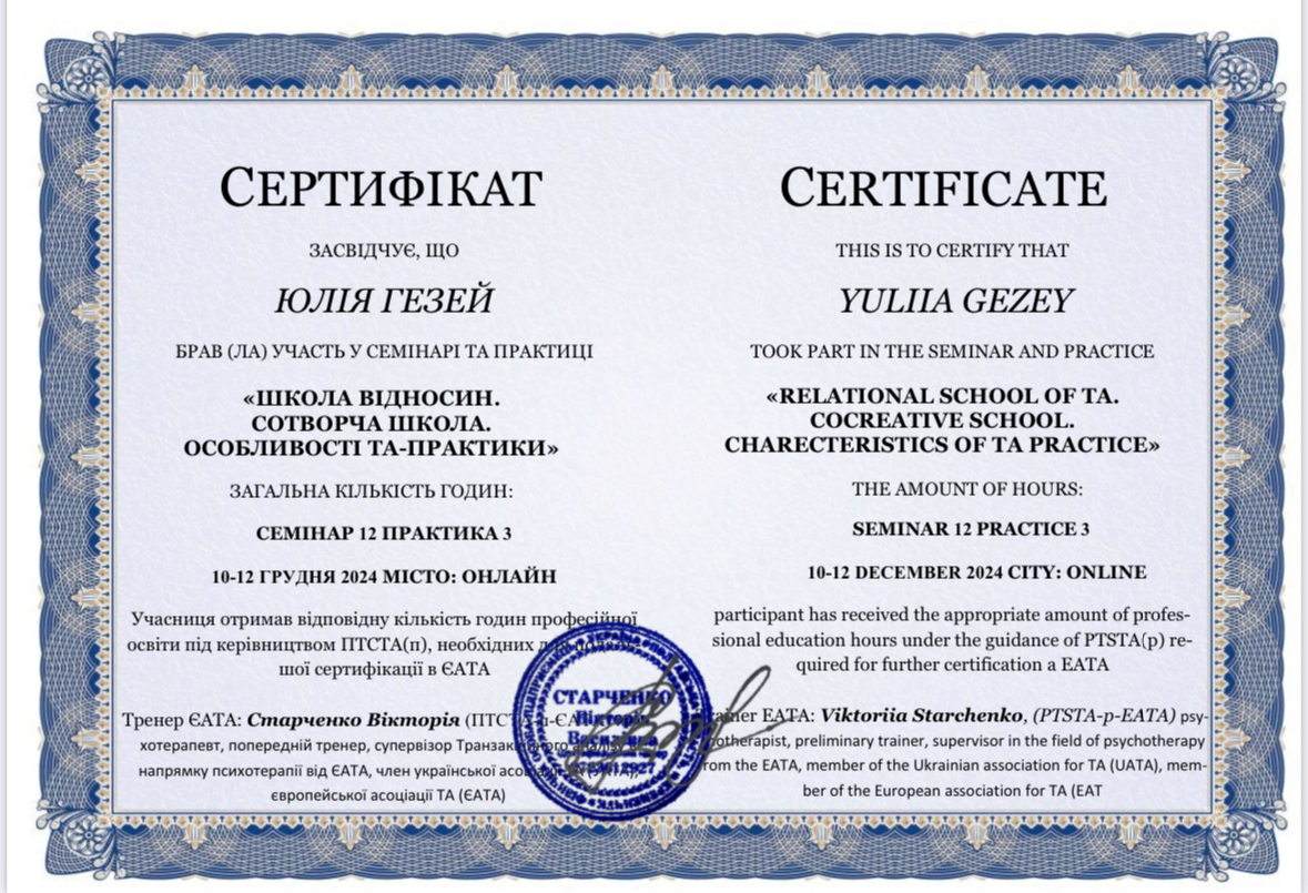 Зараз навчаюся на четвертому фінальному році 202 курсу Транзактний аналіз в психотерапії