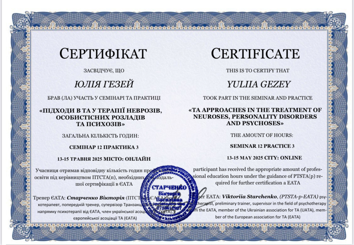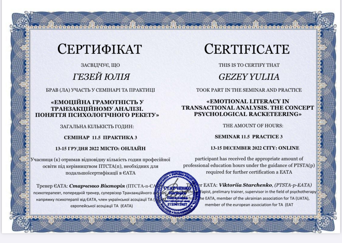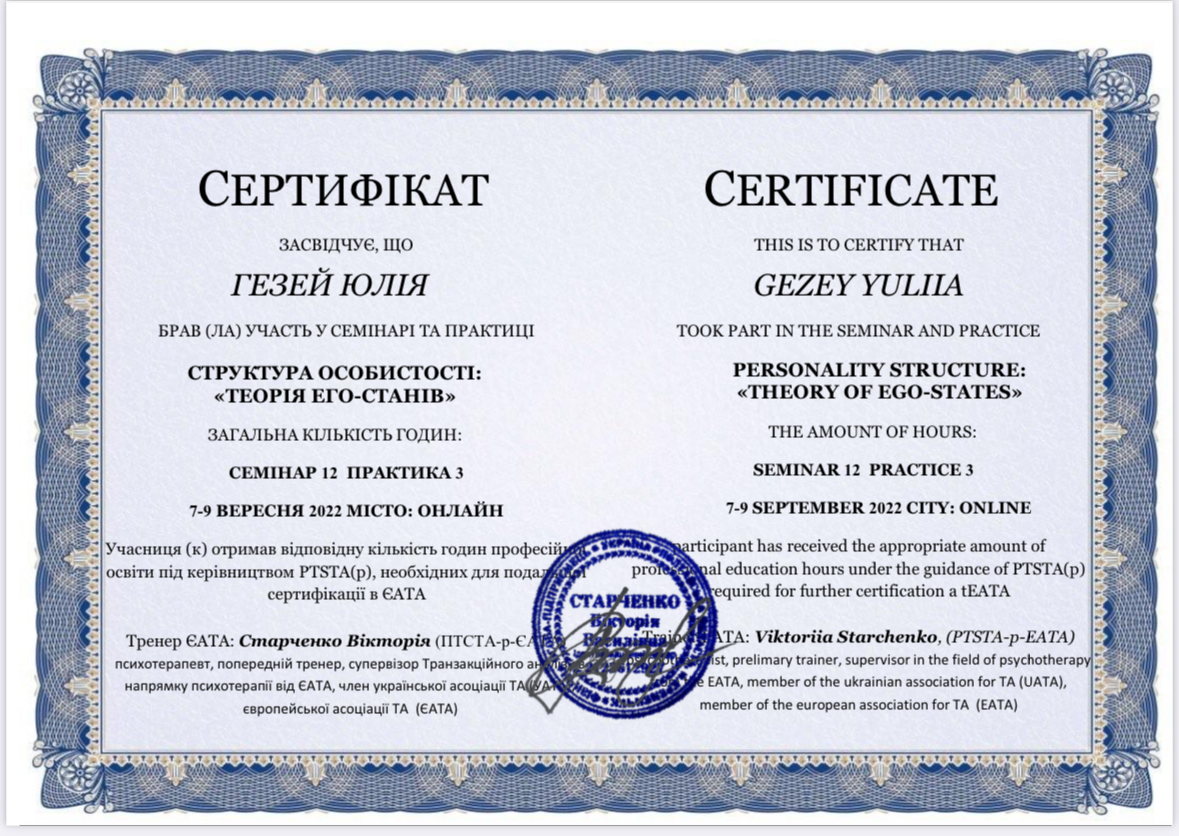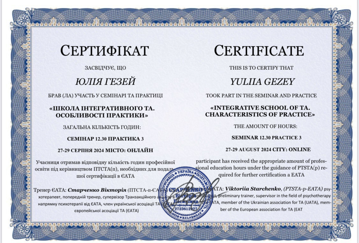 Мене звати Юлія. Я психолог, магістр психології, спеціаліст у напрямі транзакційного аналізу, зараз завершую навчання у європейській освітній програмі підготовки психотерапевтів.