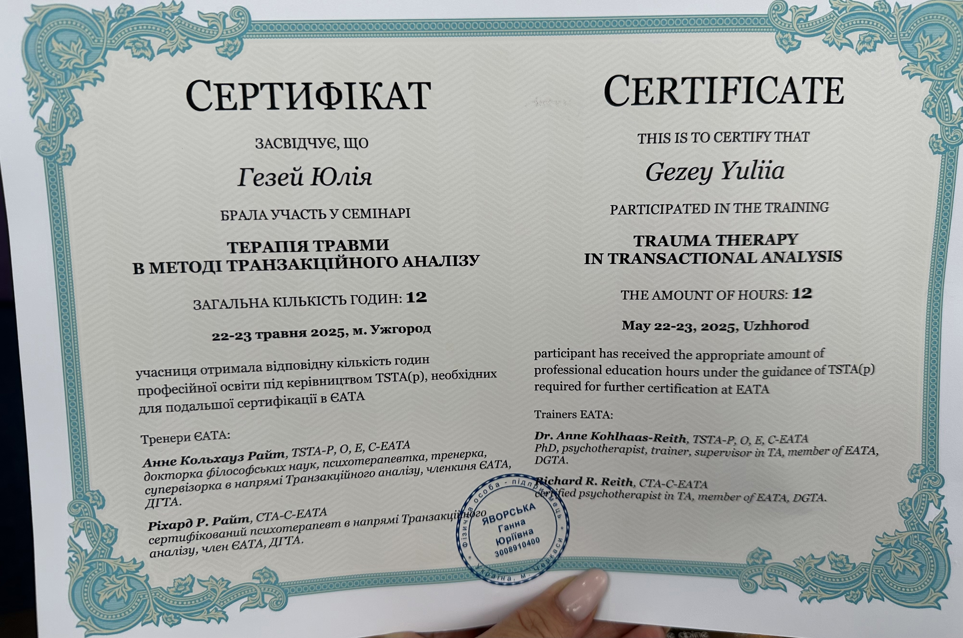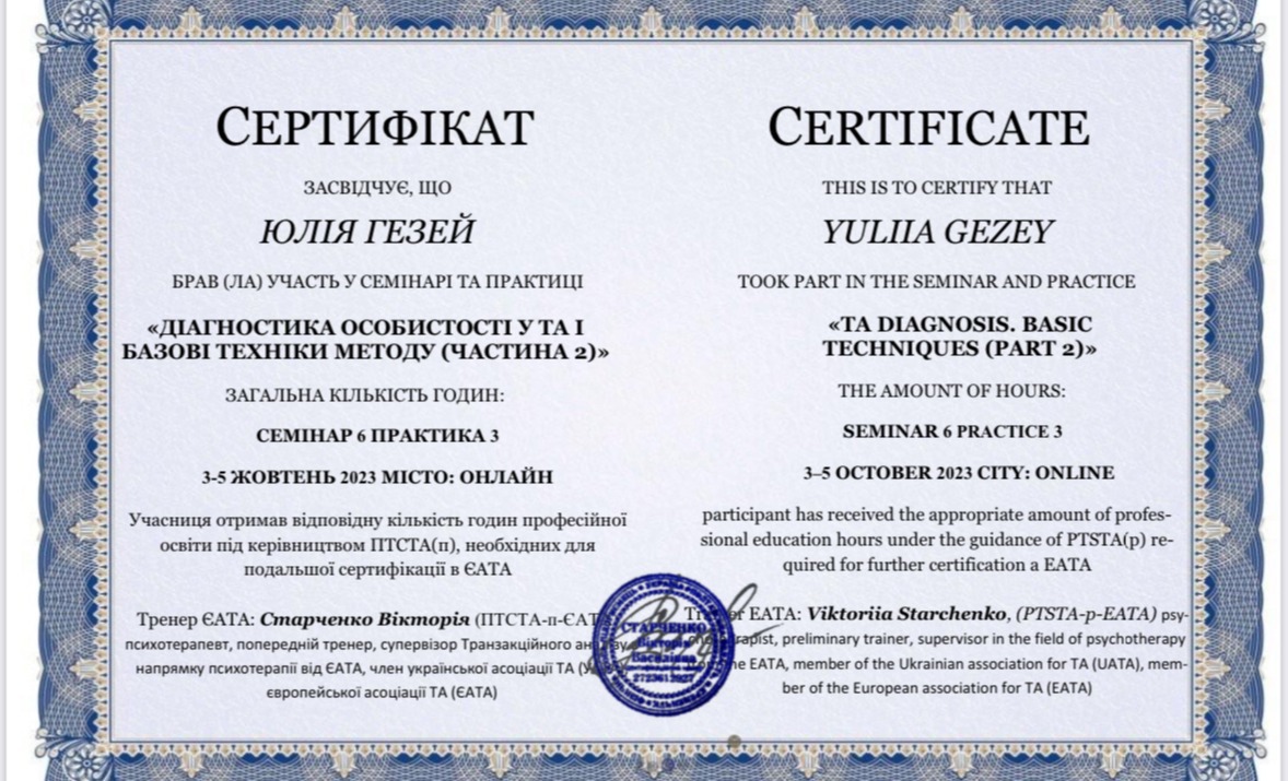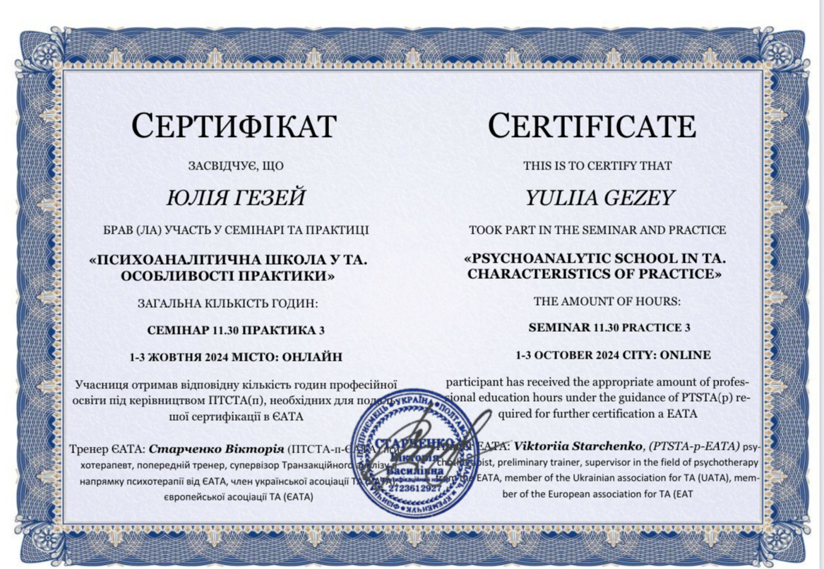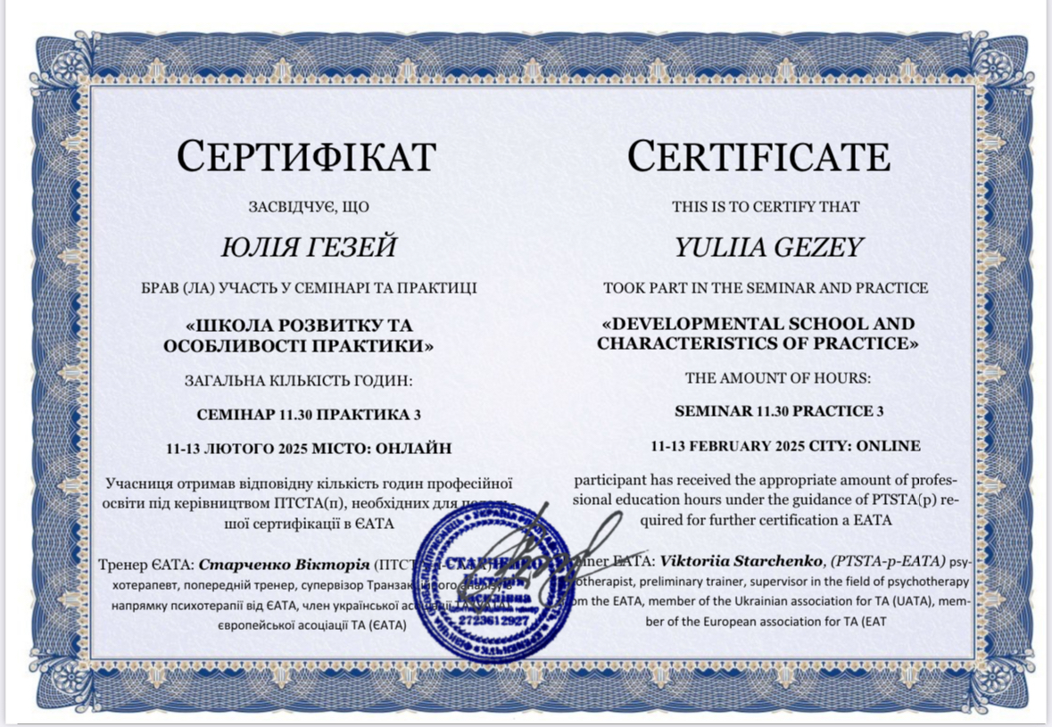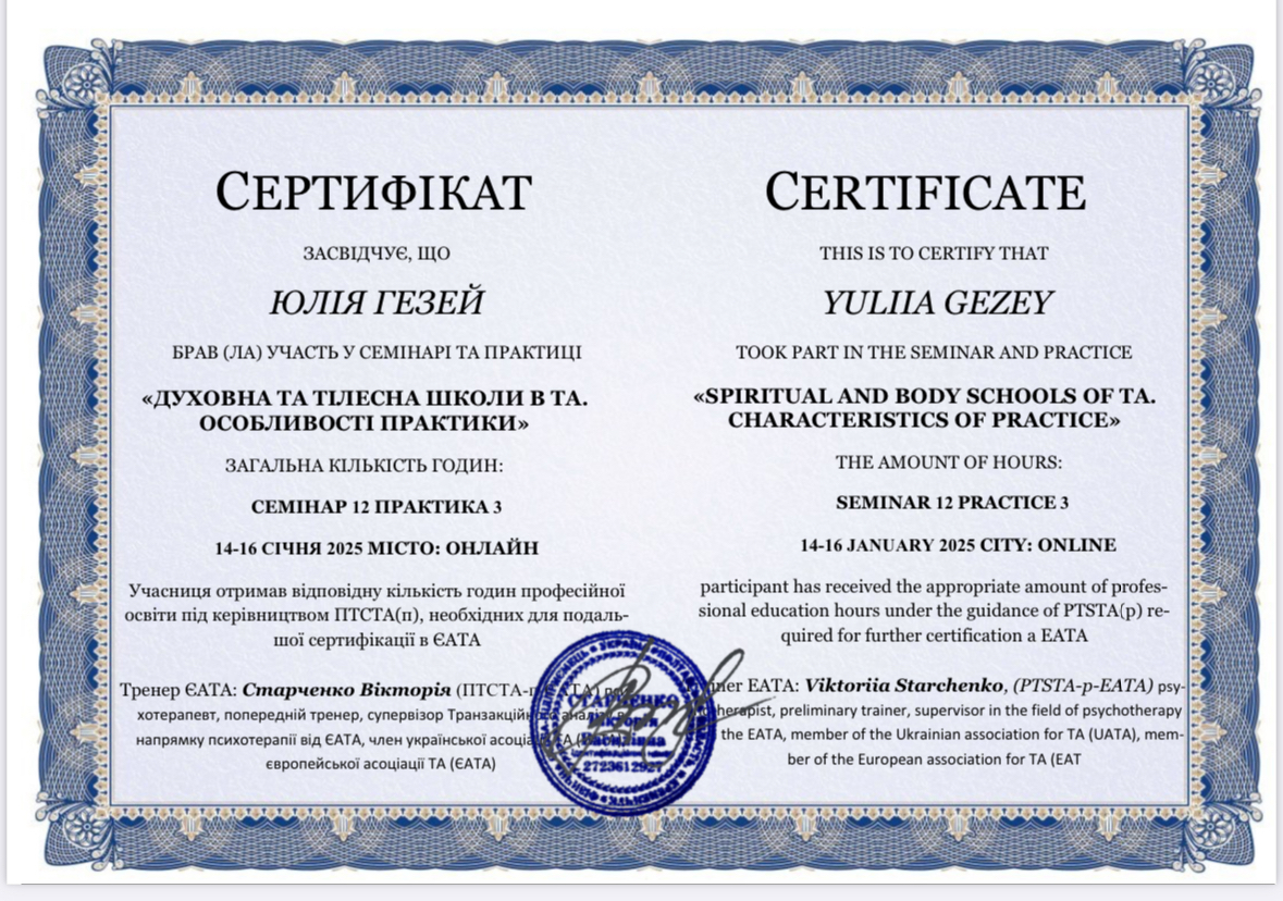 Мене звати Юлія. Я психолог, магістр психології, спеціаліст у напрямі транзакційного аналізу, зараз завершую навчання у європейській освітній програмі підготовки психотерапевтів.