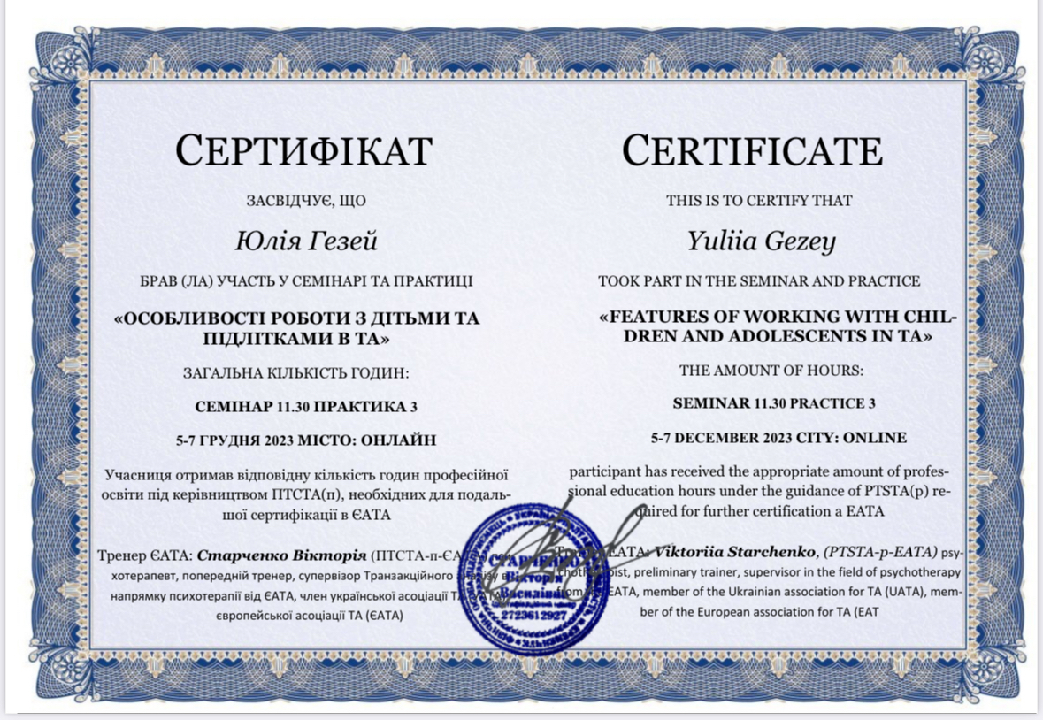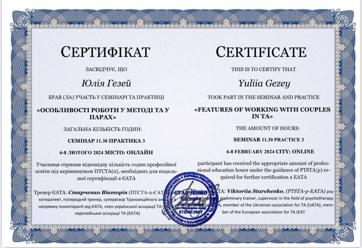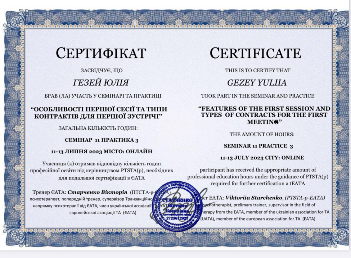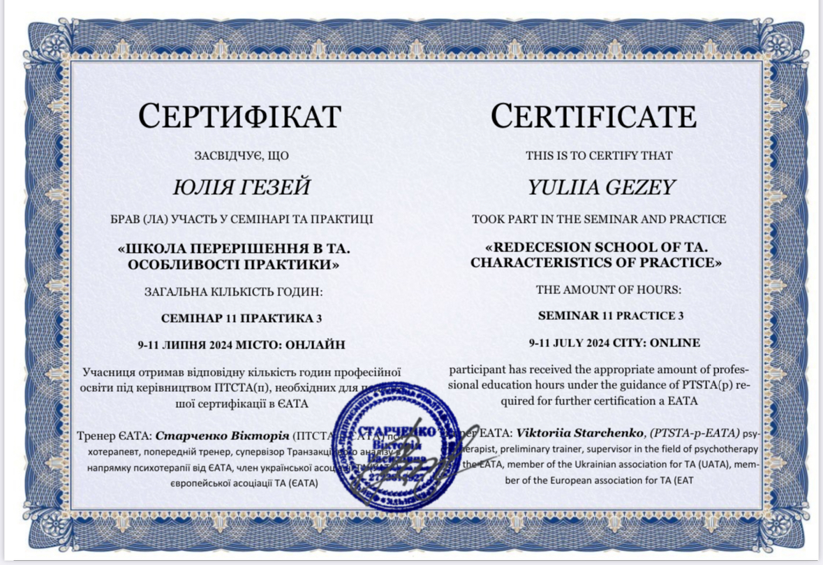 Мене звати Юлія. Я психолог, магістр психології, спеціаліст у напрямі транзакційного аналізу, зараз завершую навчання у європейській освітній програмі підготовки психотерапевтів.