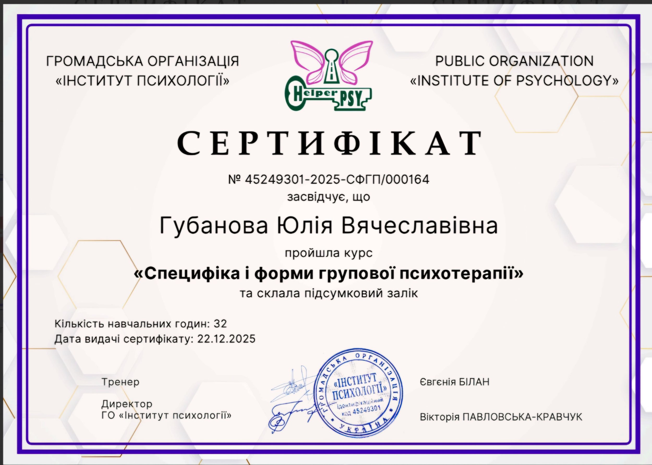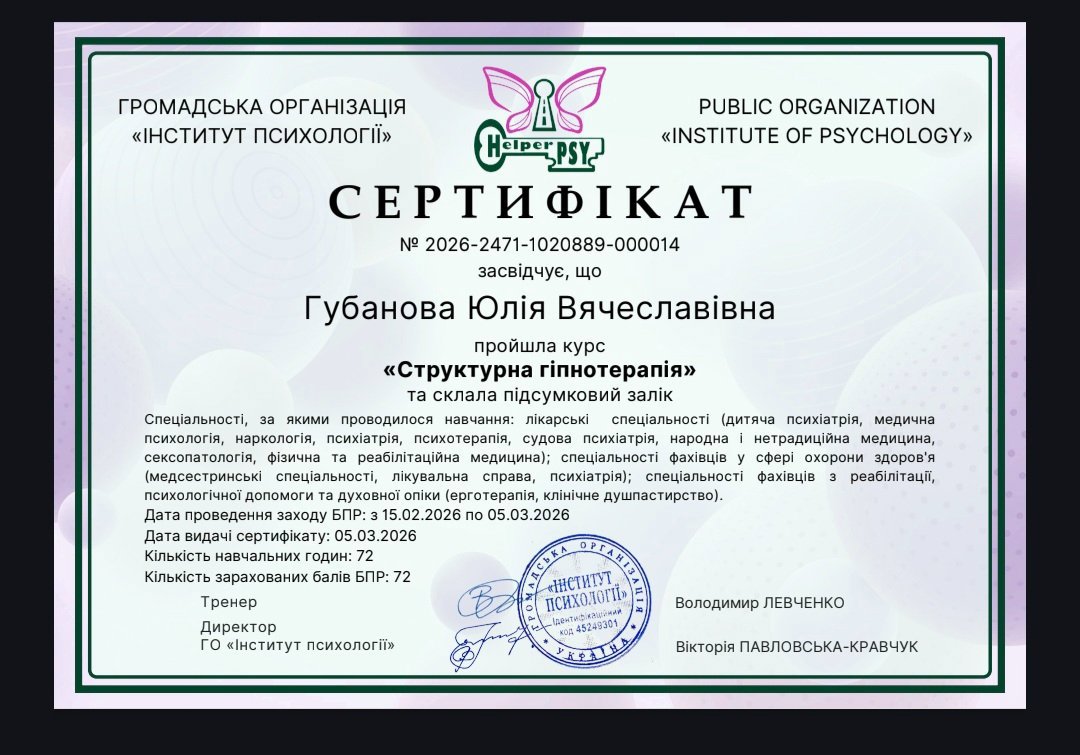 Я отримала можливість повноцінної самореалізації, що допомагає жити в гармонії із собою та світом . Я намагаюся підтримувати кожного, хто цього потребує, на шляху глибокого внутрішнього самовдосконалення, в пошуку сенсів і опор не тільки зовні, а і внутрішньо. Бо справжне відчуття щастя не залежить ні він зовнішніх обставин, ні від людей, що нас оточують. Ніхто і ніщо не може зробити нас настільки посправжньому щасливими, як можемо це зробити і відчути ми самі. Самодослідження , знайомство з собою справжнім, істинним - це мабуть і є той сенс життя, заради якого ми прийшли у цей світ.