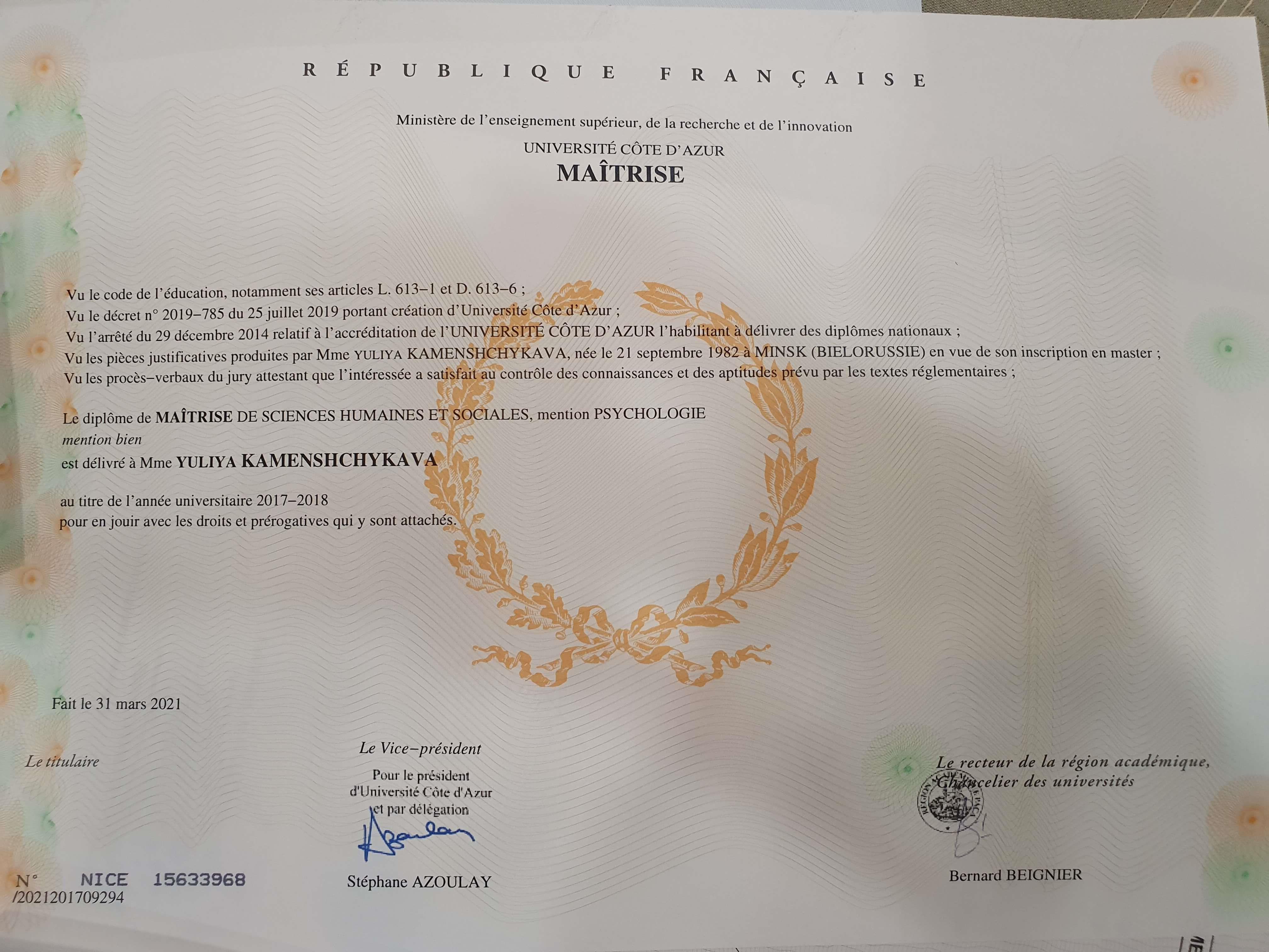 Магістр гуманітарних та соціальних наук інституту Франції Université Côte D'azur