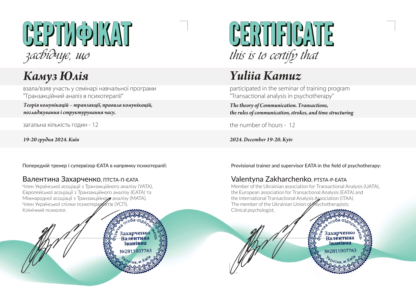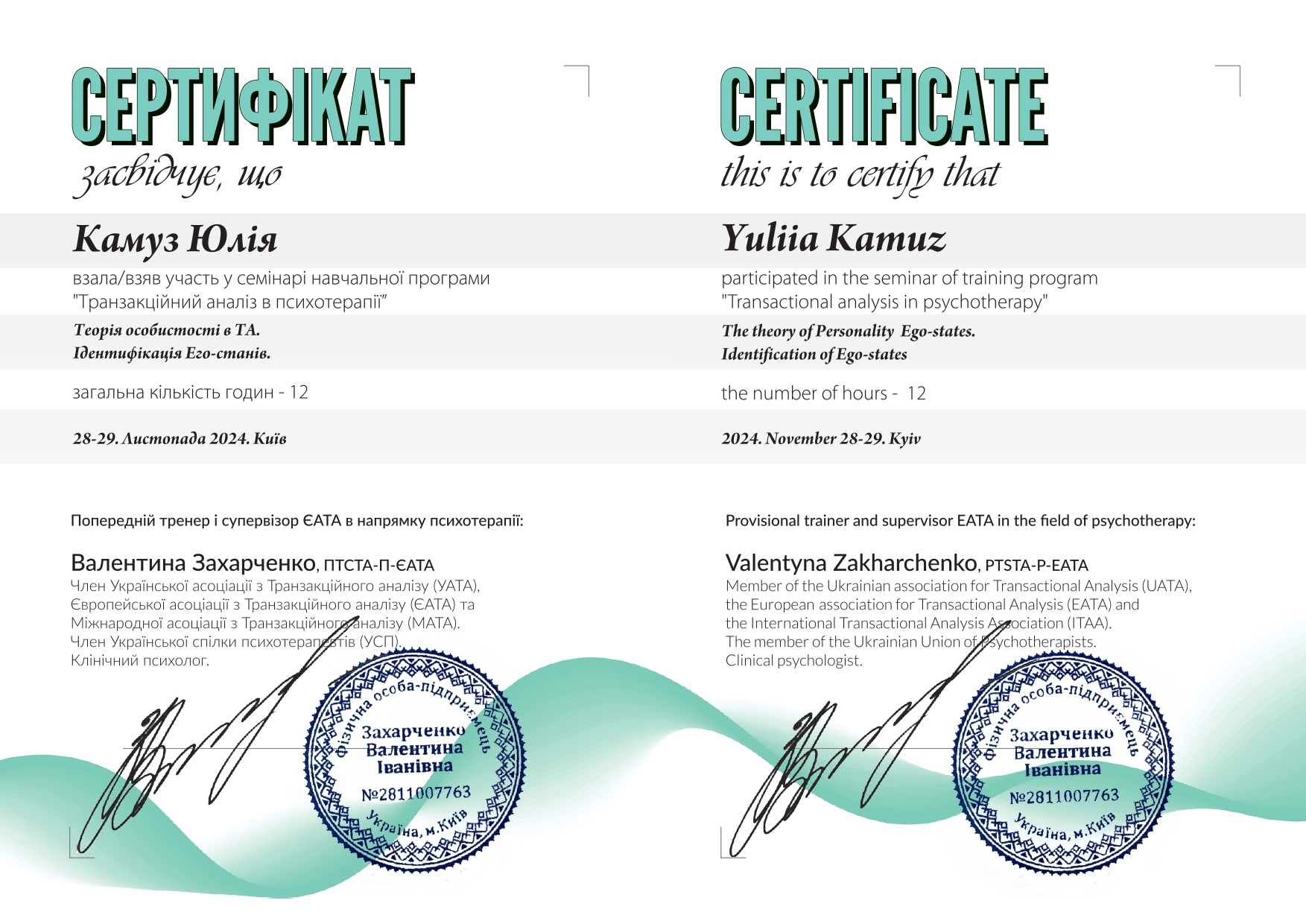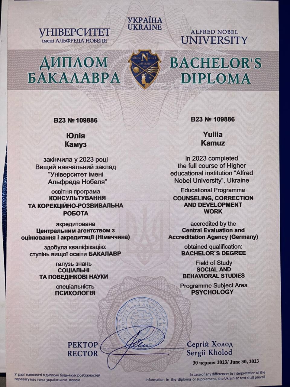 Вітаю! Мене звати Юлія, я психолог, працюю в методі транзакційного аналізу (ТА). Маю вищу психологічну освіту та постійне безперервне навчання. Працюю з дорослими, підлітками та дітьми (від 4 років).