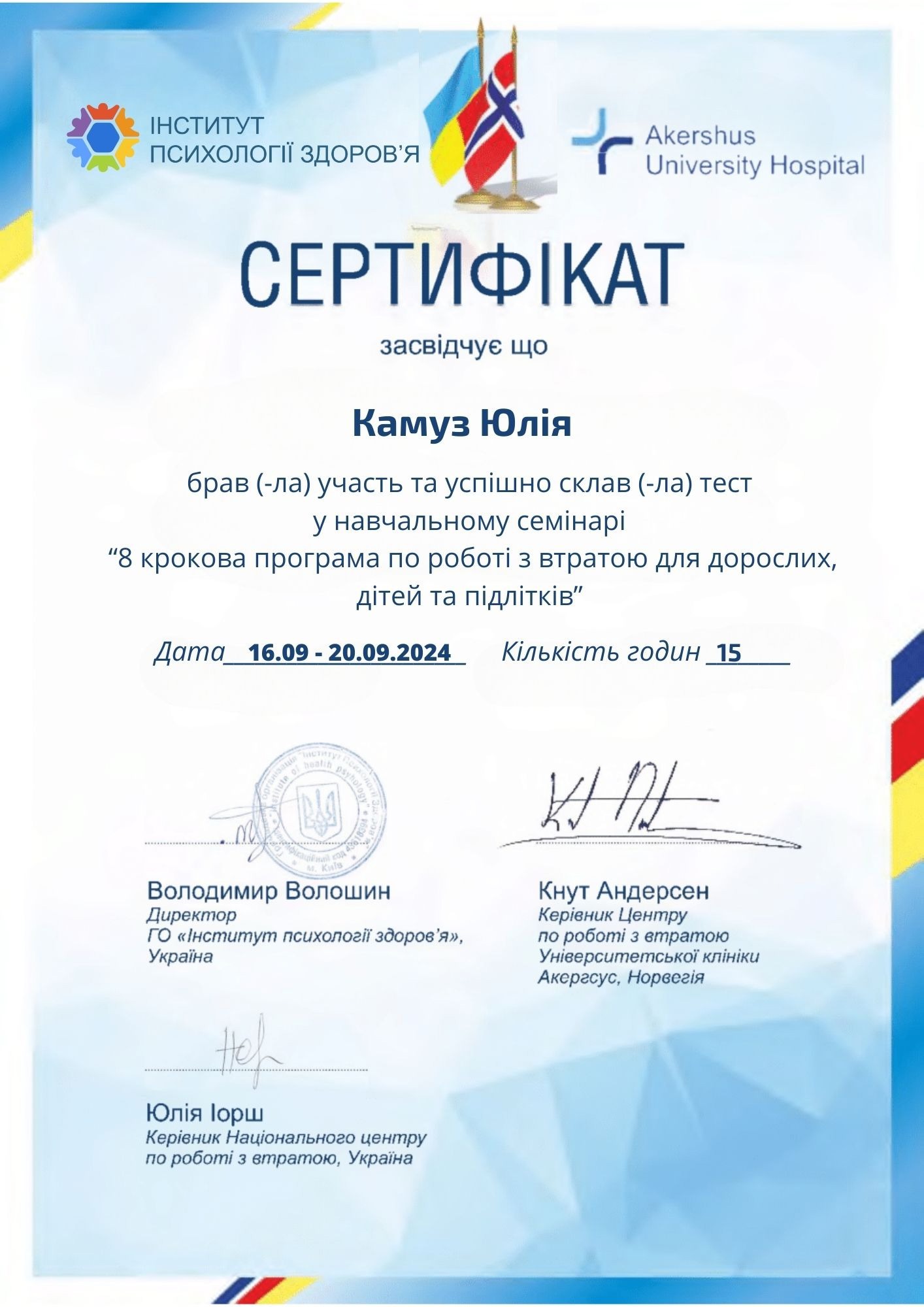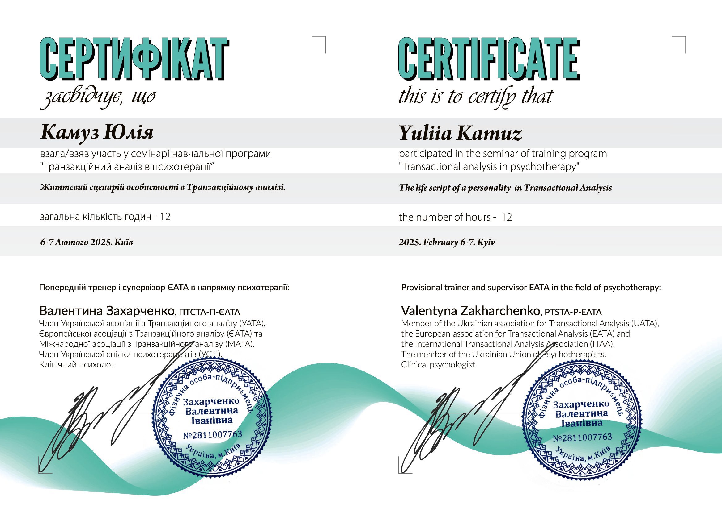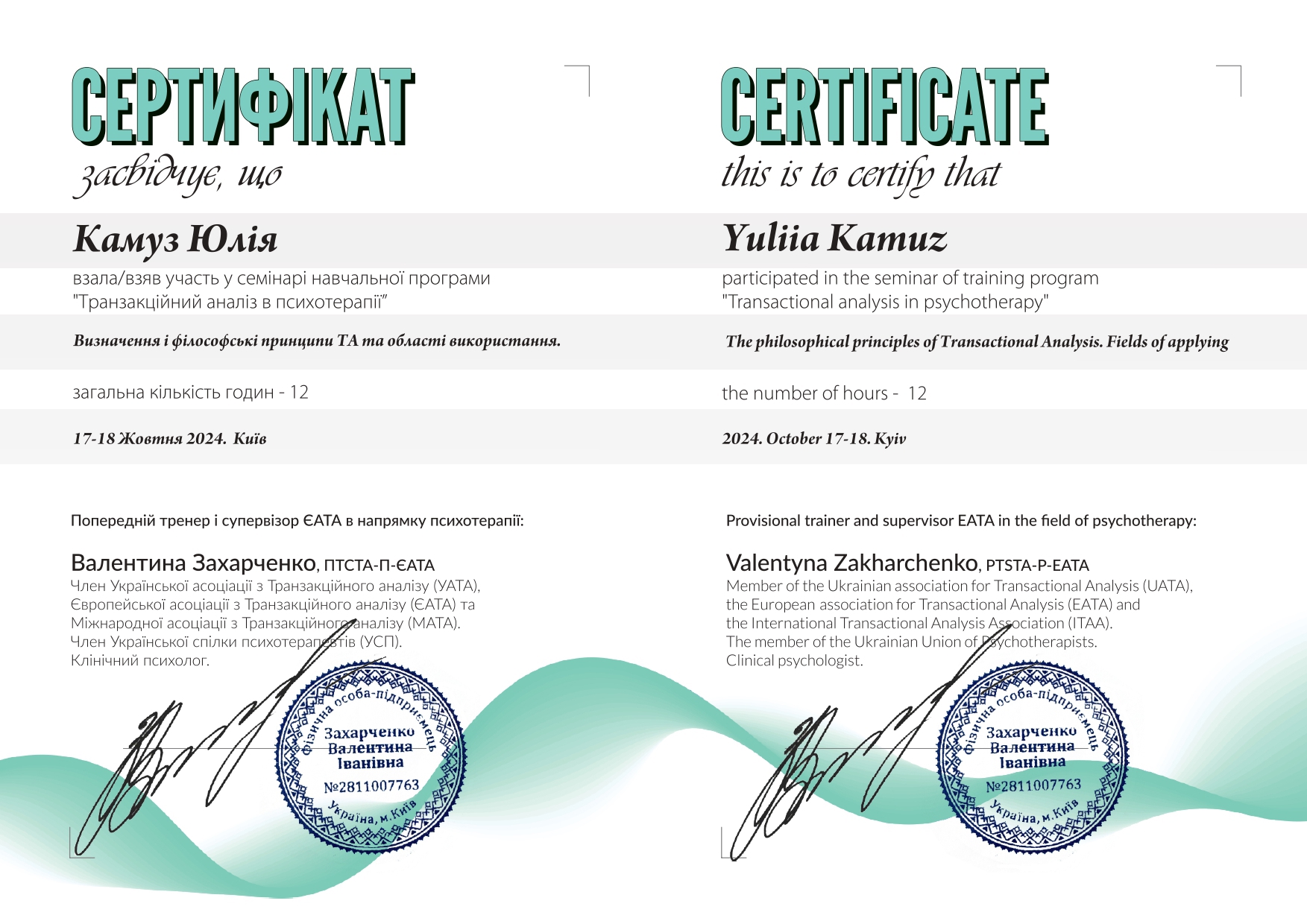 Вітаю! Мене звати Юлія, я психолог, працюю в методі транзакційного аналізу (ТА). Маю вищу психологічну освіту та постійне безперервне навчання. Працюю з дорослими, підлітками та дітьми (від 4 років).