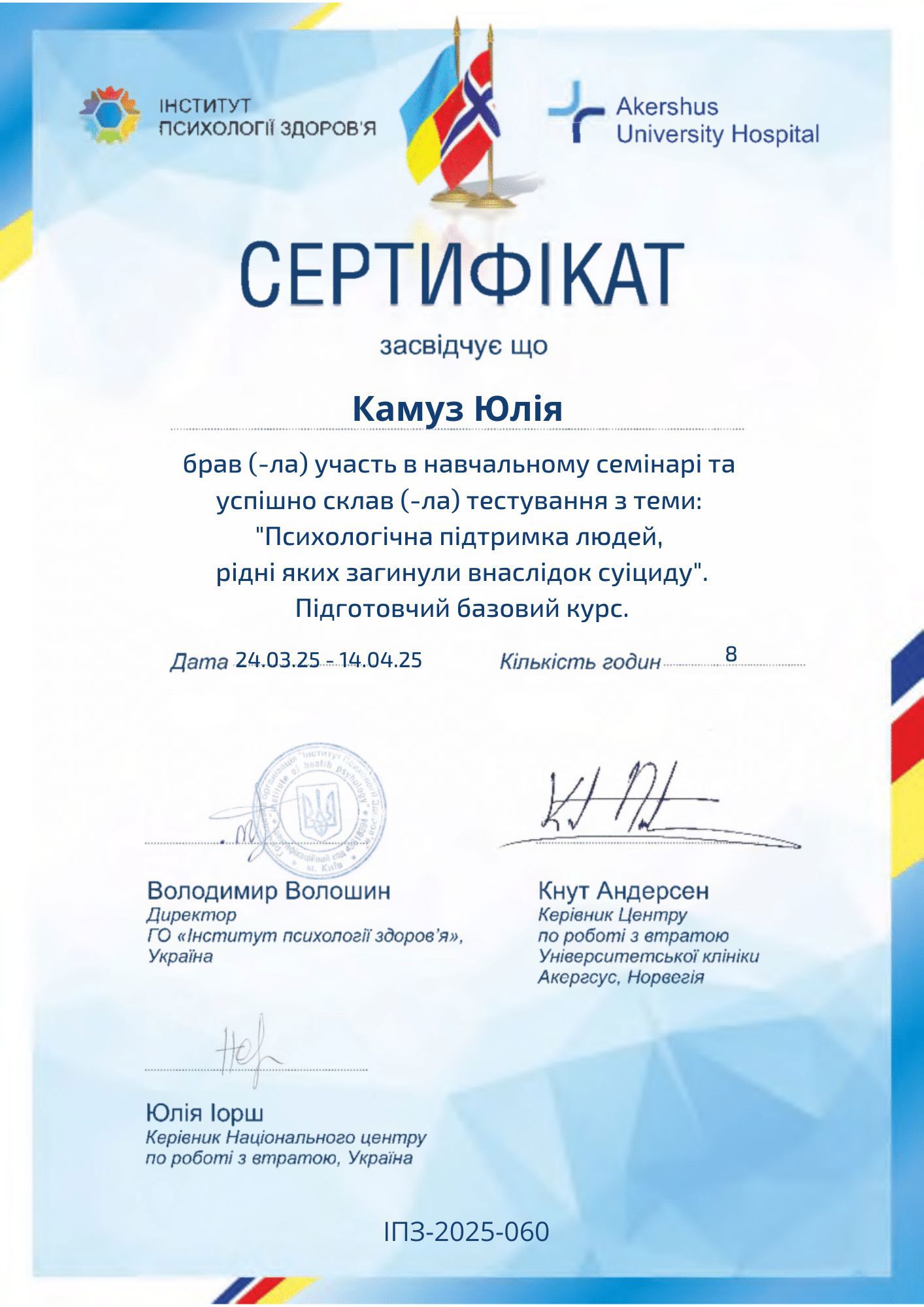 Я супроводжую клієнтів у складних життєвих періодах, допомагаю знаходити внутрішню опору та будувати новий погляд на себе і світ.