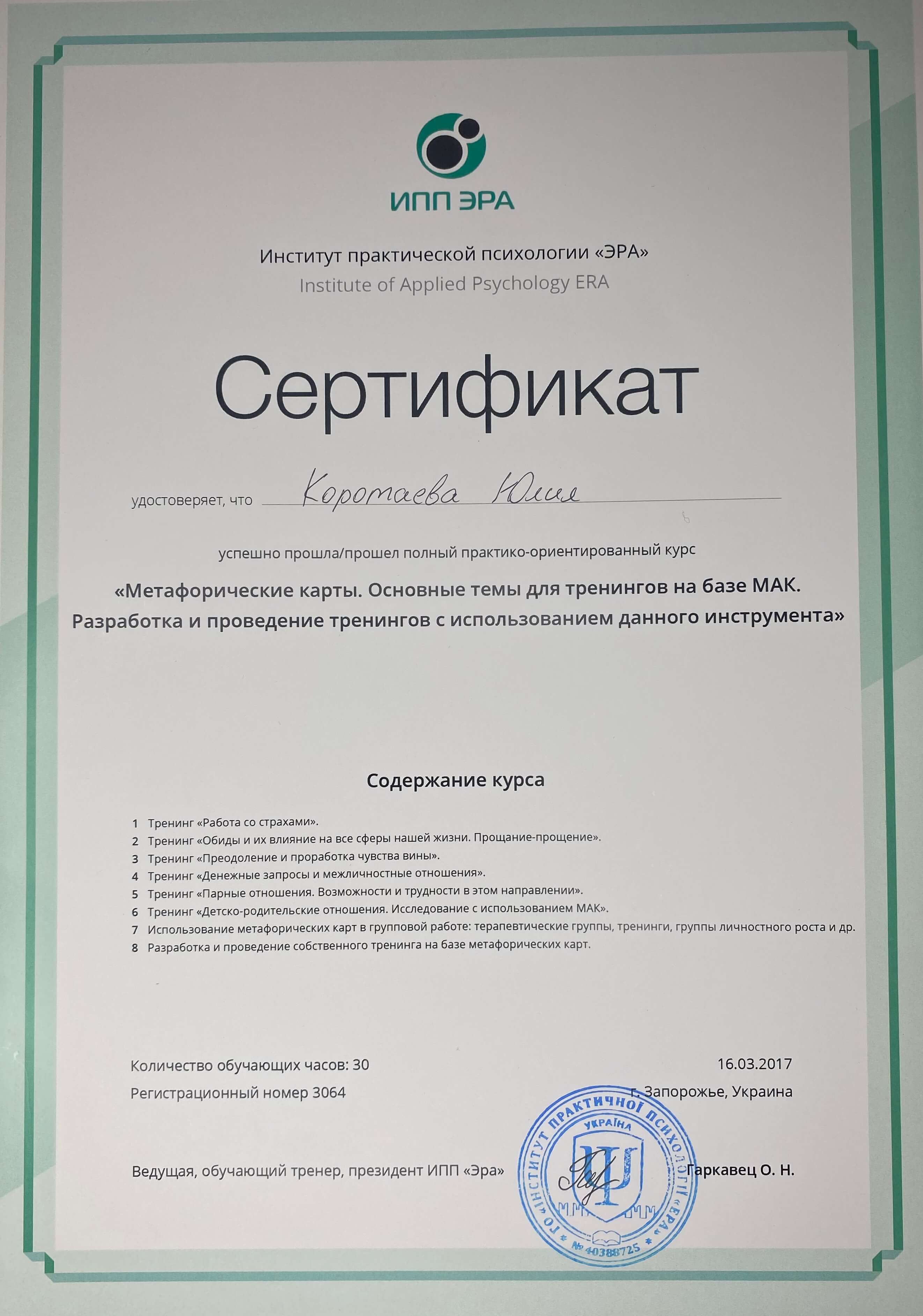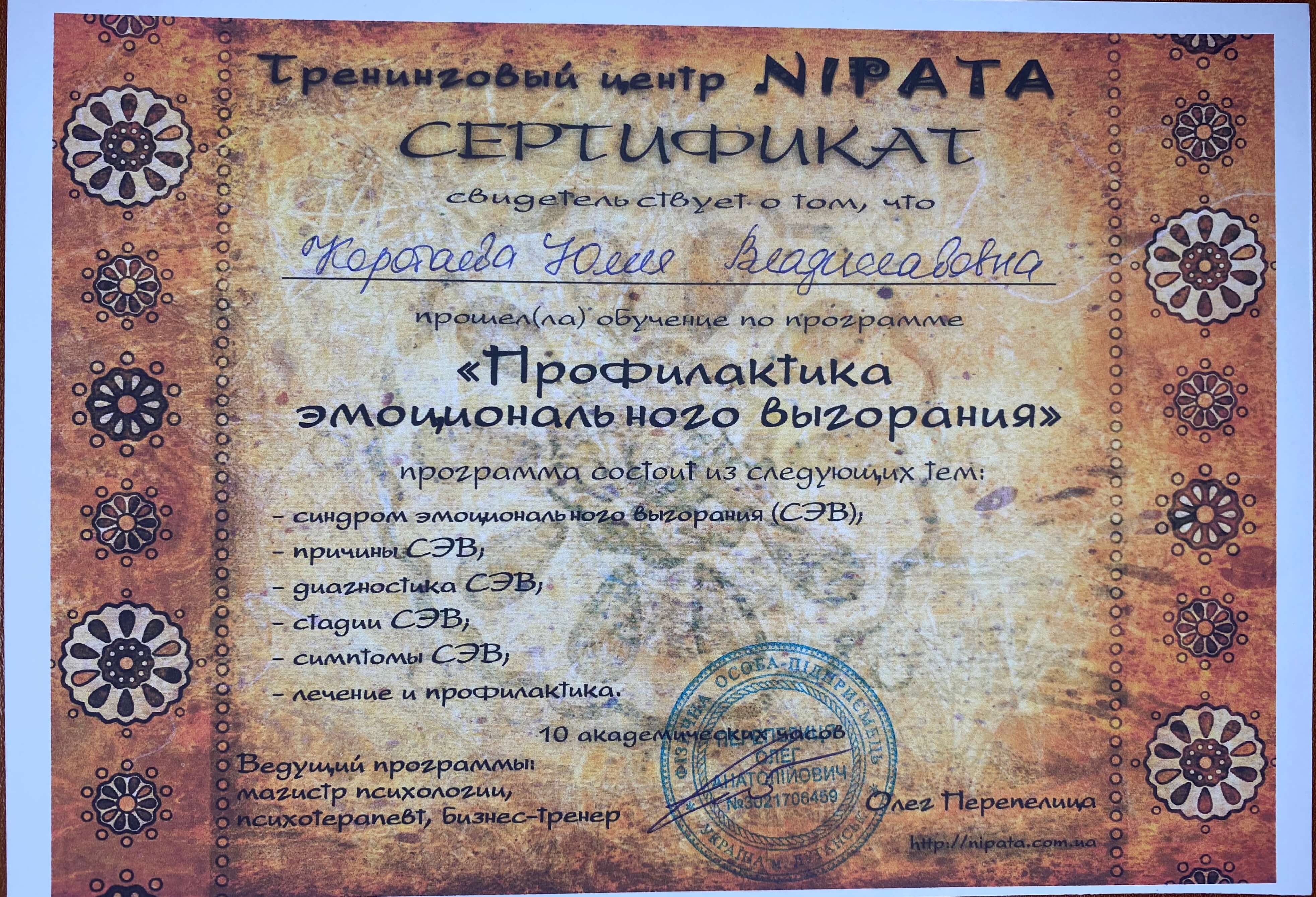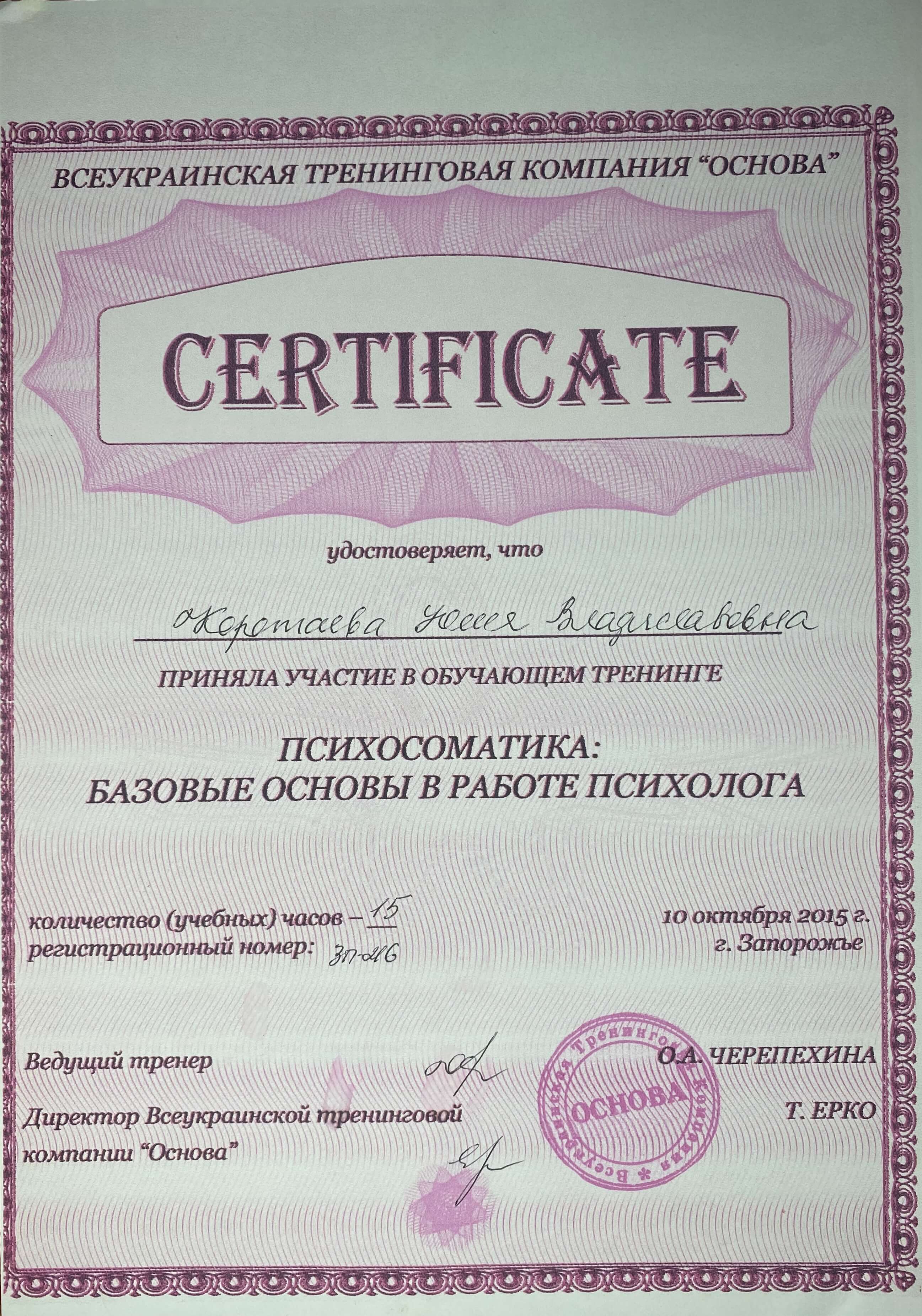 Люблю свою професію, прийшла до неї усвідомлено, маючи за плечима дві вищі освіти. Постійно підвищую кваліфікацію, проходжу особисту терапію.