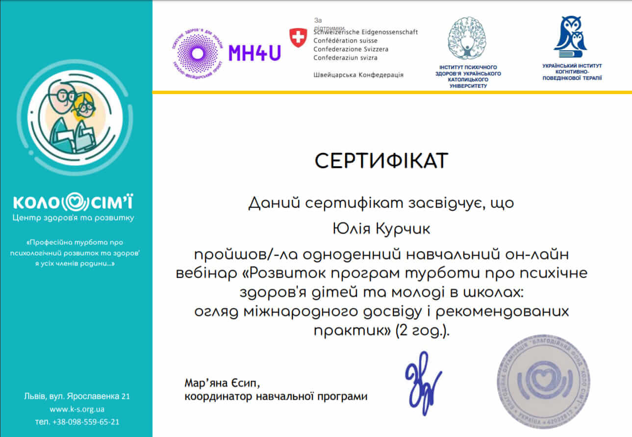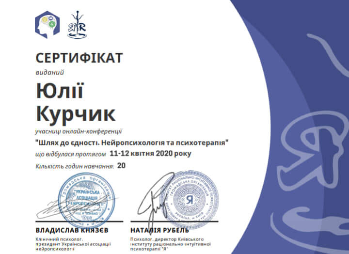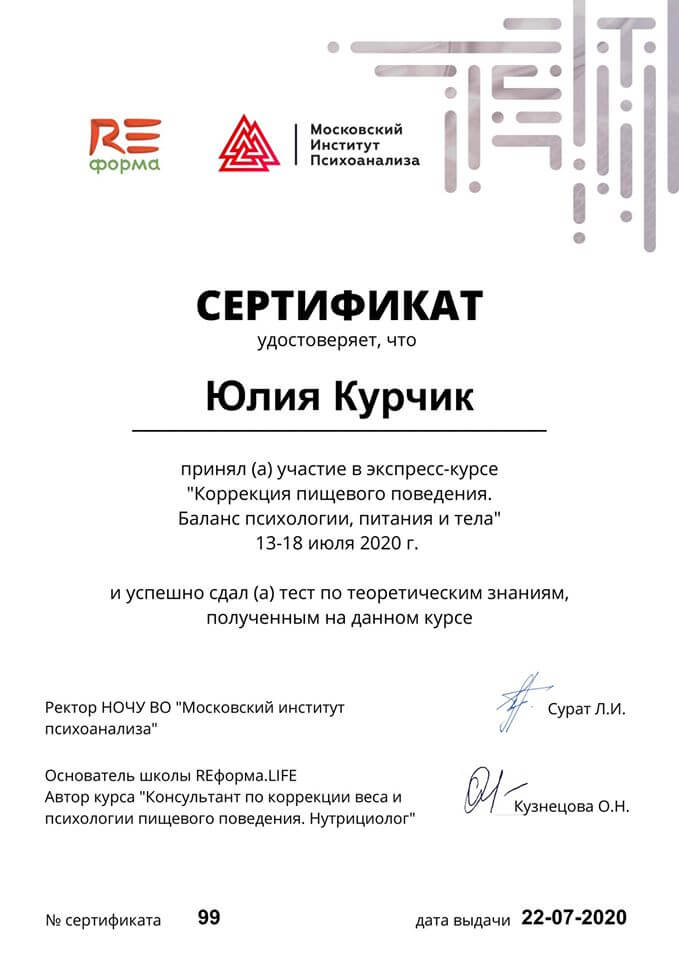 Московський інститут психоаналізу Сертифікат Експрес-курс «Корекція харчової поведінки» 2020р.