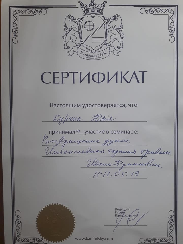 Сертифікат Каніфольський та Ко Консалтингова Компанія “Інтенсивна терапія травми” Метод схемо-терапія. 2019р.
