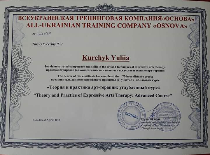 НПУ ім. Драгоманова Свідоцтво “Підвищення кваліфікації за програмою Арт-Терапія” 2016р.