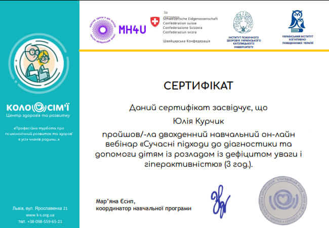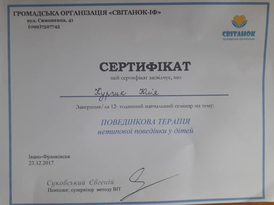 ГО Світанок. Сертифікат “Поведінкова терапія нетипової поведінки у дітей” 2017р.