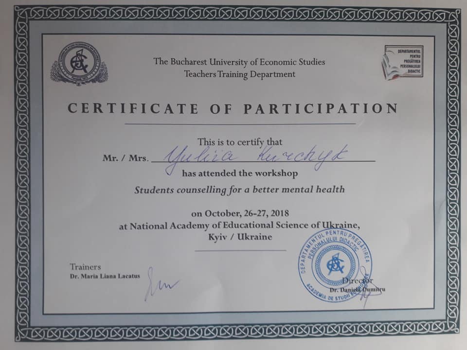 Учасник другої міжнародної конференції Ментальне здоров'я у період війни. Сертифікат 2018р