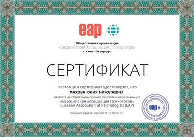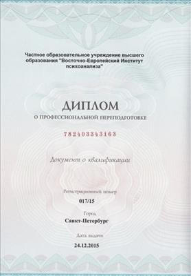 2006-2014р. Курс індивідуального психоаналізу (особиста терапія) у тренінгового аналітика, спеціаліста ЕКПП-Росія Сидоренко Олени Дмитрівни. Курс 8 років (400 годин).