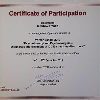 2019р. Зимова школа Sigmund Freud University з Максиміліаном Прітцем (професор Австрія, м. Відень). Курс "Психотерапія та психоаналіз - діагностика та лікування розладів ICD10 спектру" - 30 годин.