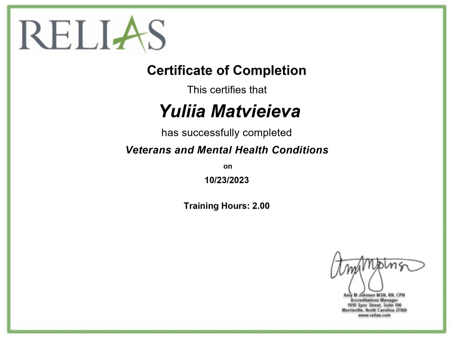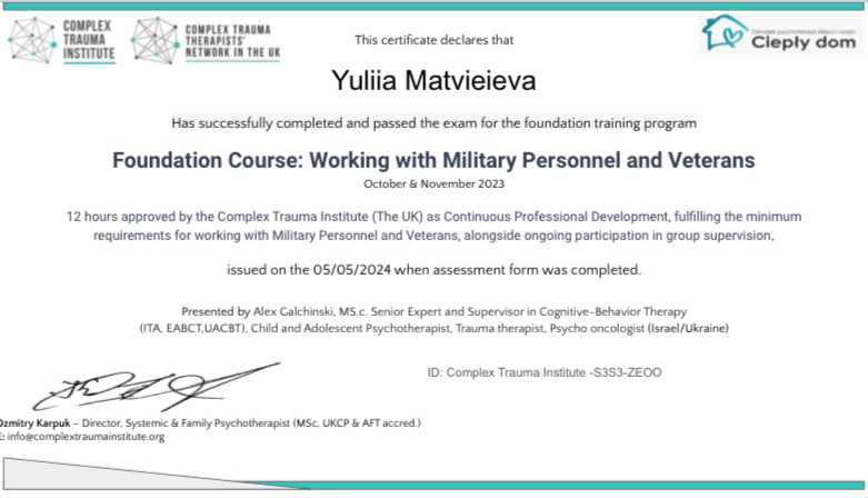 Моя спеціалізація - робота з людьми, які пережили складні життєві події, втрати чи травми, а також робота з військовими і ветеранами. Окрім цього, я допомагаю клієнтам з РДУГ. Я надаю велике значення психоедукації, щоб допомогти клієнтам краще розуміти себе, свої реакції і знайти внутрішні ресурси для подолання труднощів.
