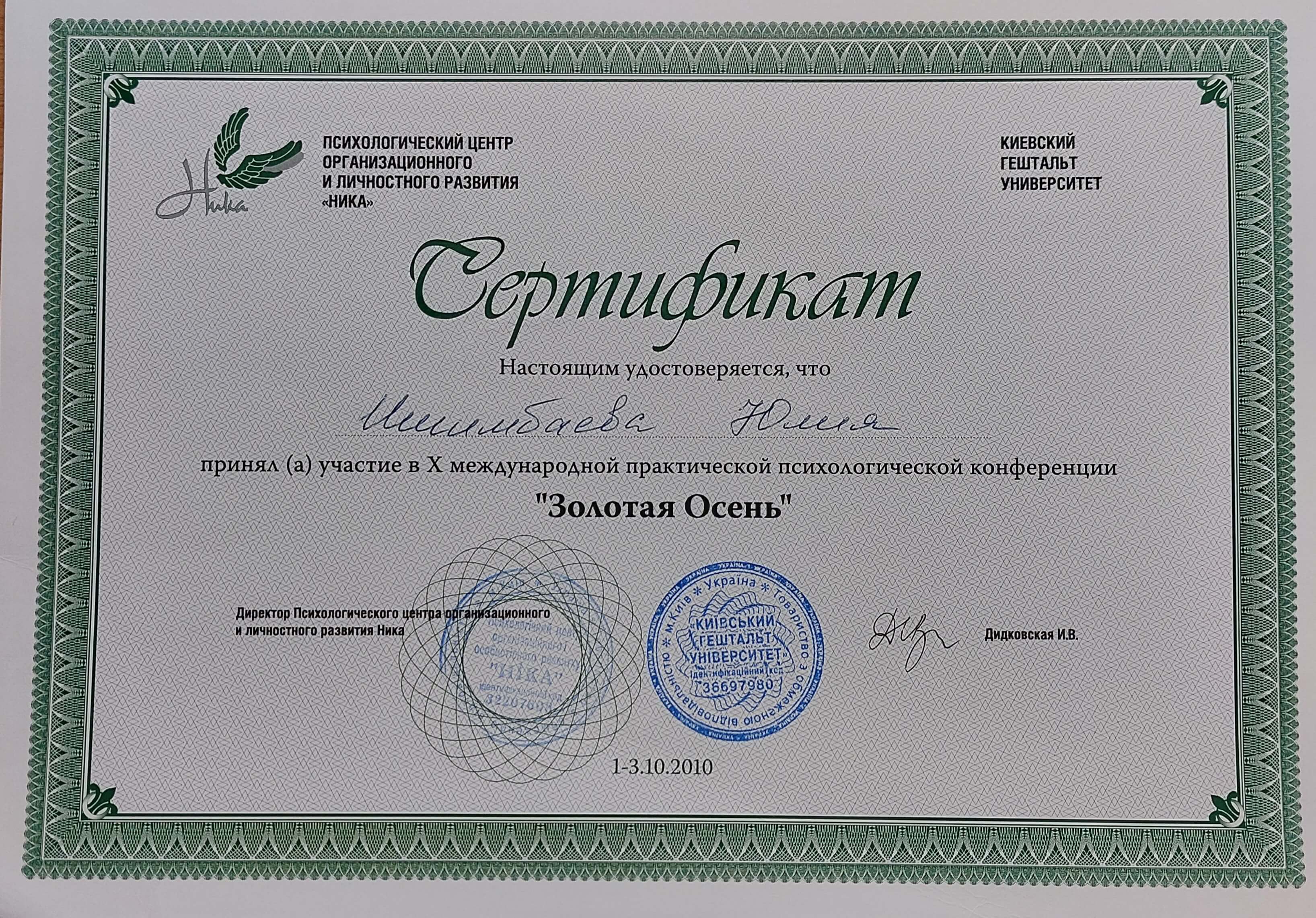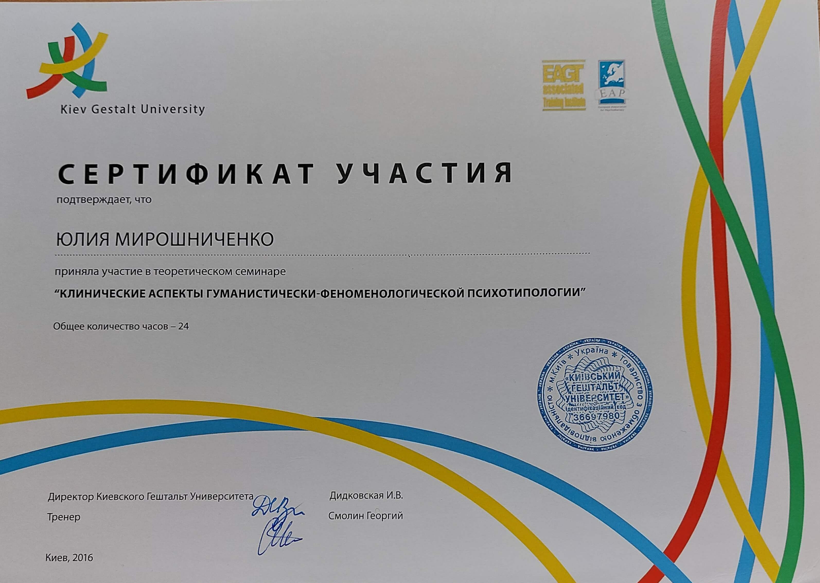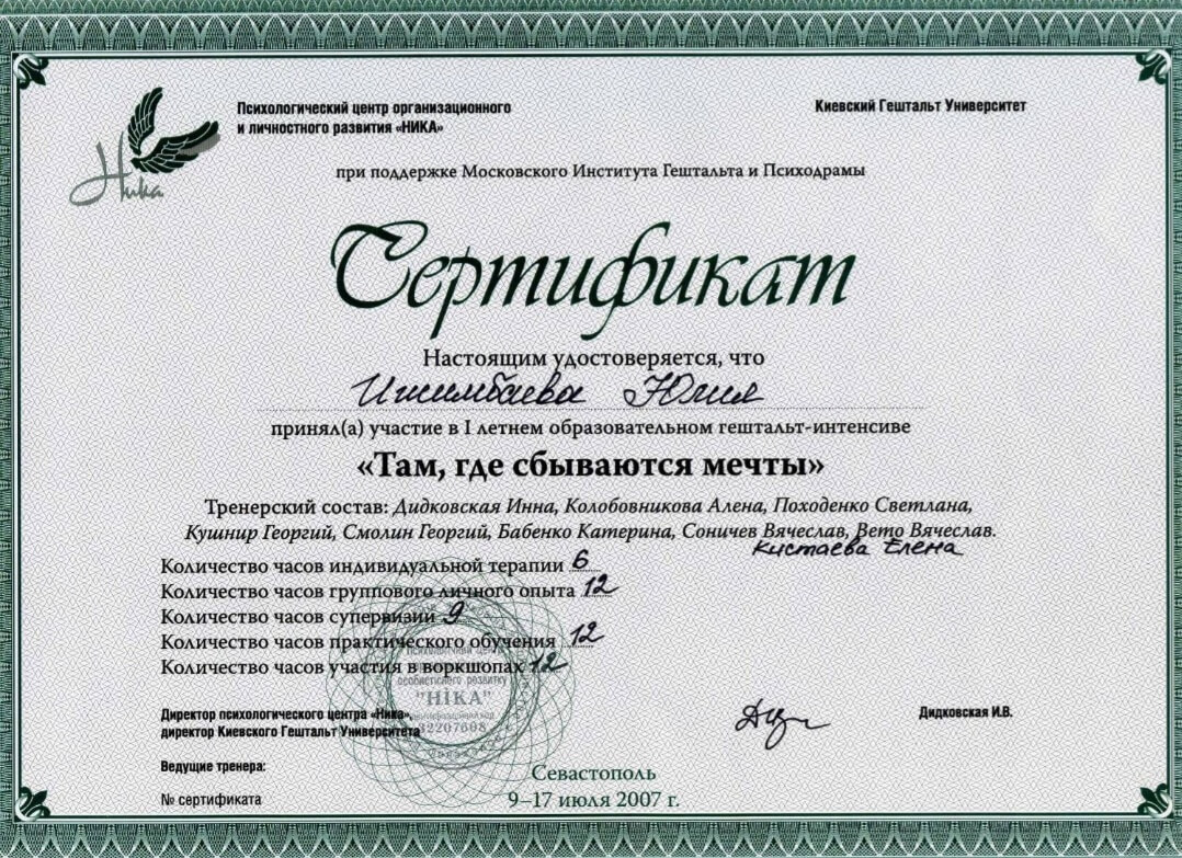 1. Сертифікований гештальт терапевт, Московський інститут гештальту та психодрами (МІГІП) 2004-2009