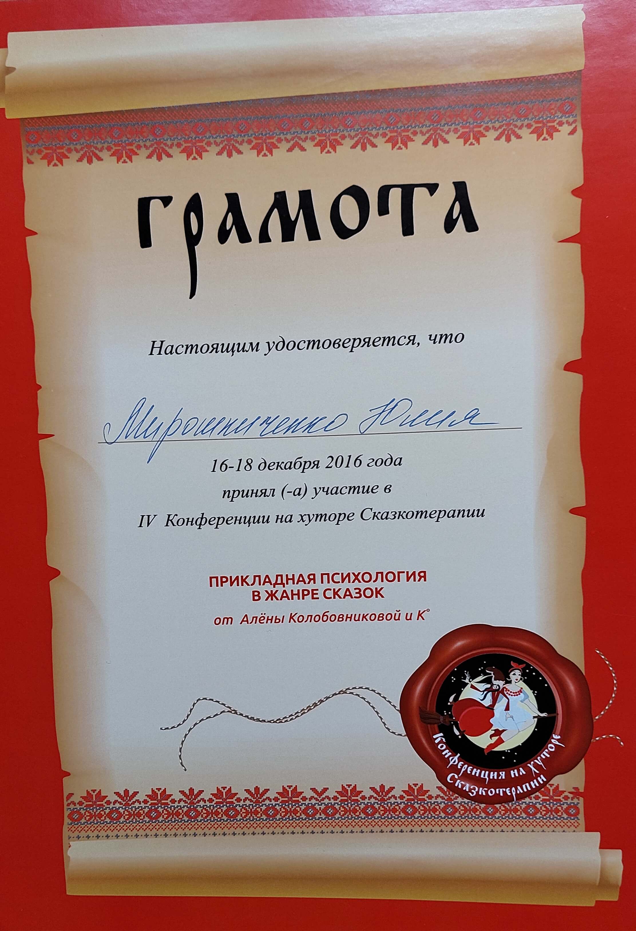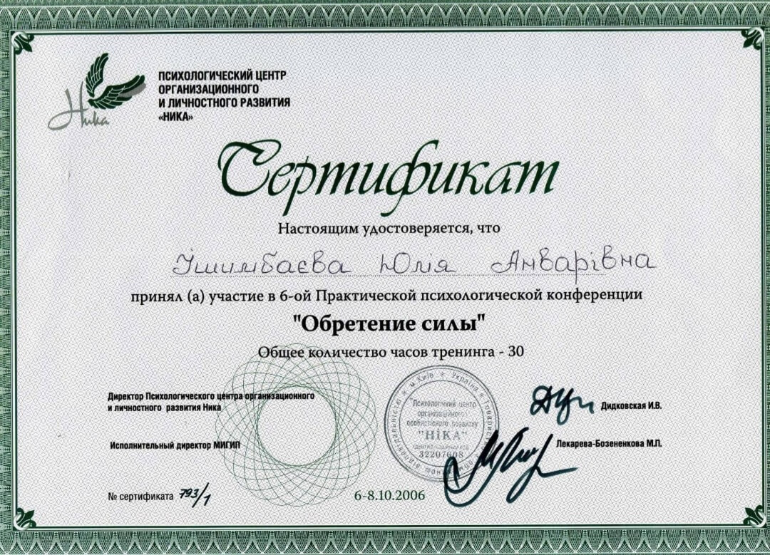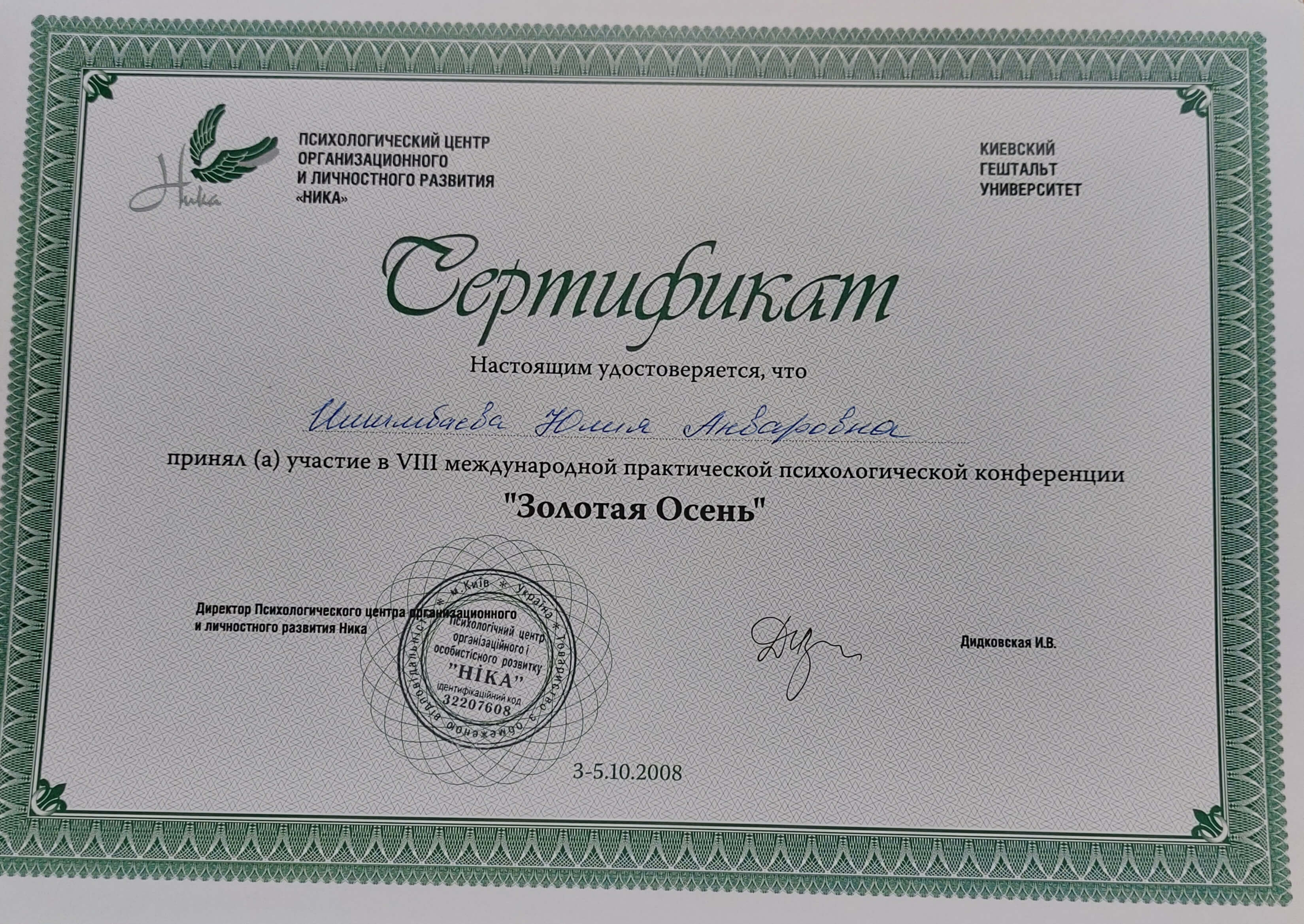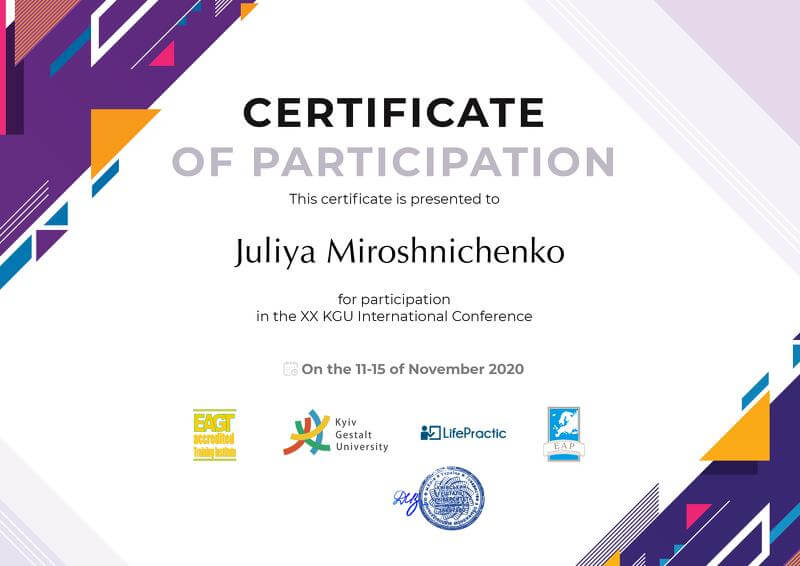 1. Сертифікований гештальт терапевт, Московський інститут гештальту та психодрами (МІГІП) 2004-2009