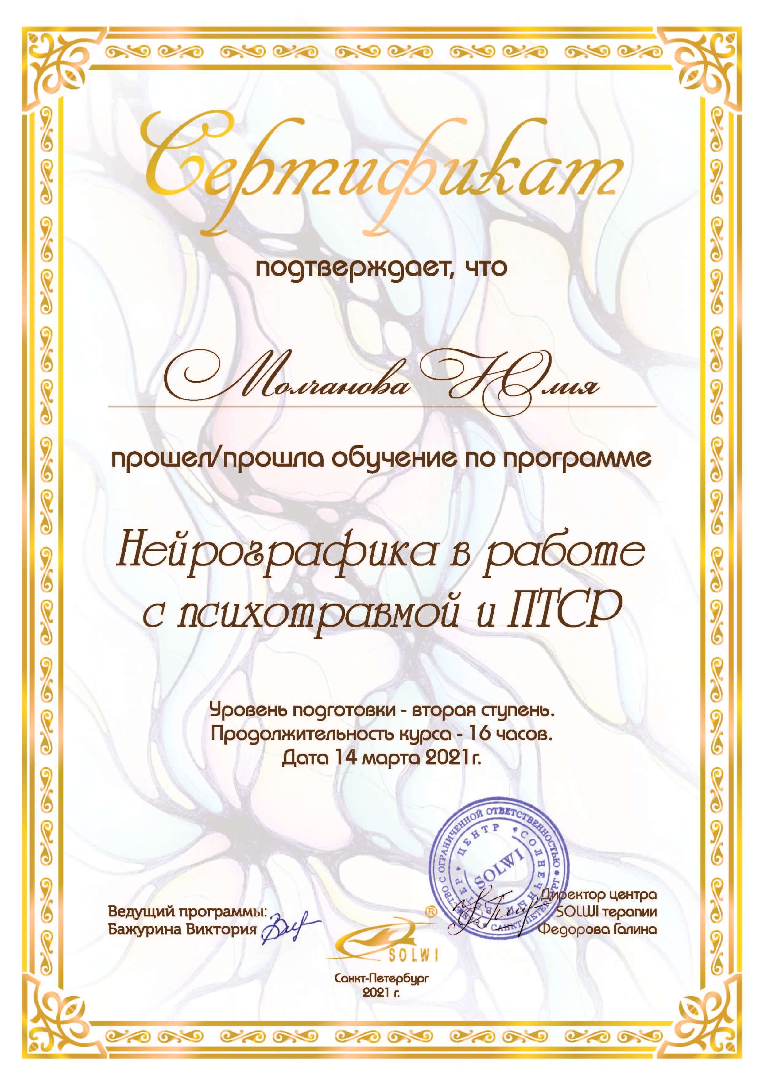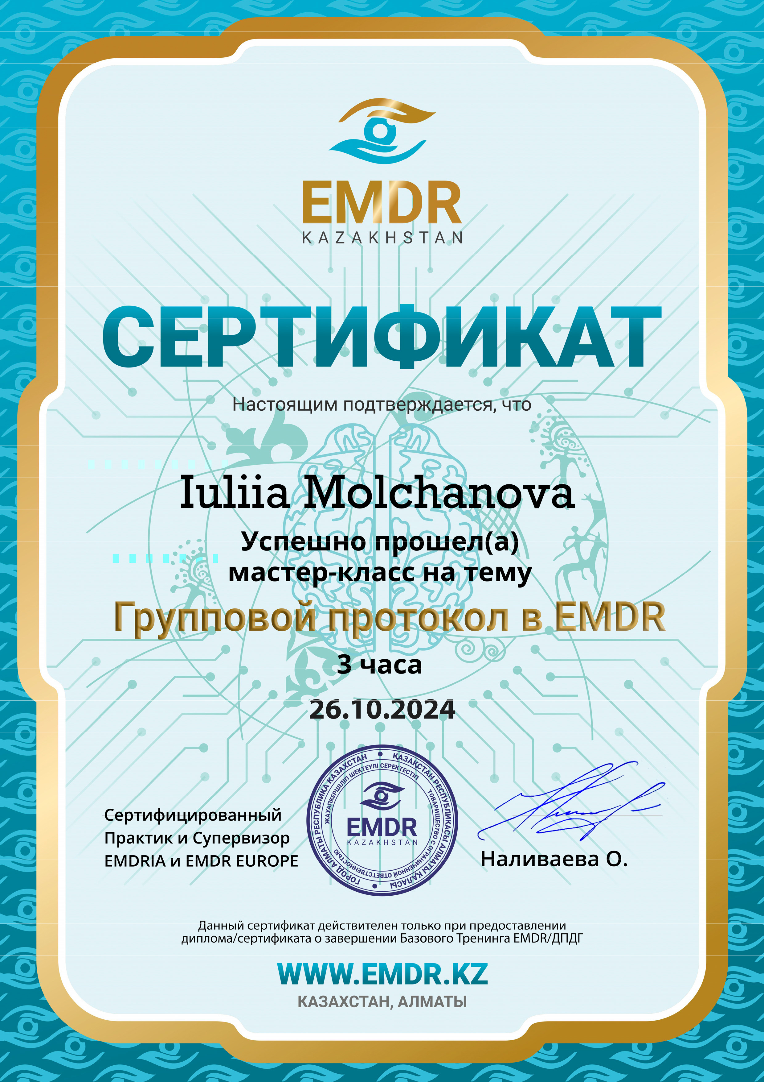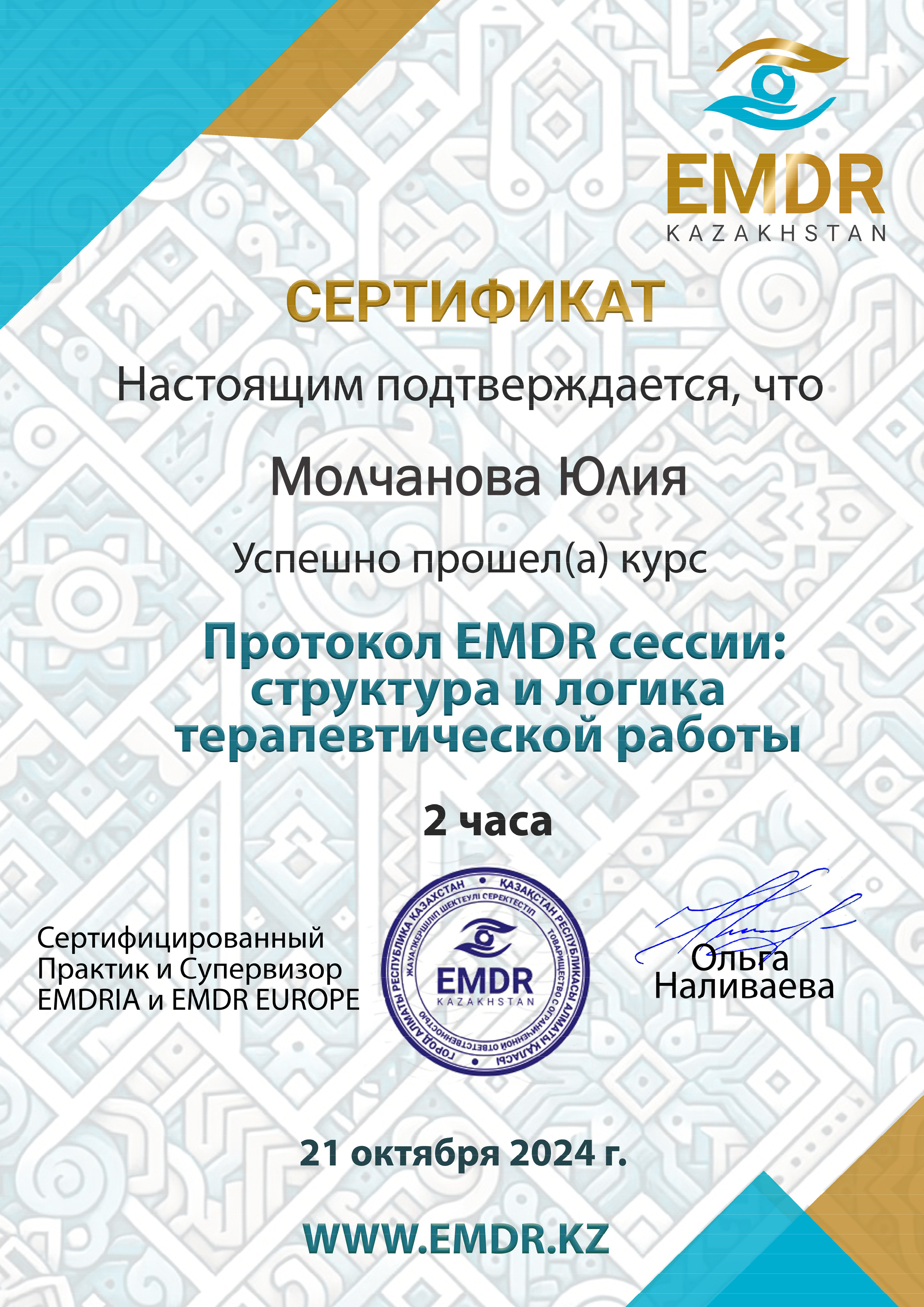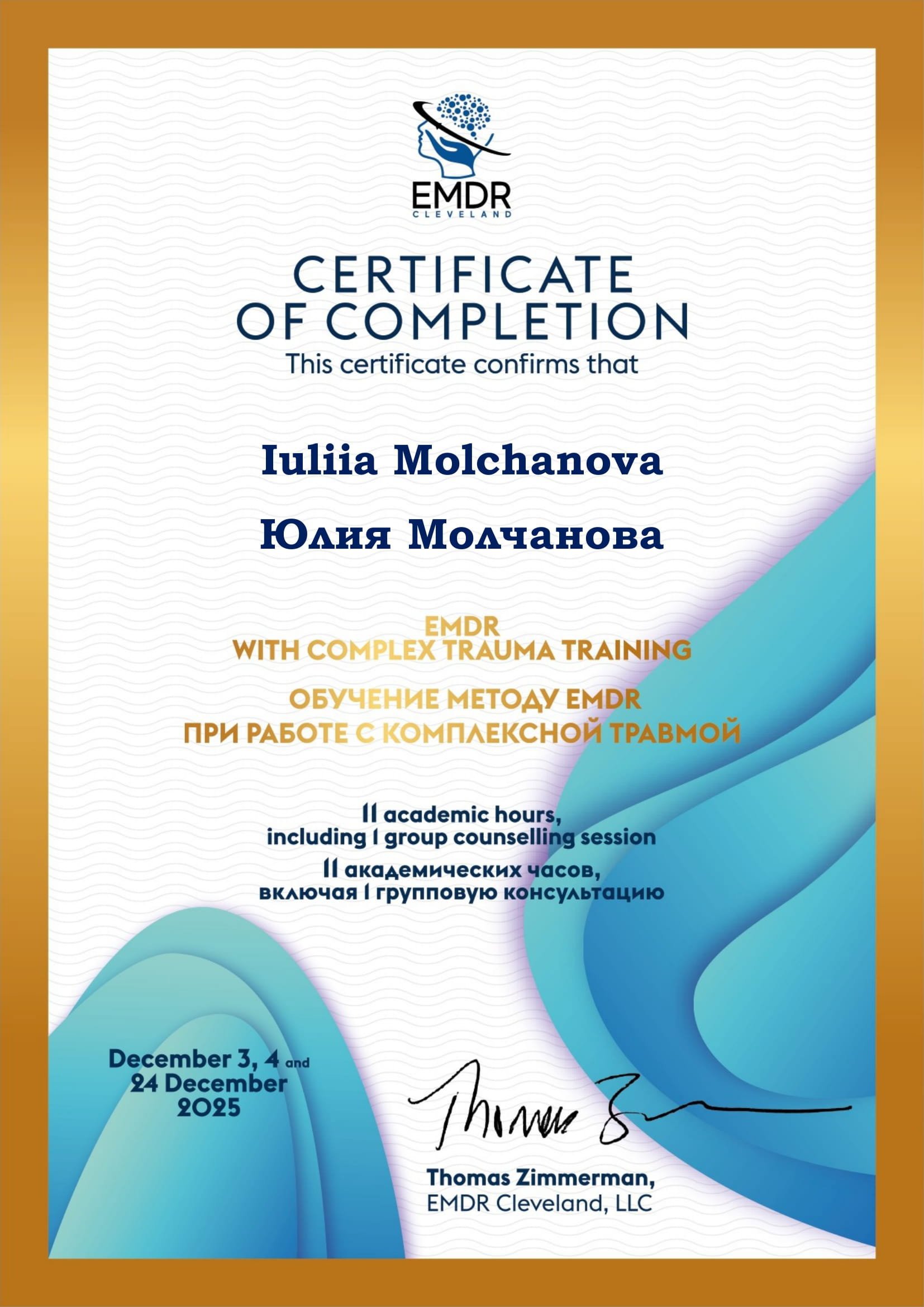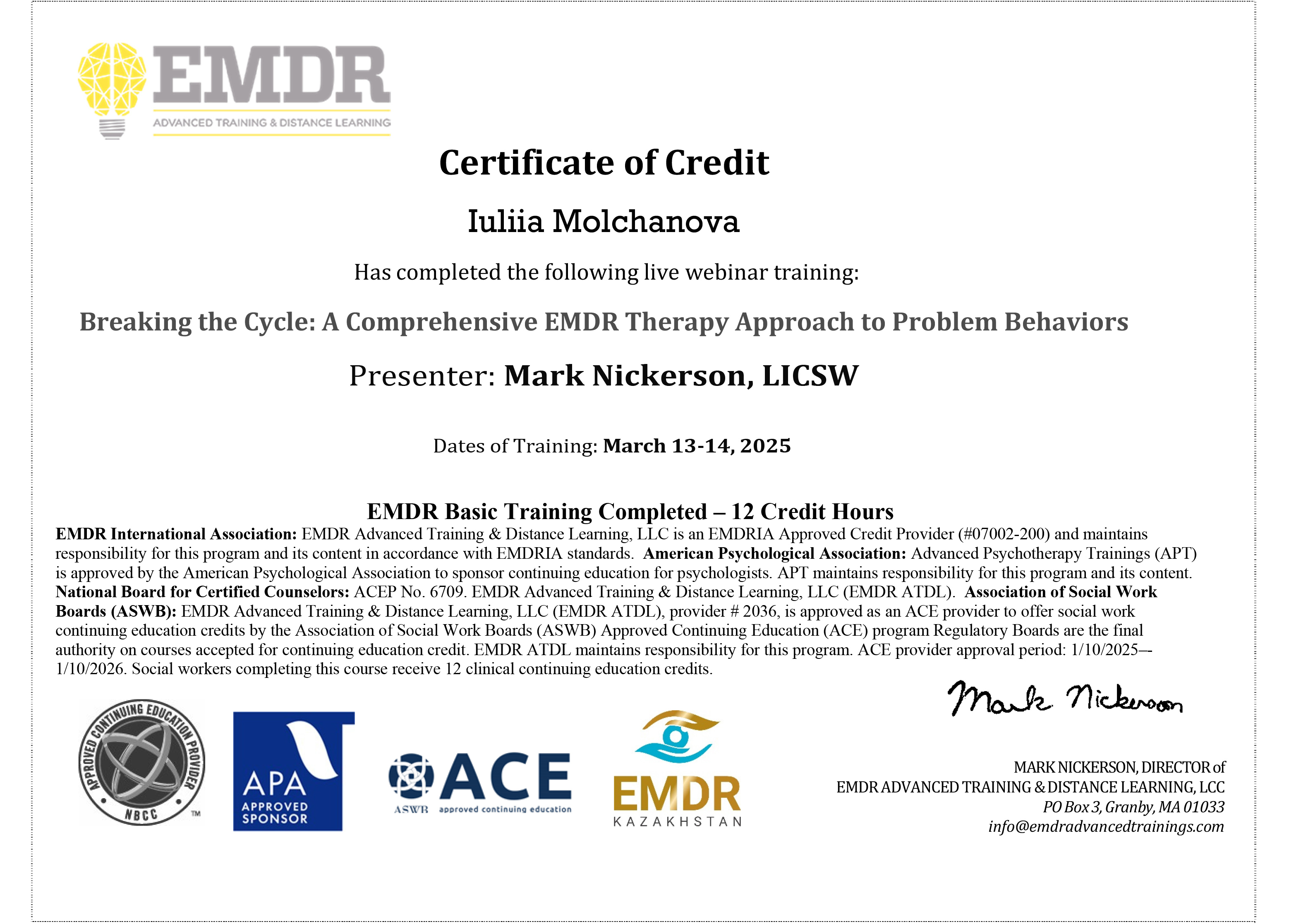 - травматерапевт в методах ДПДГ, EMDR (Mark Nickerson, Shapiro Institute, USA),