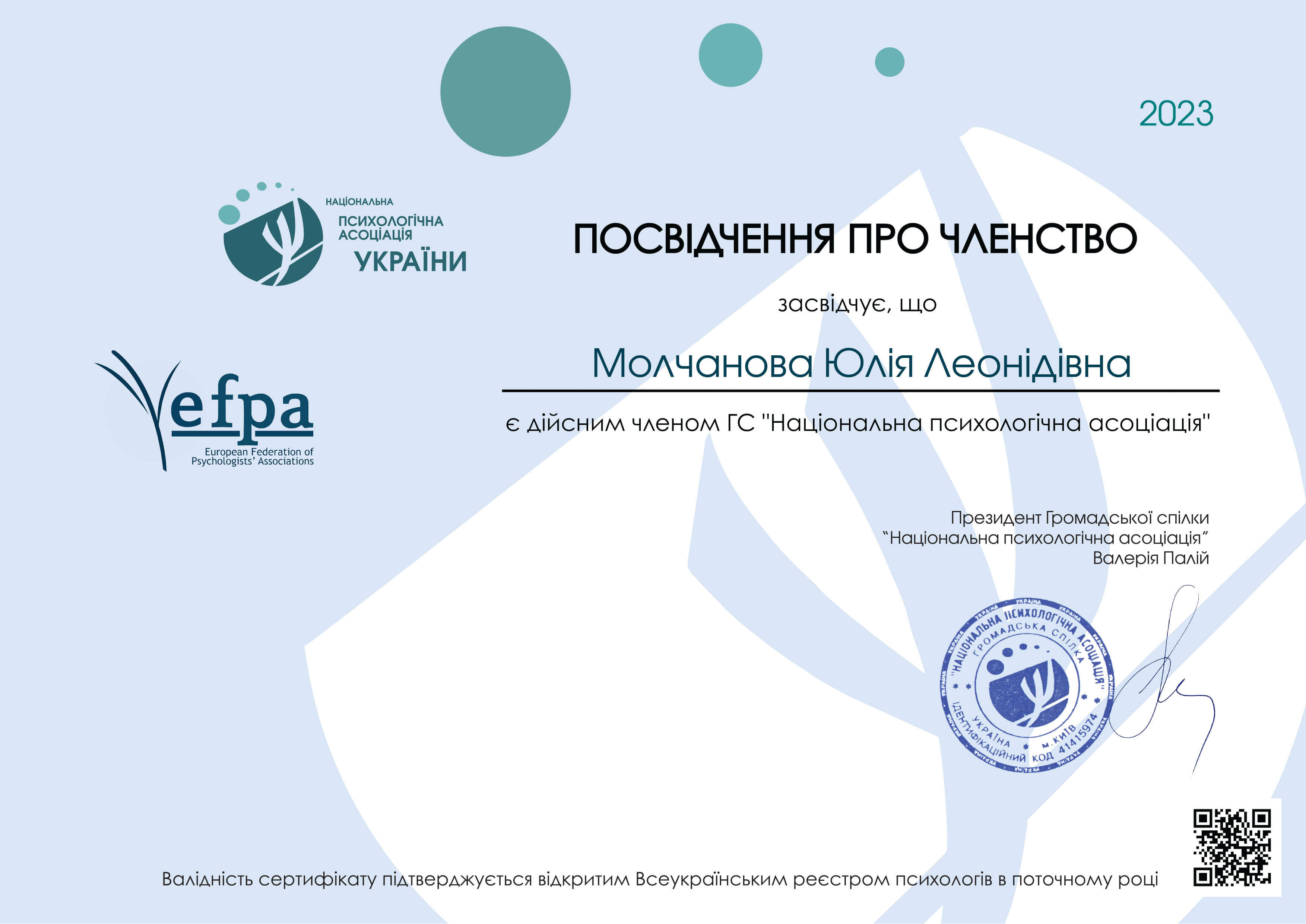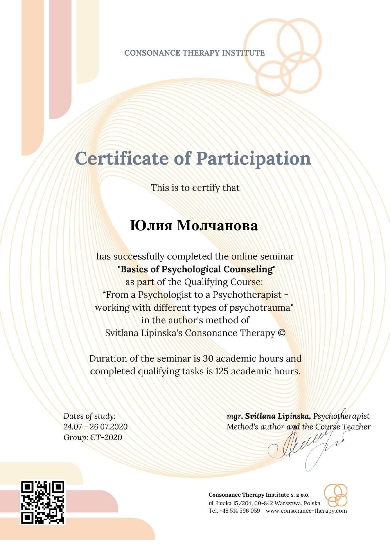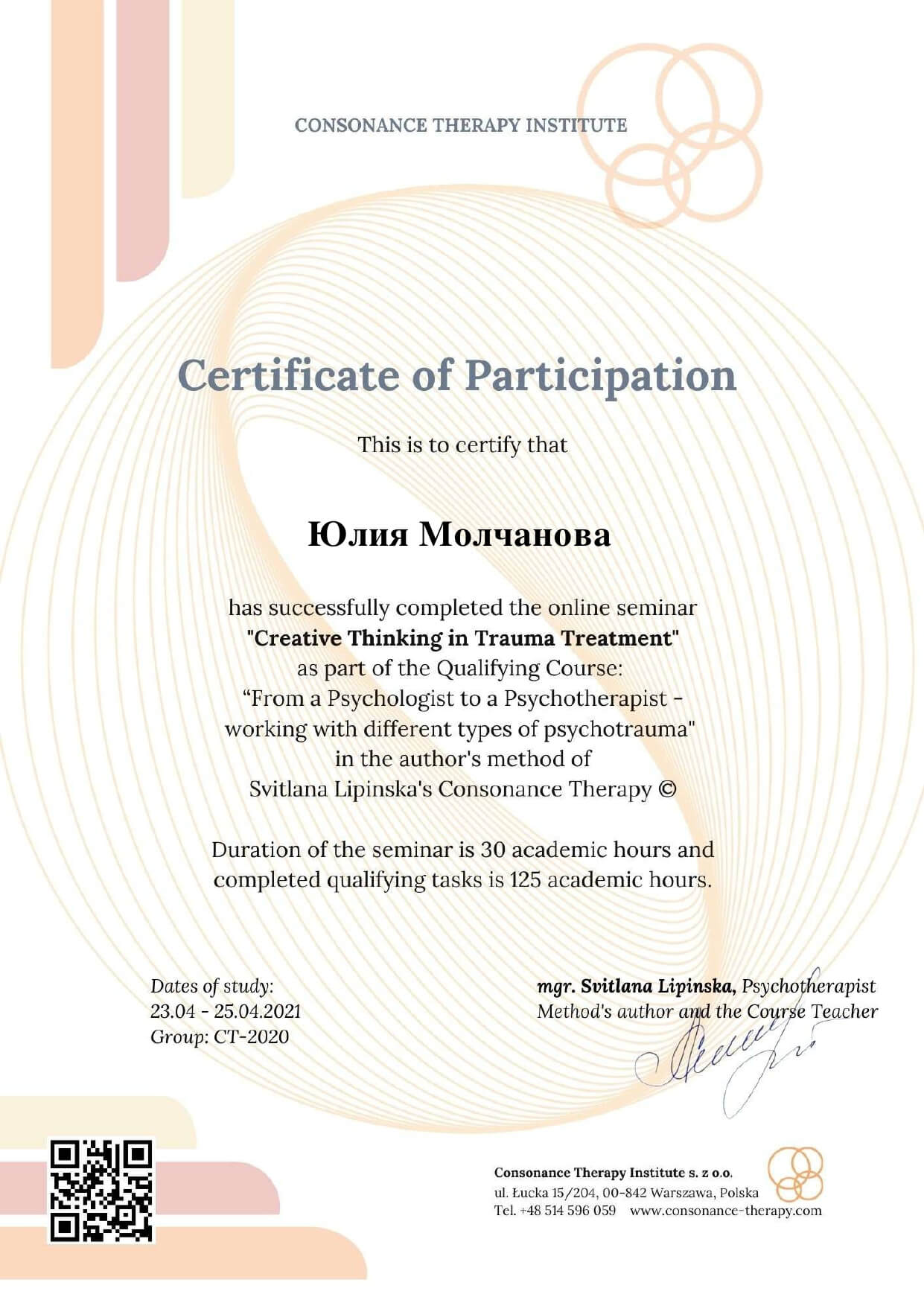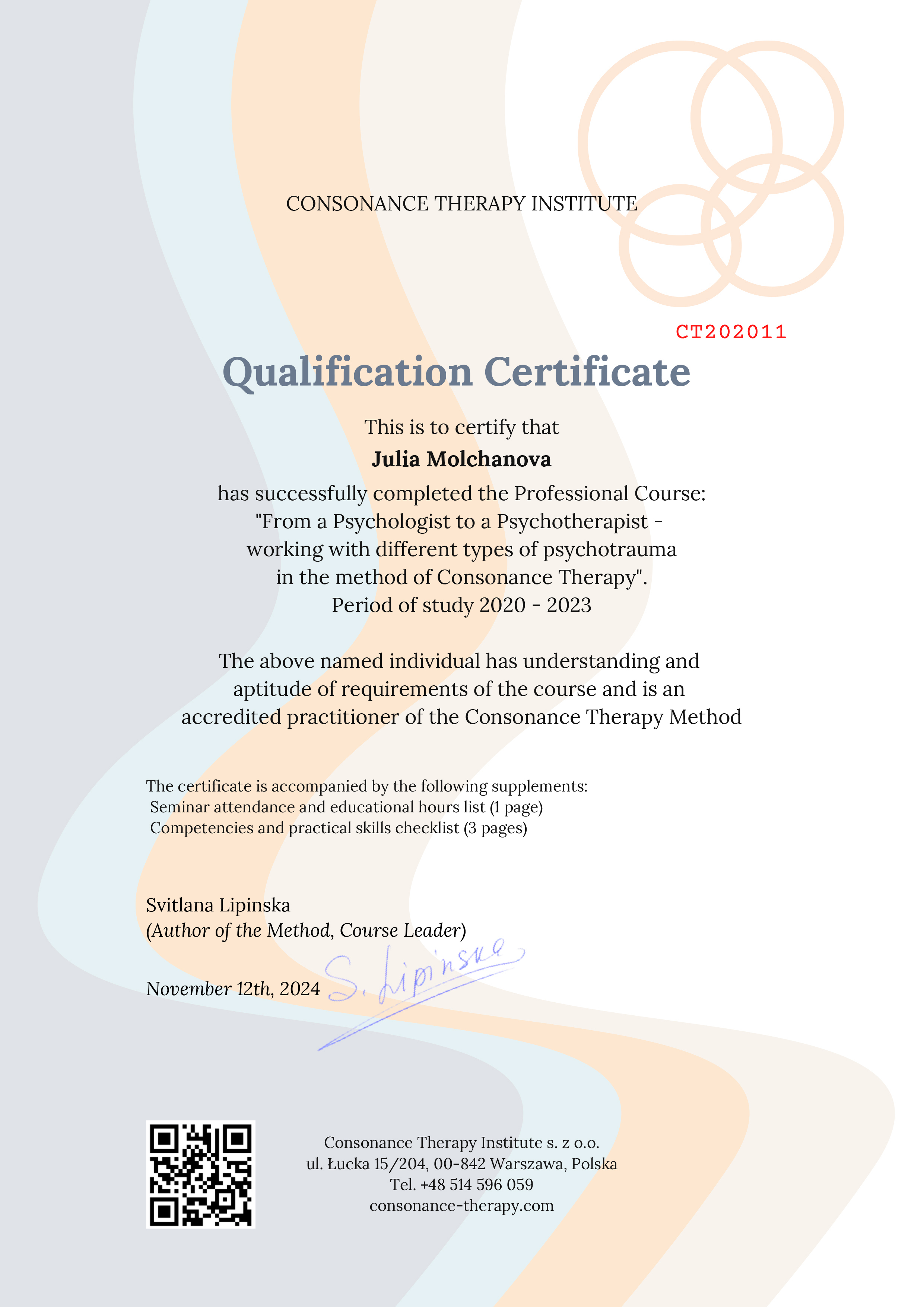- психотерапевт в методі Консонансної терапії (Institute of Consonance Therapy, Warsaw),