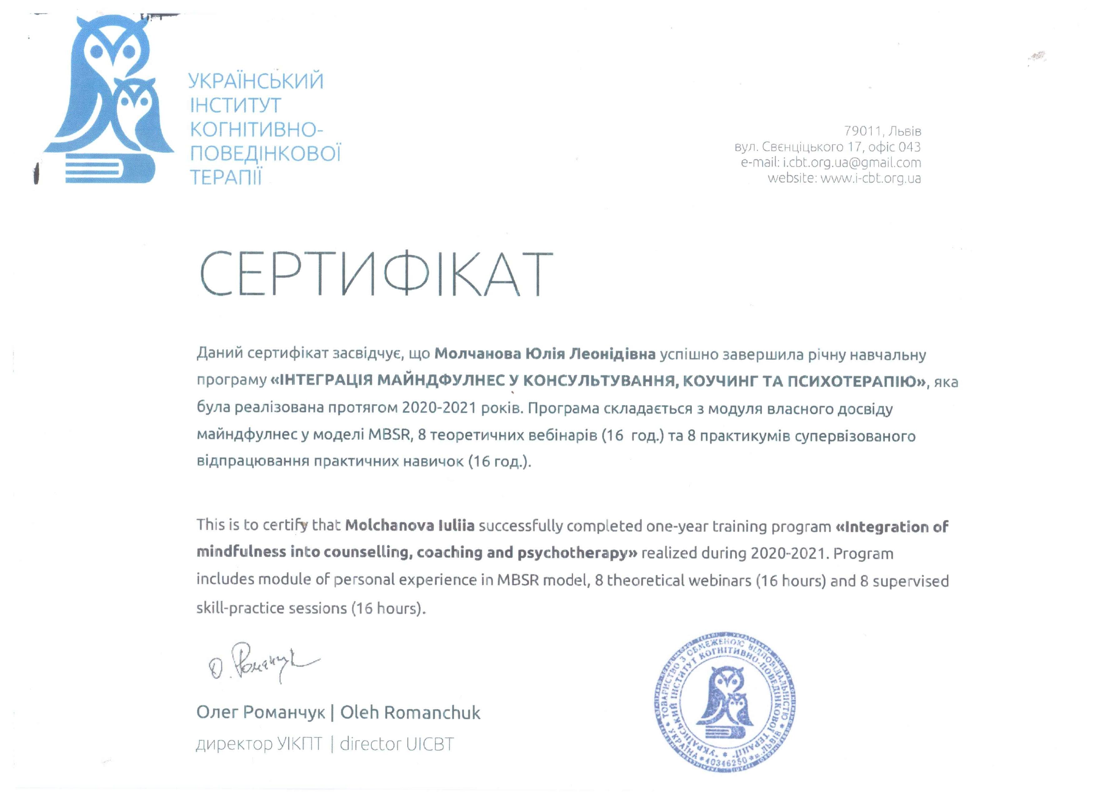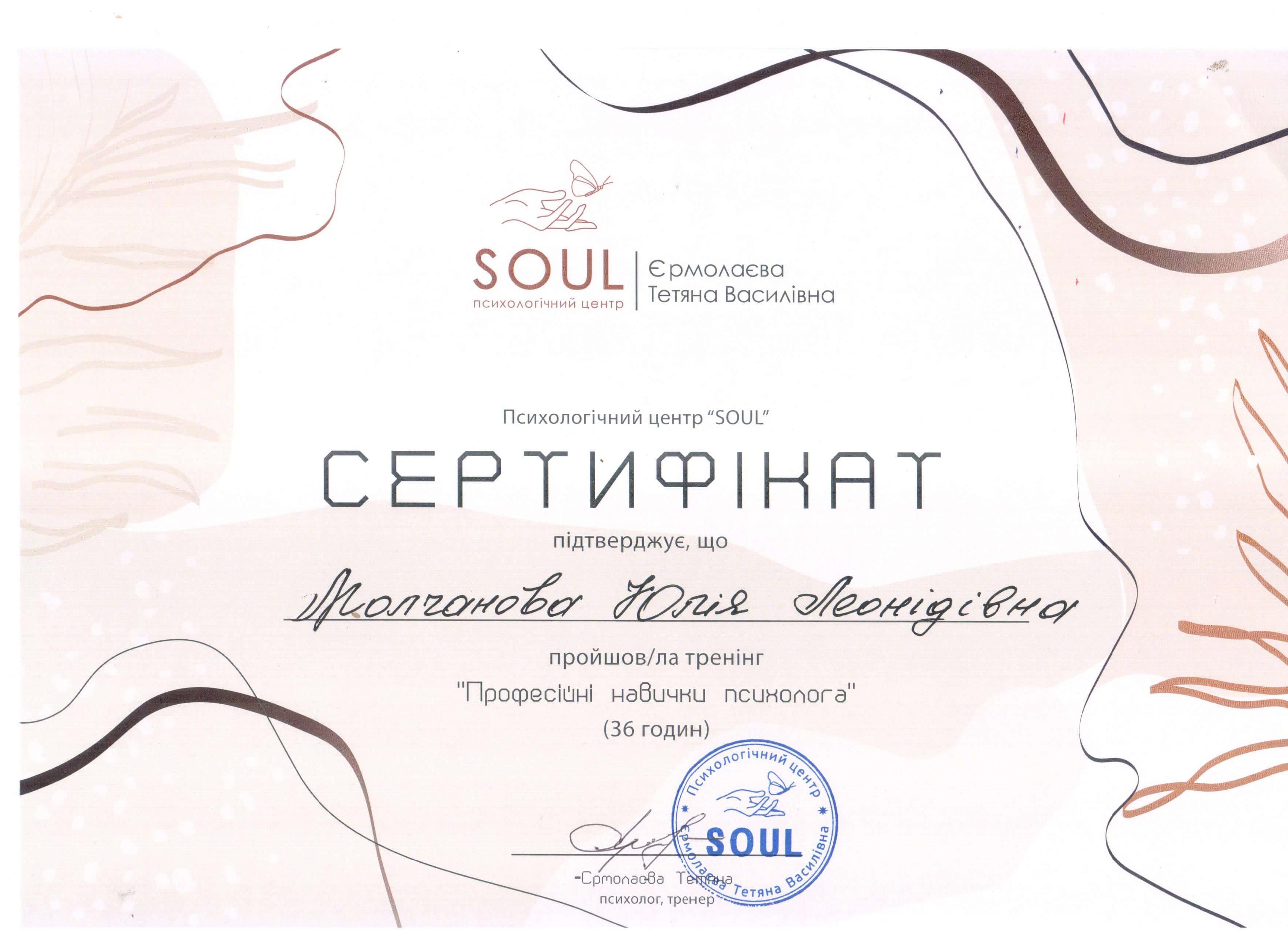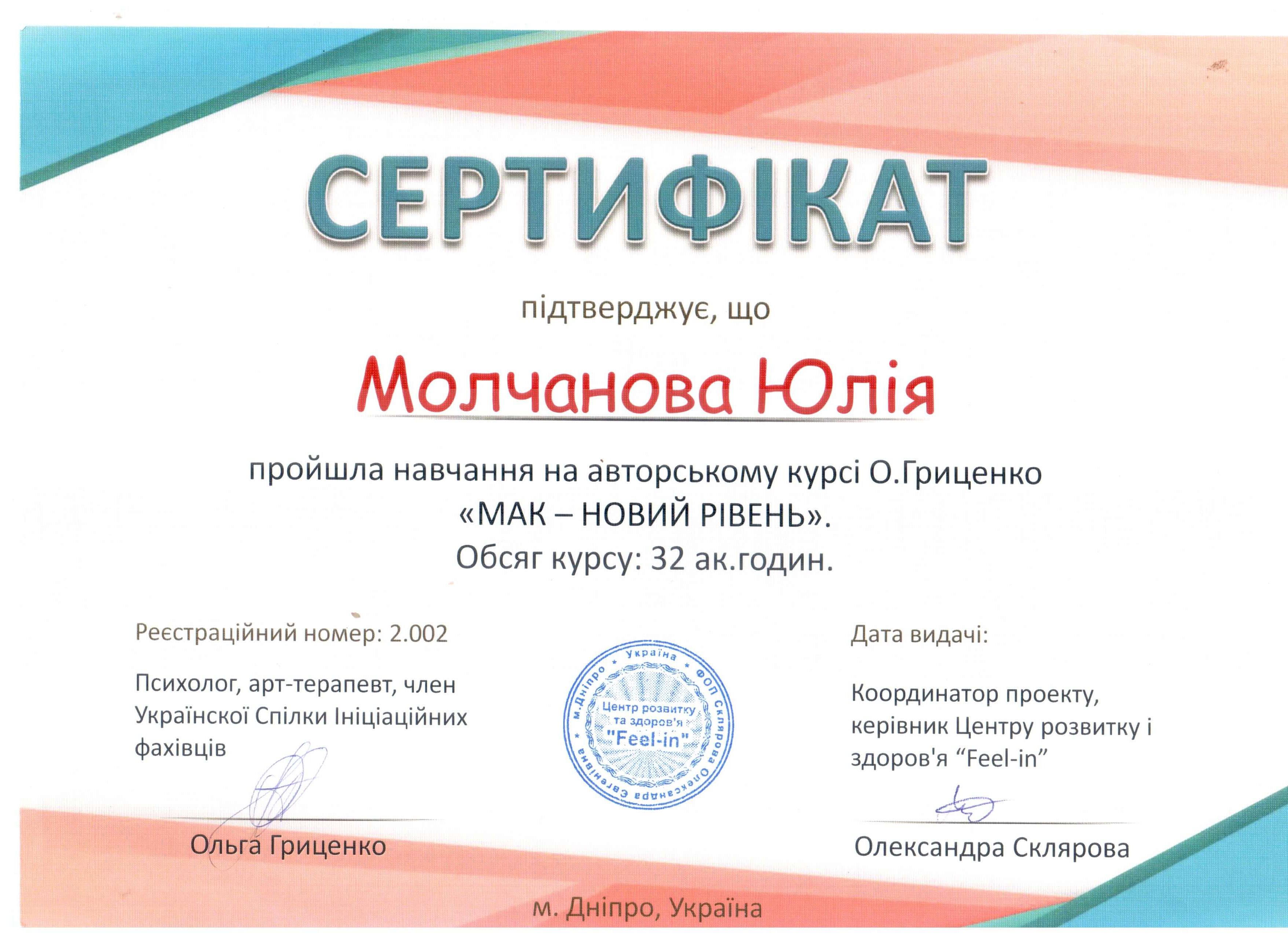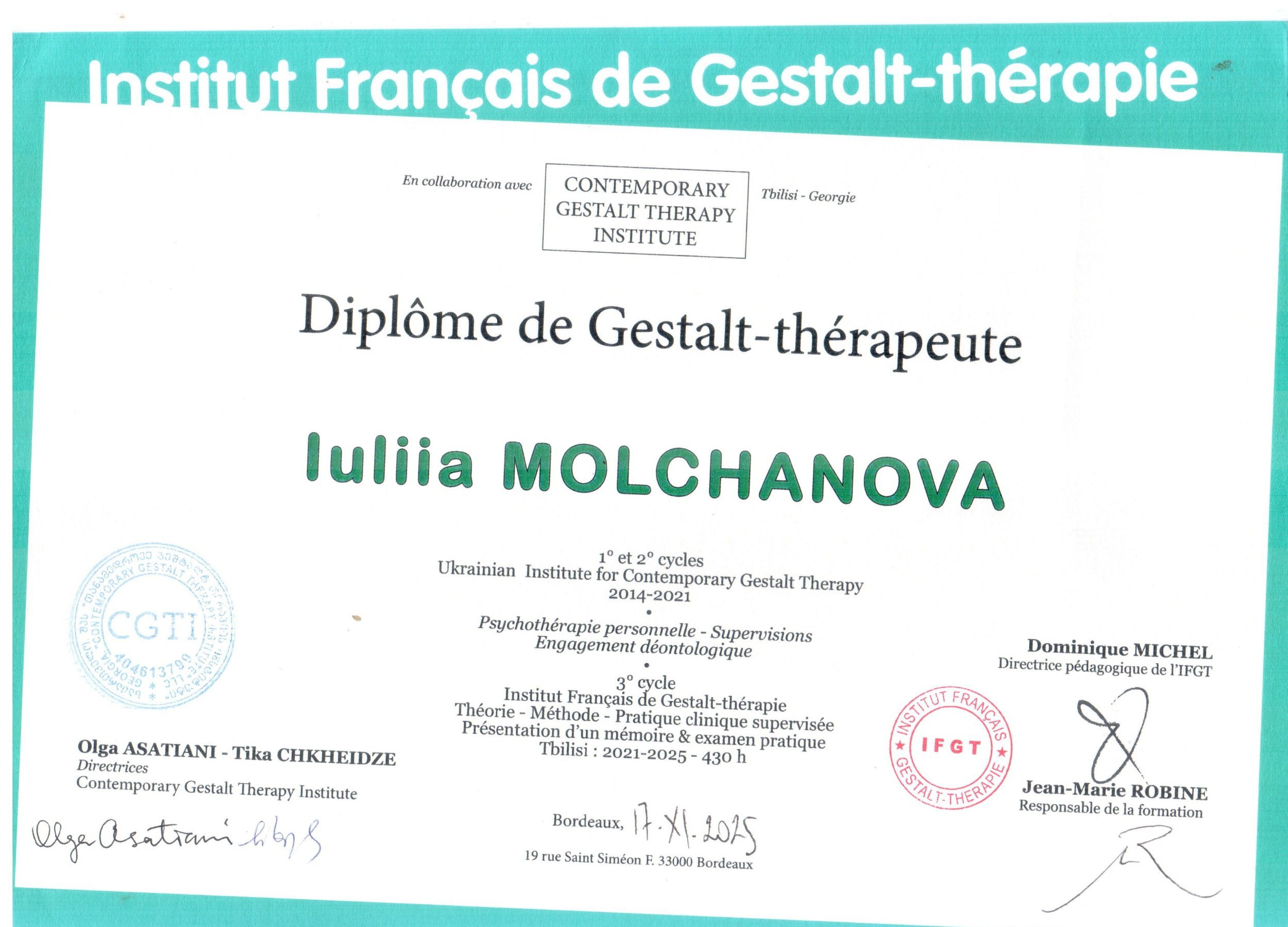 - гештальт-терапевт - Institut Français de Gestalt-thérapie, France (III ступіні)