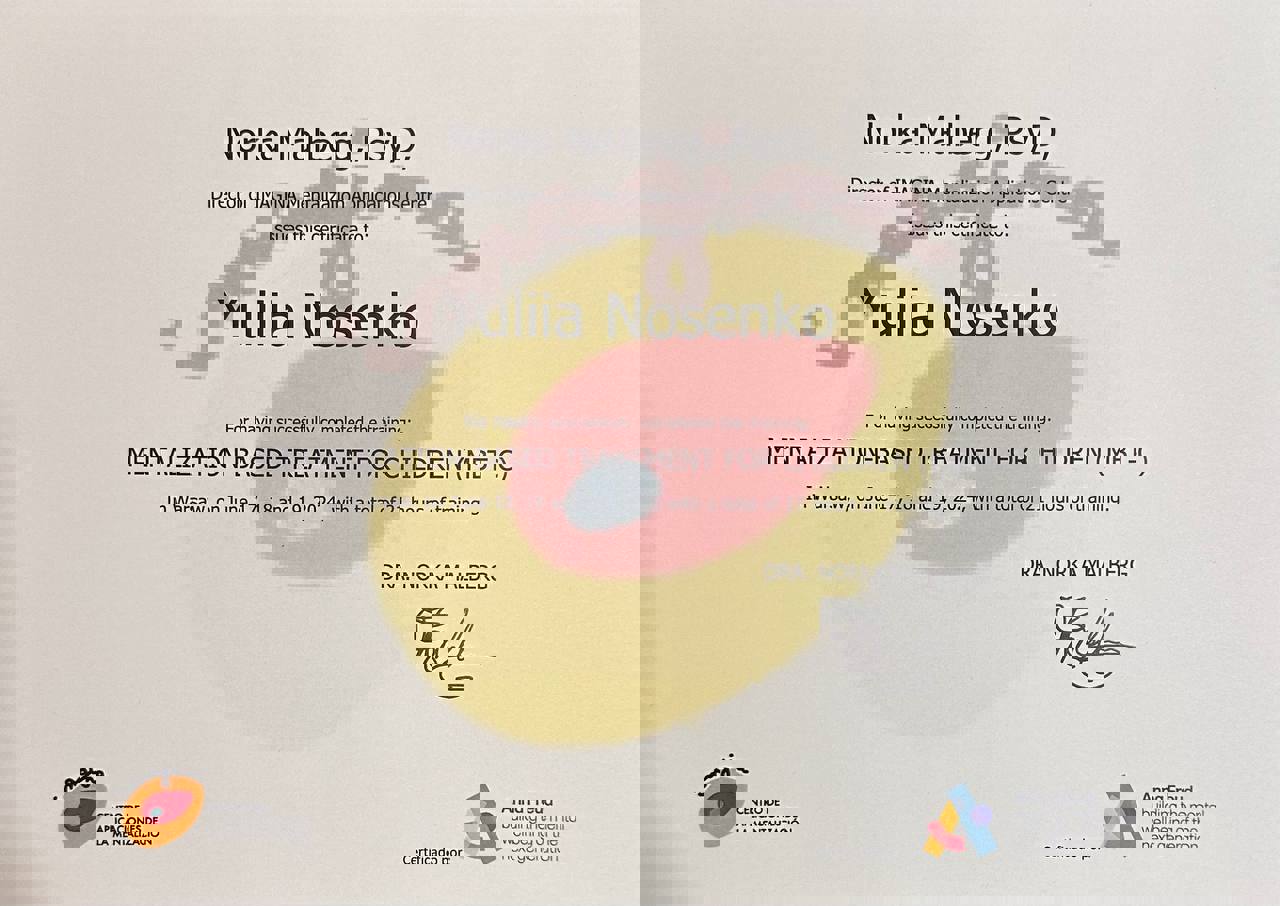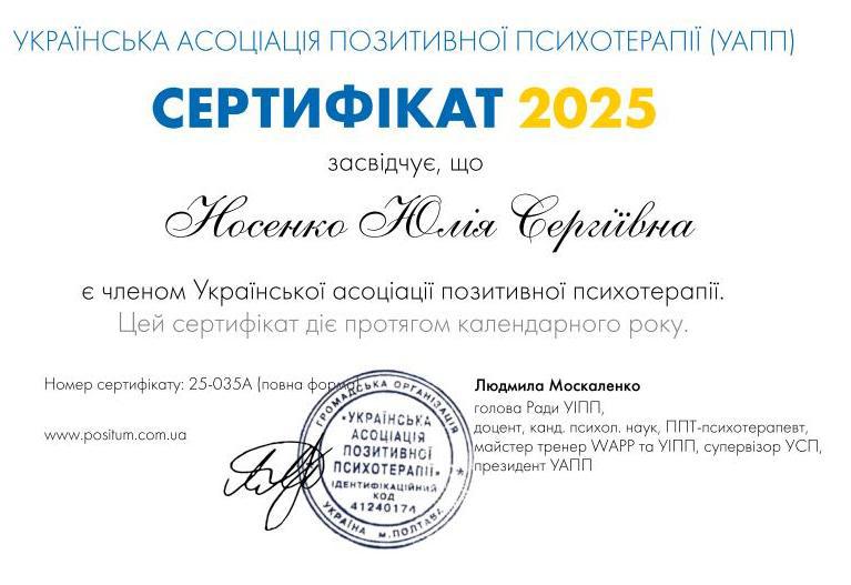Позитивна психотерапія — пройшла курс із позитивної психотерапії, що допомагає мені працювати з клієнтами, спираючись на їхні внутрішні ресурси та потенціал.