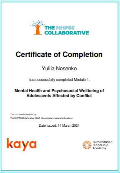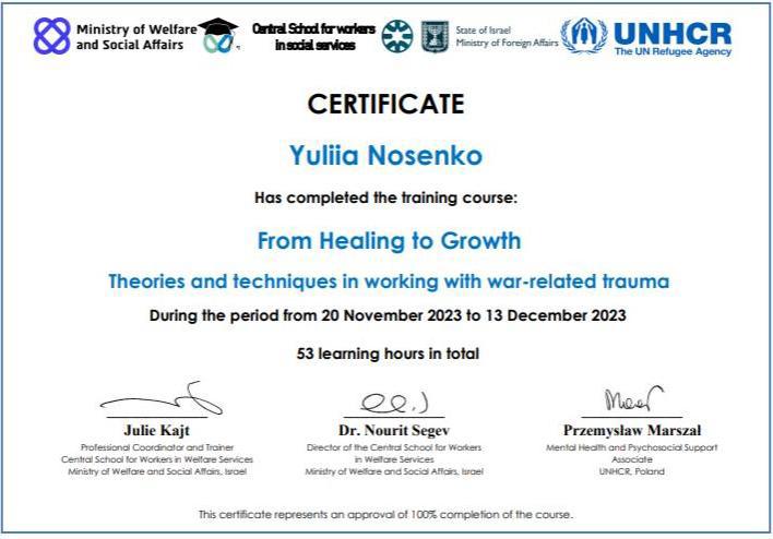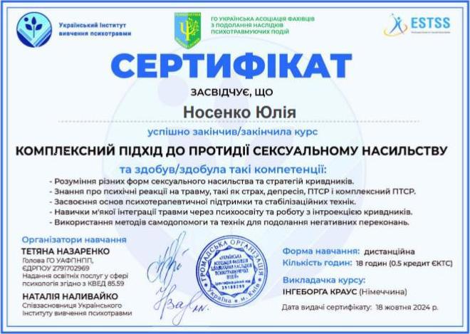 Кризовий психолог — я отримала кваліфікацію у кризовій психології, що допомагає мені підтримувати людей у складних та кризових ситуаціях.