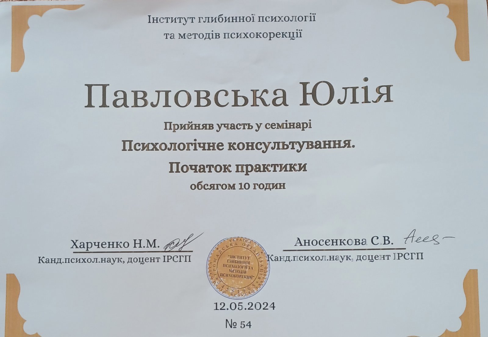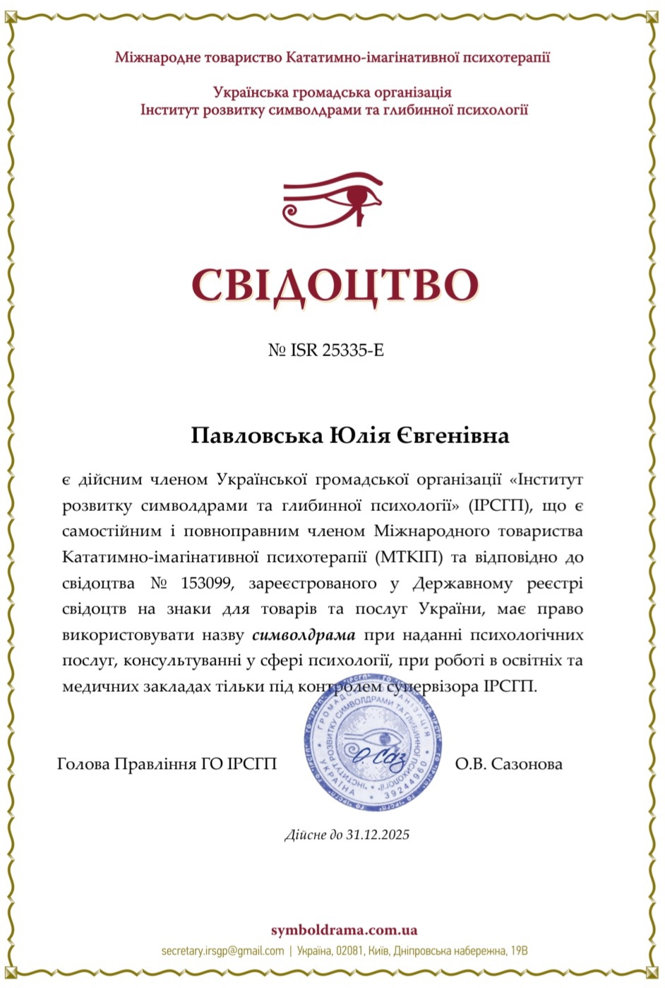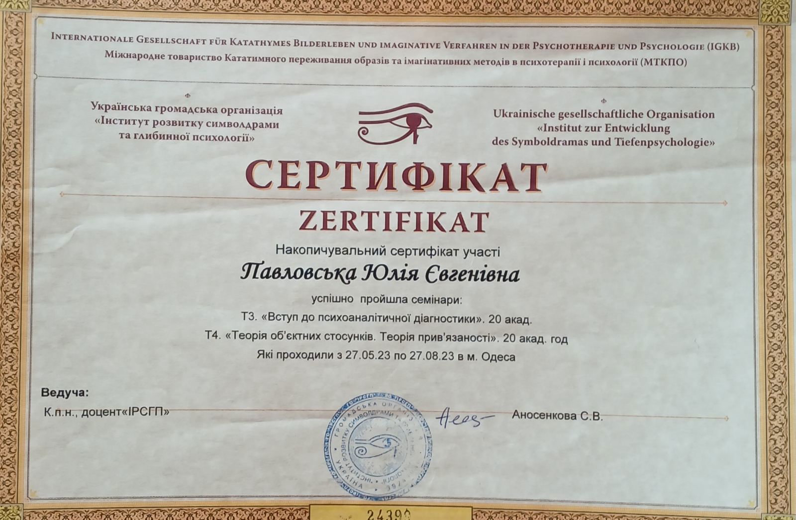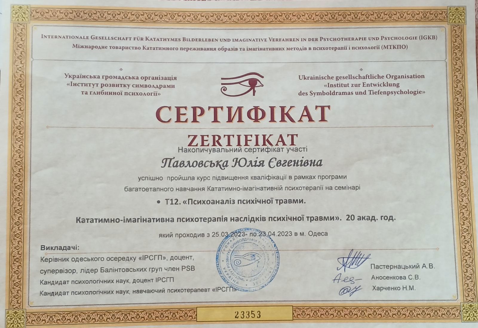 З 2021 року проходжу навчання в МТКІП для підвищення кваліфікації в рамках програми багатоетапного навчання Кататимно-імагінативної психотерапії.