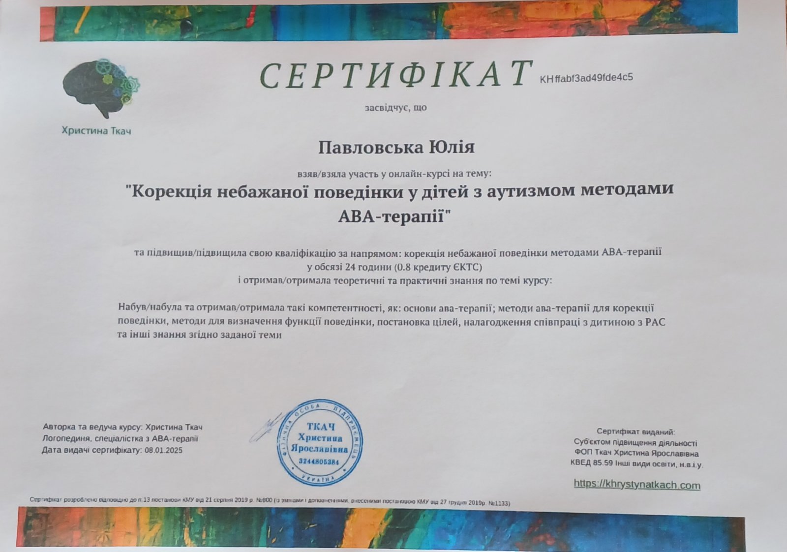 У 2025 році пройшла онлайн навчання "Корекція небажаної поведінки у дітей з аутизмом методами АВА-терапії" К. Ткач