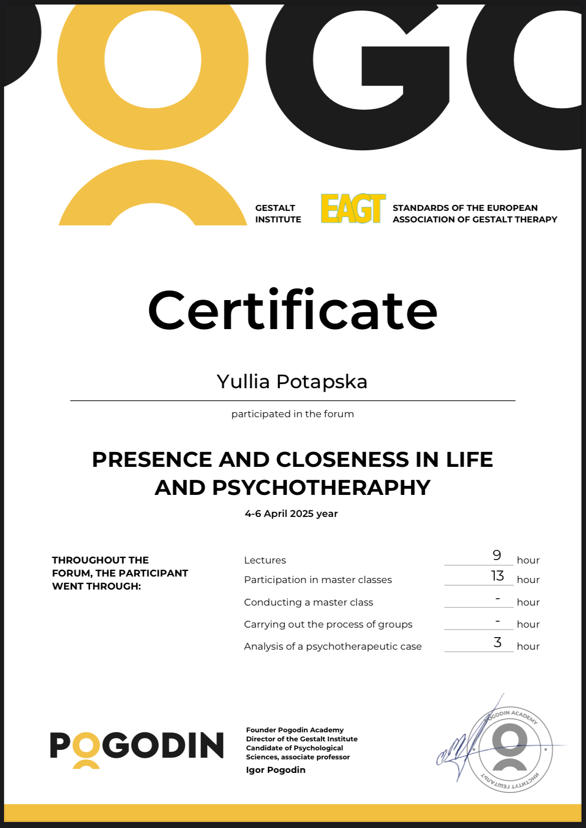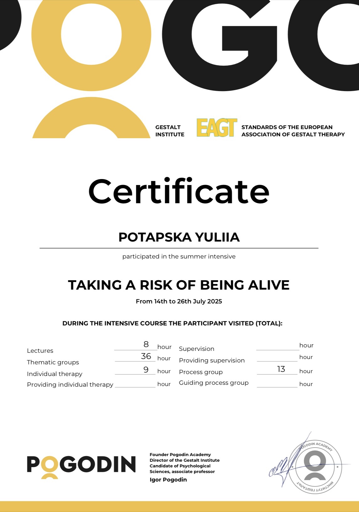 Спеціалізації, які закінчила: "Кризи і травми" та "Діалогово-феноменологічна модель в гештальт-терапії".