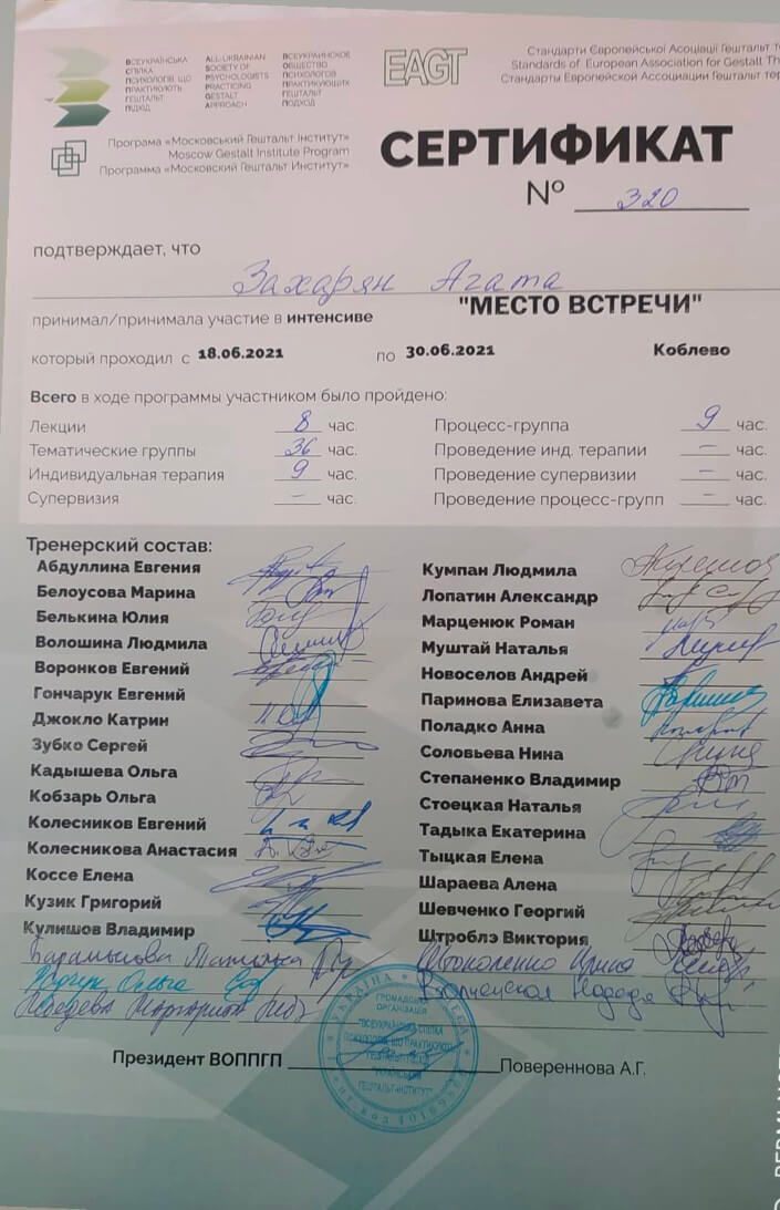 До Агаты я ходила на терапевтические группы офлайн, это был достаточно познавательный опыт в моей жизни. Мы работали с метафорическими карточками, поднимали в группе тему, которая смущала всех одновременно. Очень понравился ее подход: Агата не дает советов, она заставляет своими вопросами заглянуть внутрь души и найти ответ в себе. Иногда бывают такие шокирующие ответы, такая неприятная правда о себе, но даже в таких ситуациях Агата дедуктивно-методическими вопросами могла помочь дойти до истины. За 5 сессий групповой терапии я избавилась от страха находиться среди людей, стала больше социализироваться, стала более открытой, перестала бояться защищать свои границы. После сессий осталось много положительных мнений для дальнейшего познания себя как личности. Агата профессиональный психолог, можно увидеть, что было постоянное развитие, потому что он практикует различные методы, чтобы помочь человеку решить его проблемы/вопросы, избавиться от тревожности и почувствовать себя и свою жизнь. Агата искренняя, положительно настроенная активная, сильная и яркая личность.
