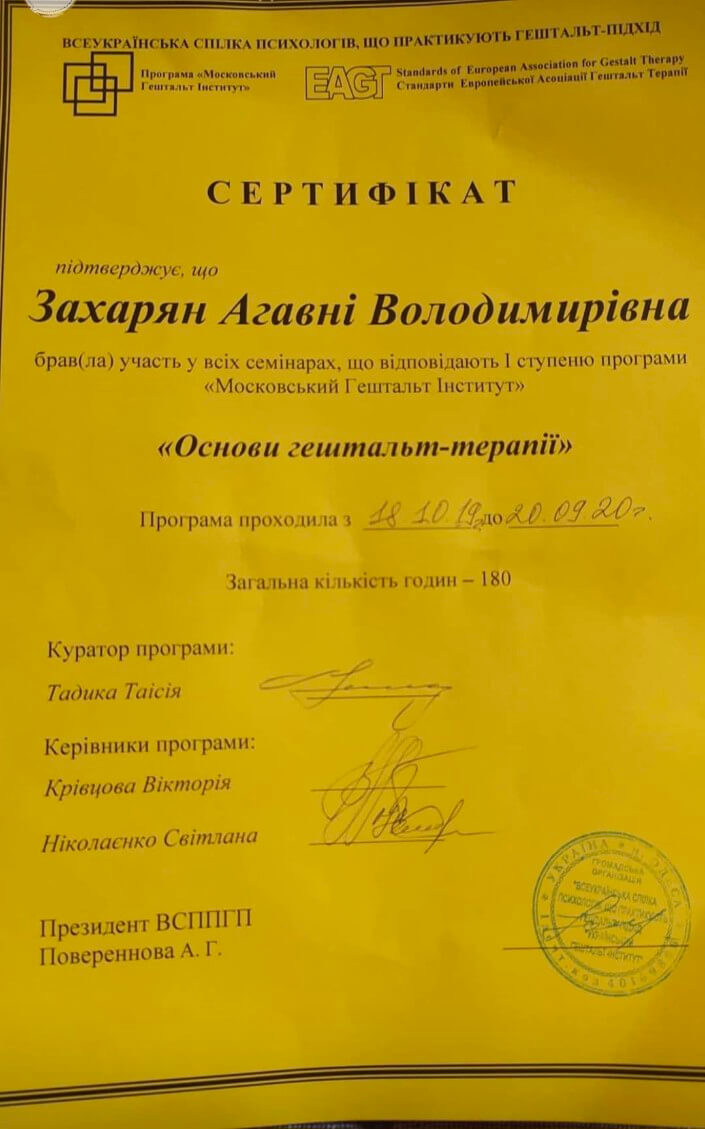ХНУ им .Каразина , факультет Психологии, магистр психологии. Московский гештальт институт , 2 ступень .