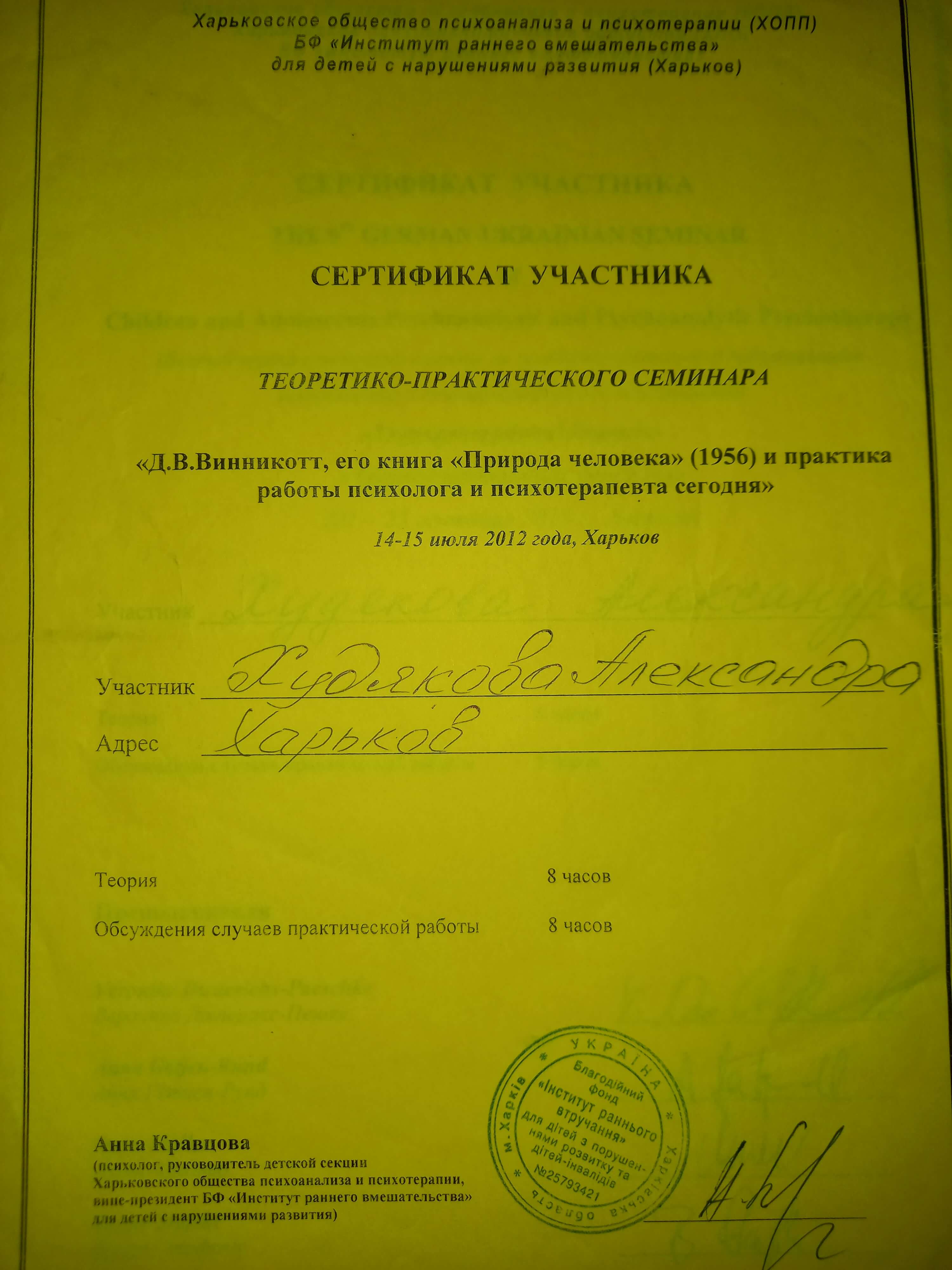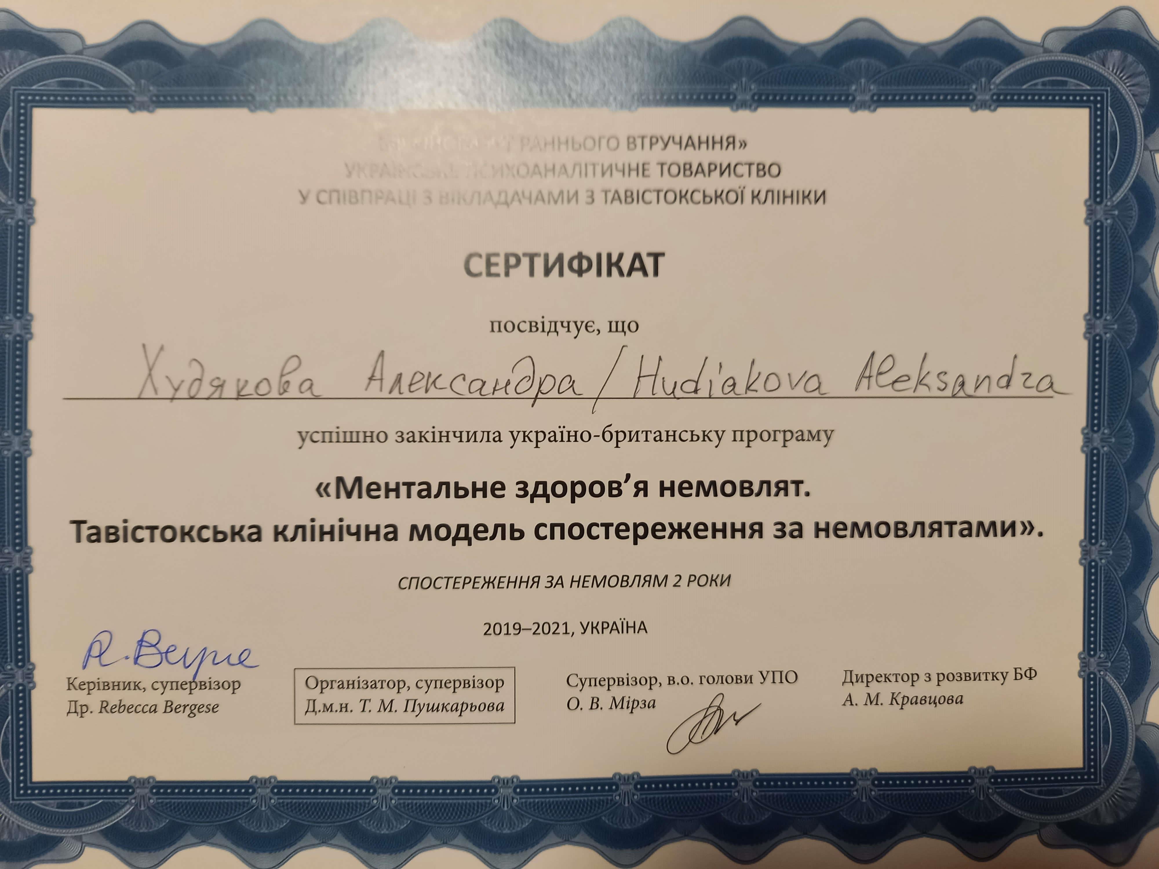 Высшее. Практическая Психология ХНПУ им. Сковороды ИПО 2009 - 2011 Первое высшее ХГУИ им. Котляровского 1997 -2001 Дополнительное обучение: Курс «Классические теории детского развития» 2009-2010г; Курс «Детско-родительские отношения» 2010-2011г; семинары по арт-терапии; закончила обучающий трех годичный курс Харьковского общества психоанализа и психотерапии. 2016-2020 Обучение психоаналитической психотерапии ( European Federation of Psychoanalytic Psychotherapies) Курс наблюдения за младенцем (Лондон) Конференции Украинского общества психоанализа и психотерапии.