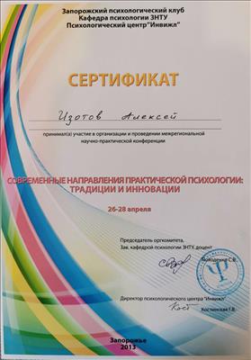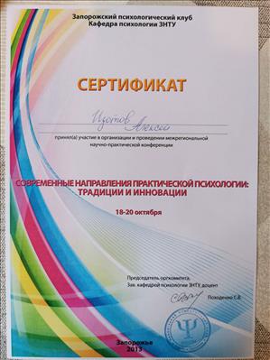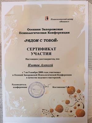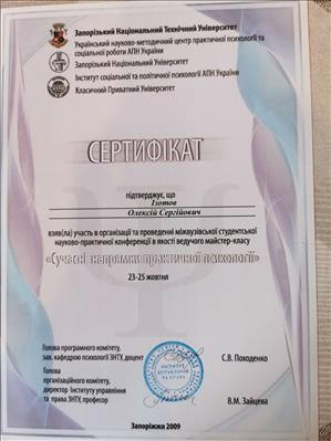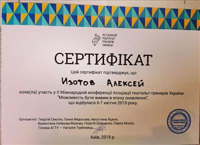 Окончил в 2016г. Киевский гештальт университет, ведущий тренинговых и терапевтических групп