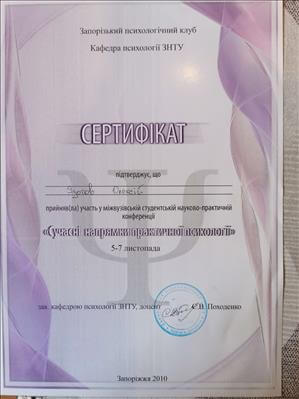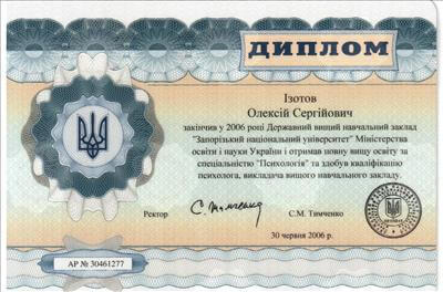 Окончил в 2006 г. Запорожский Национальный Университет, практический психолог, магистр.