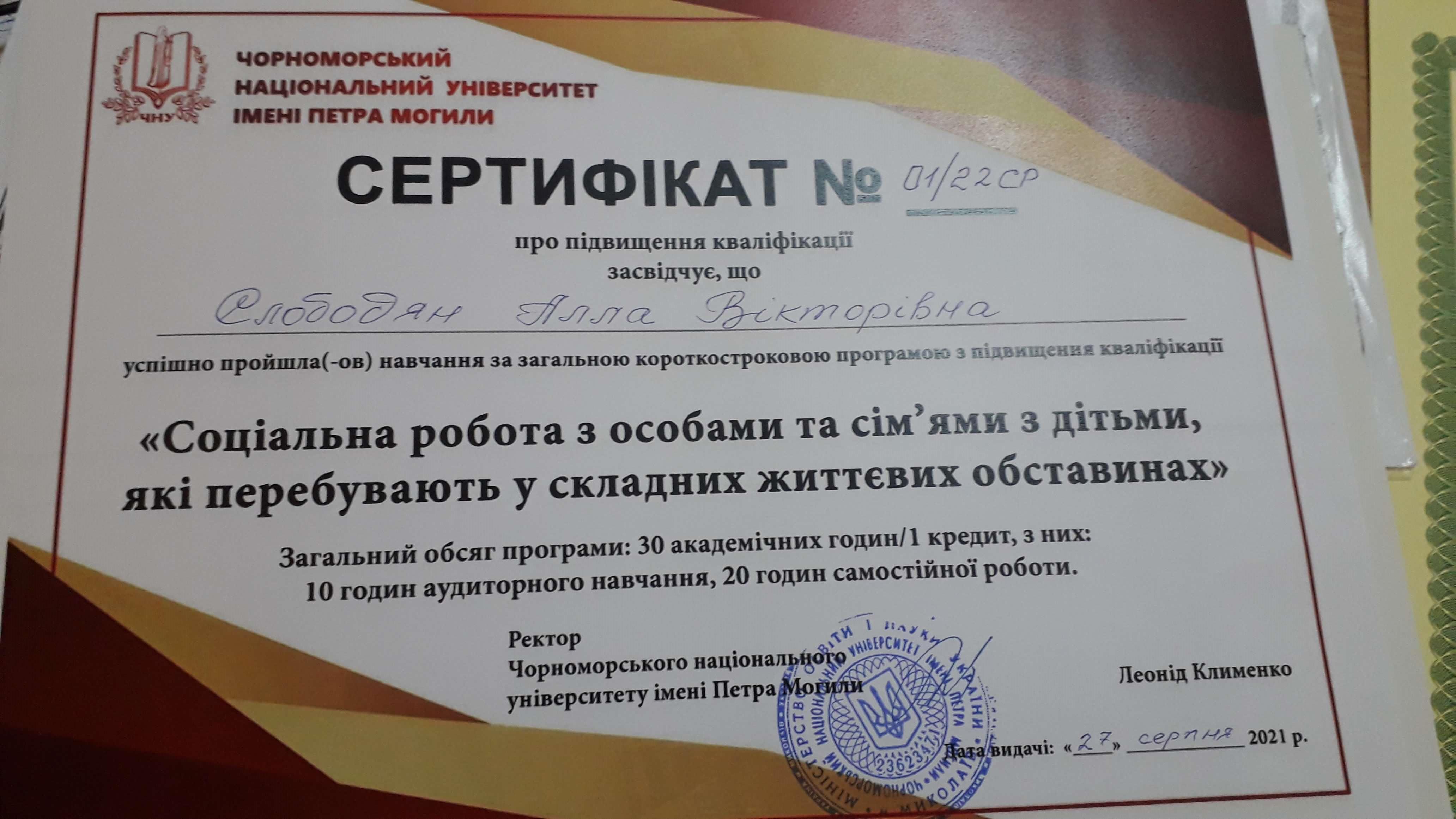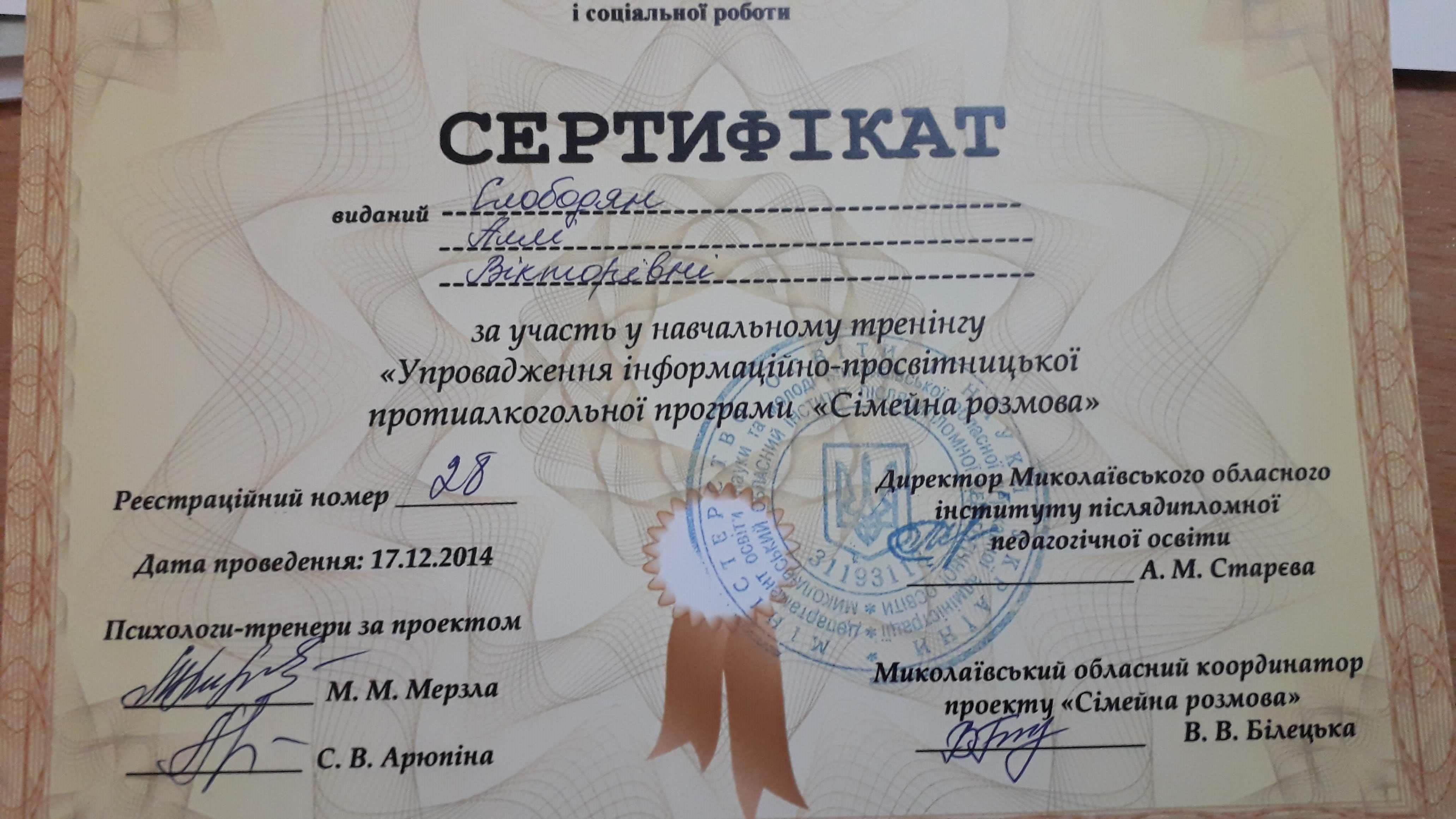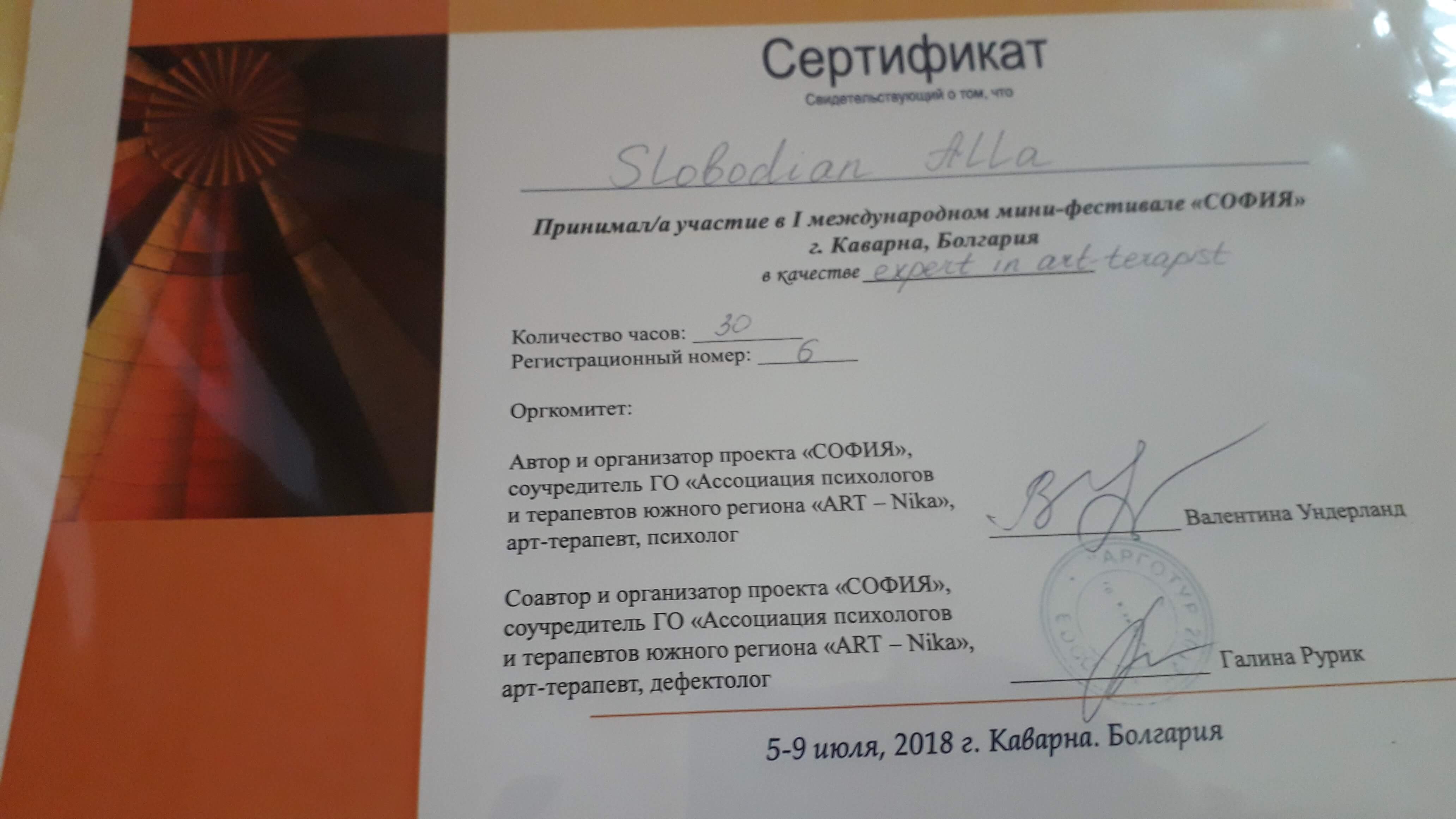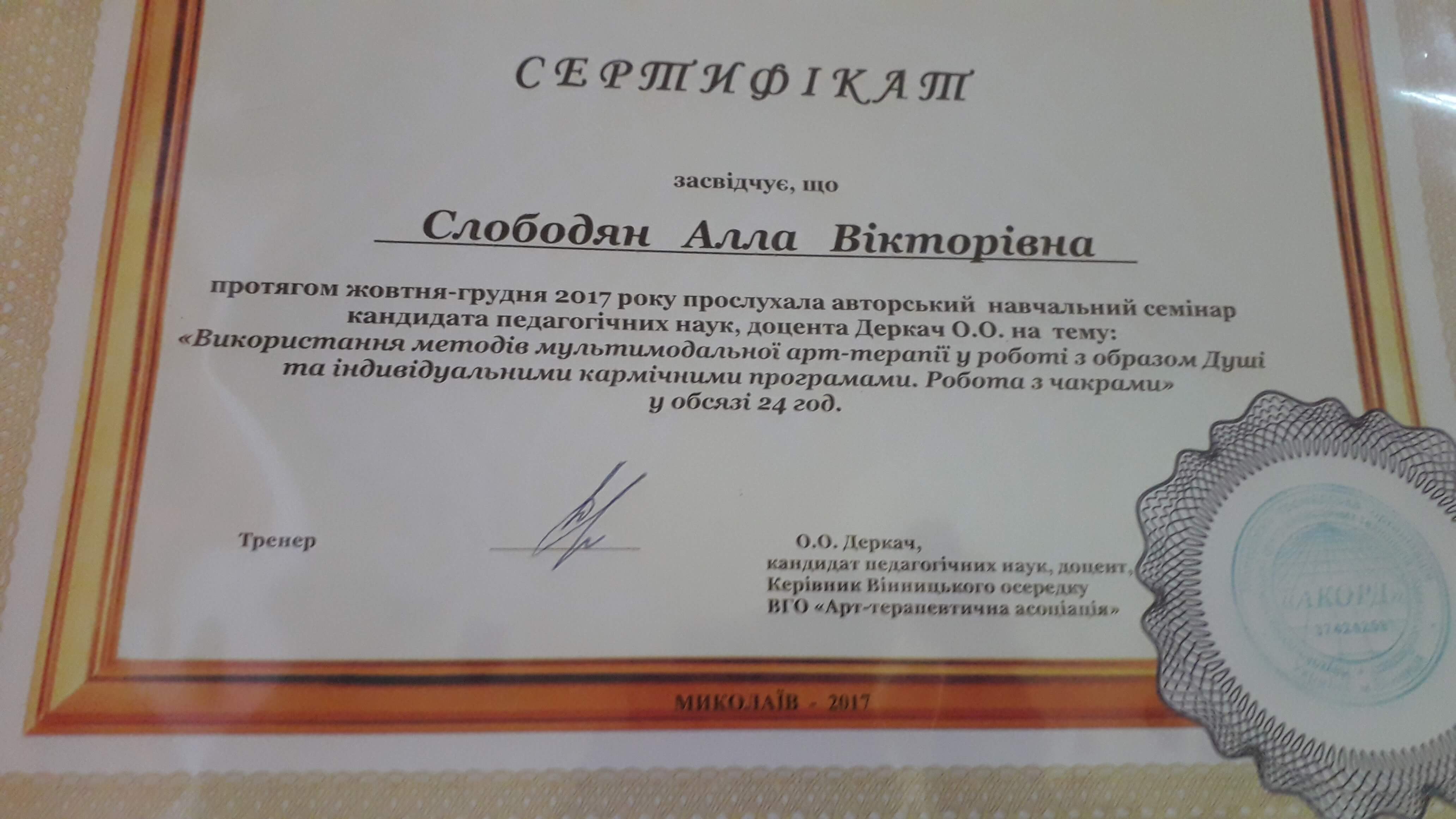 Николаевский государственый университет имени В.О. Сухомлинського, получила высшее образование по специальности "психология" и получила квалификацию практического психолога. Являюсь членом "Национальной психологической асоциации Украины" и членом " АРТ- терррапевтичной асоциации"